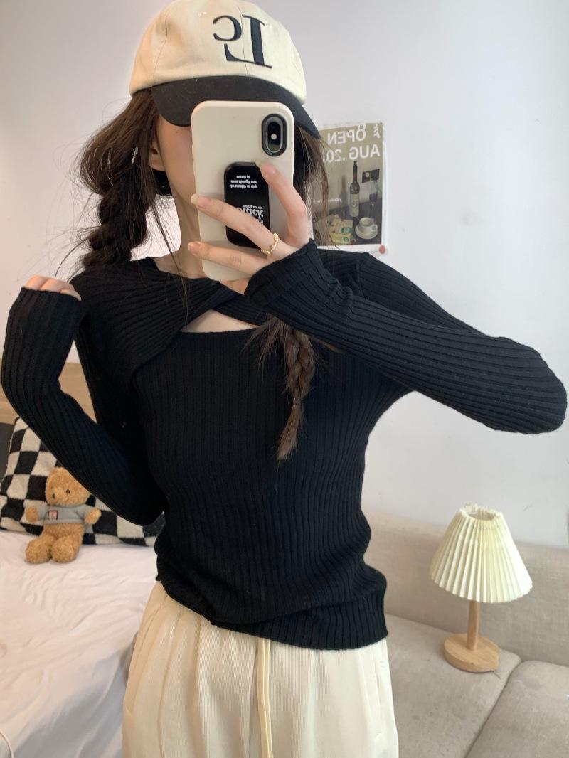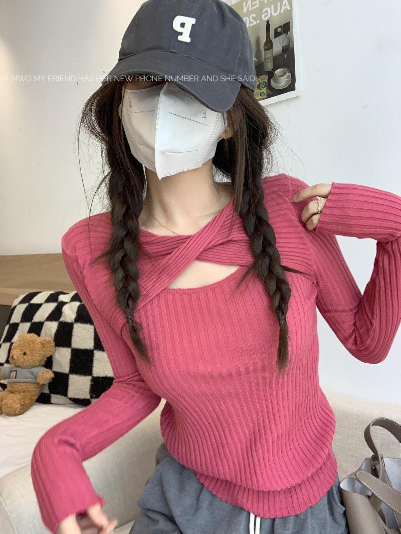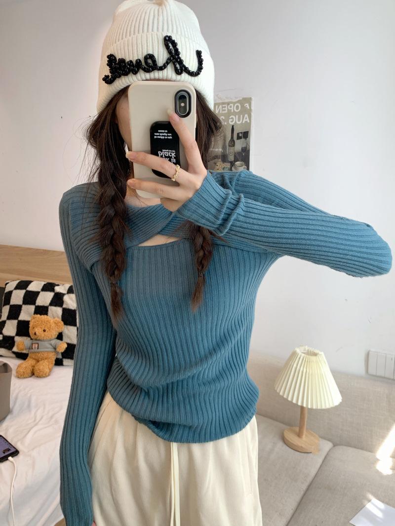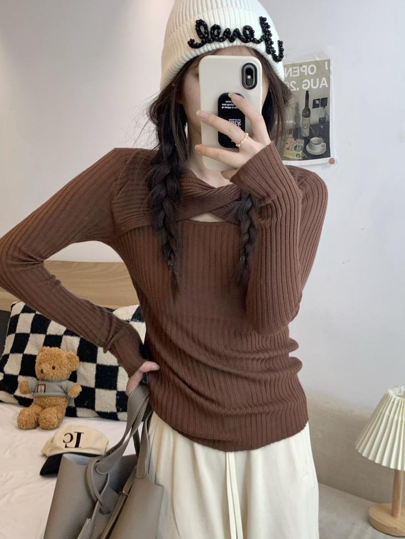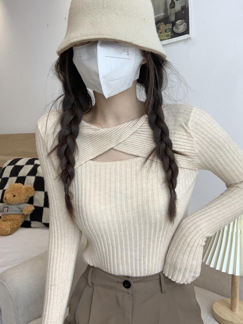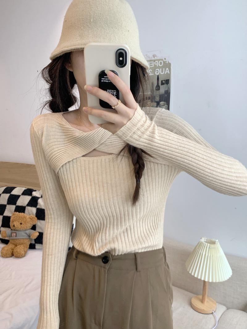 Suéter de Mujer Calado Manga Larga Tejido de Punto Otoño Invierno 2025 Nuevo Adelgazante Elástico Capa Base Interior