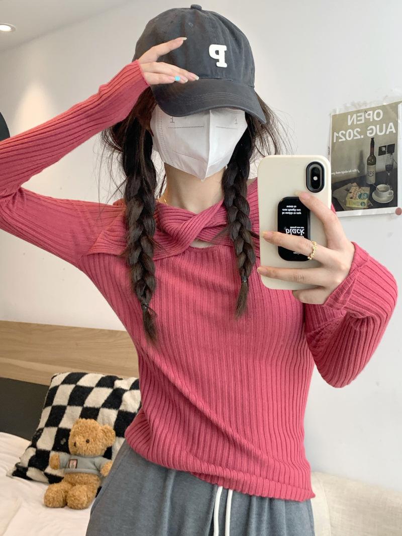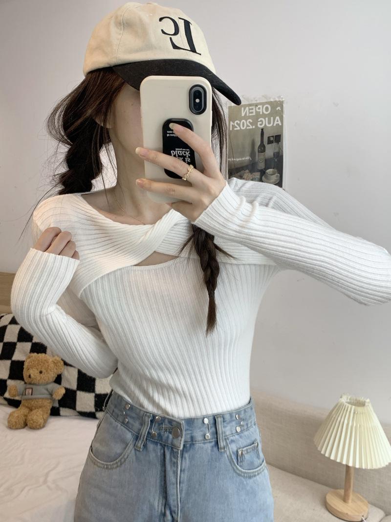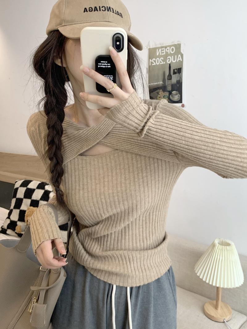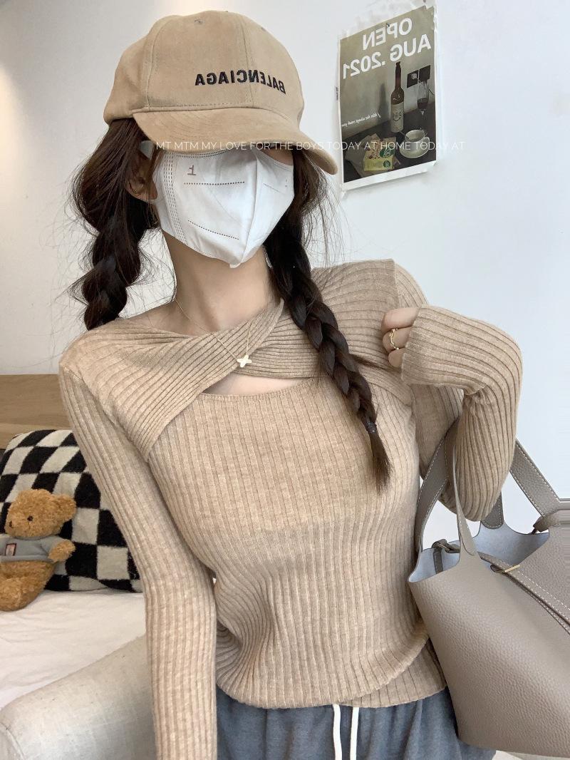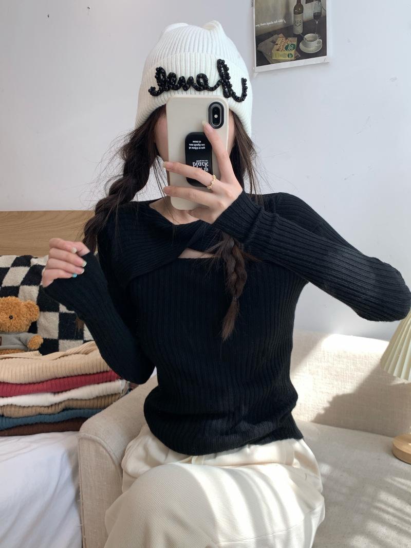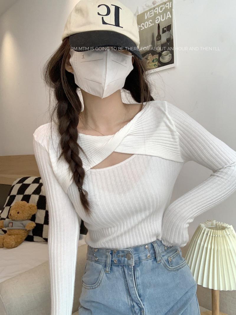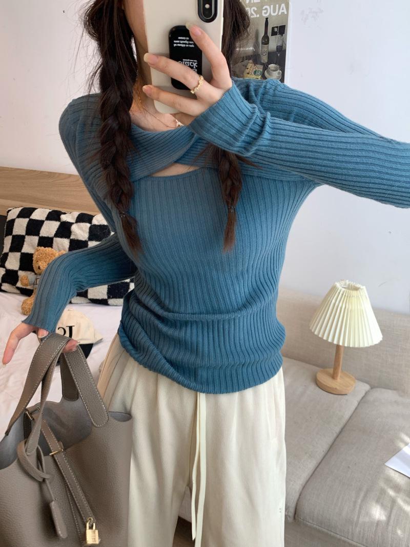 Suéter de Mujer Calado Manga Larga Tejido de Punto Otoño Invierno 2025 Nuevo Adelgazante Elástico Capa Base Interior