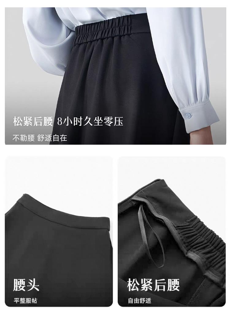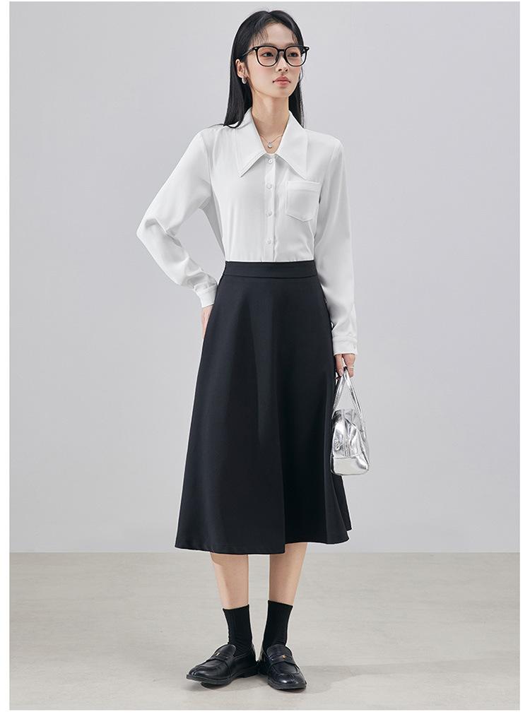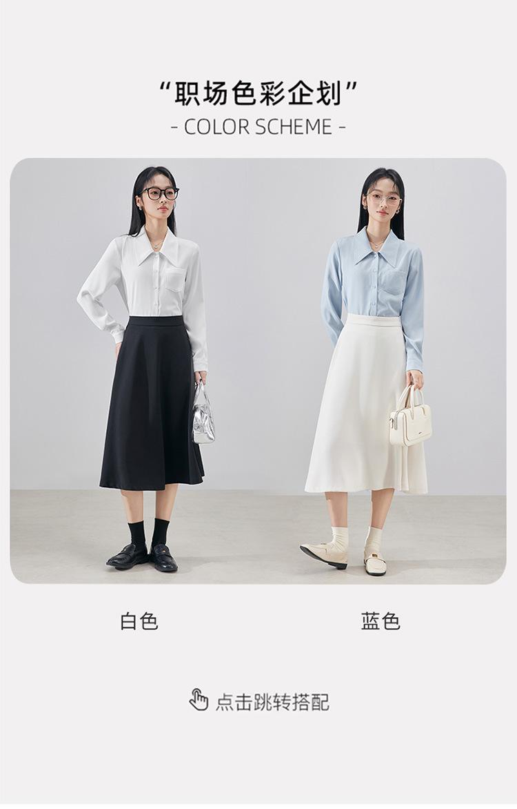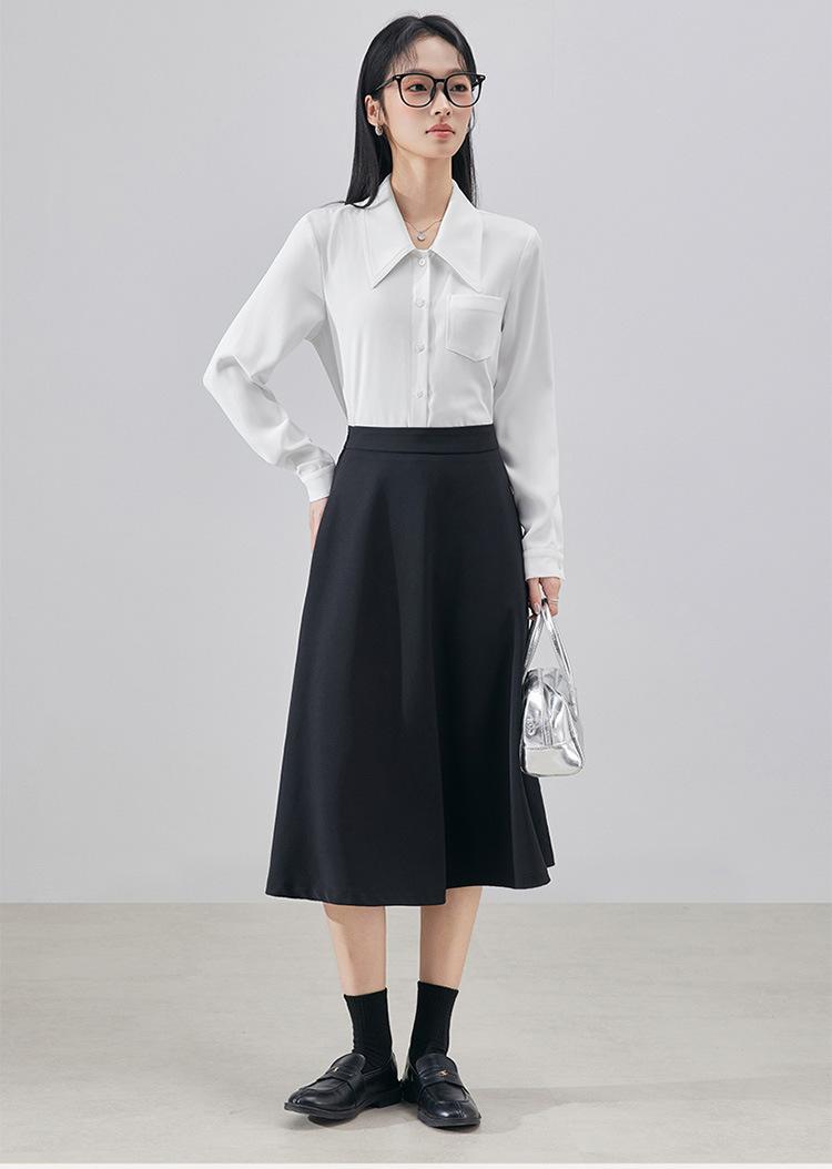 White shirt, Blue Shirt, black A-line skirt, apricot A-line skirt