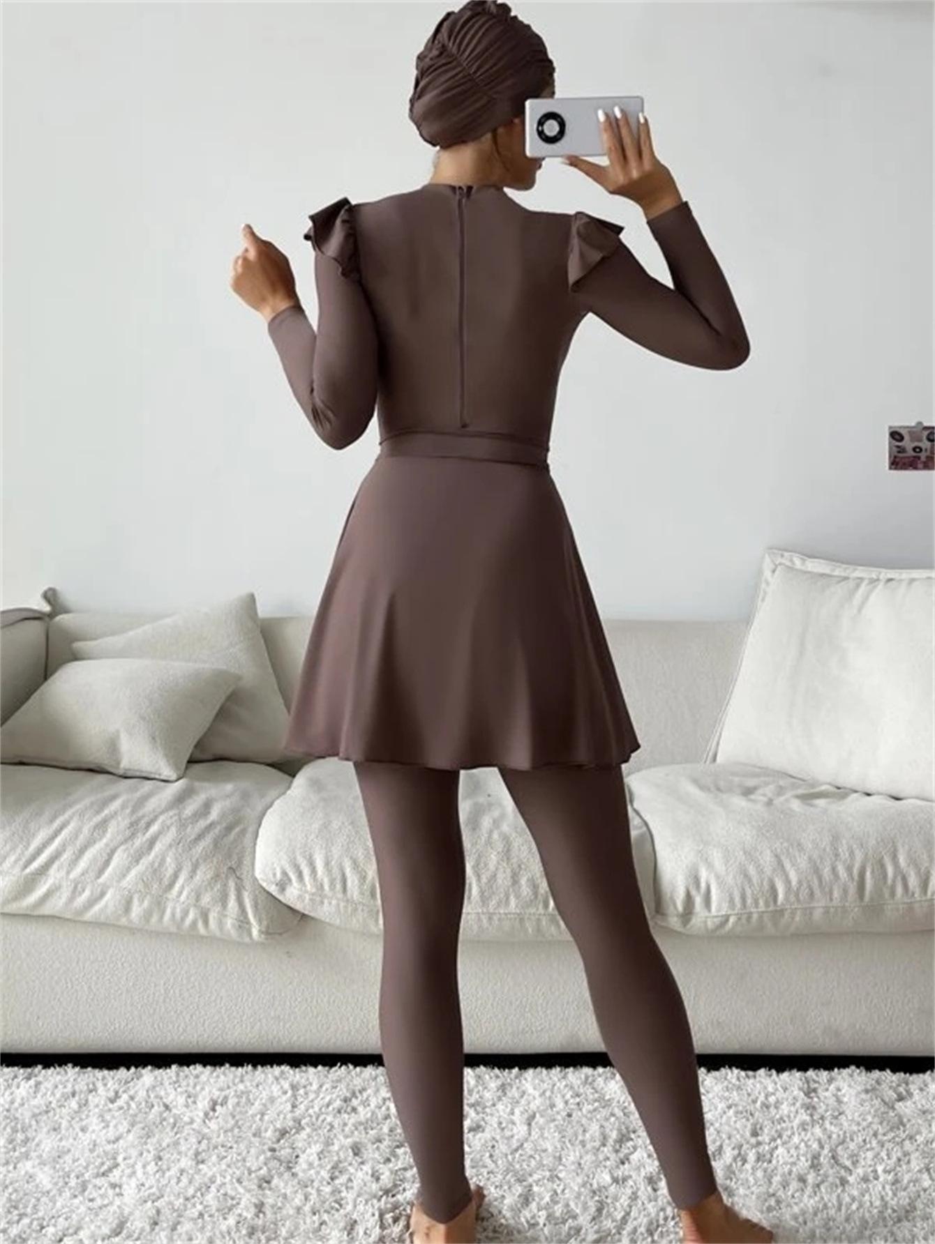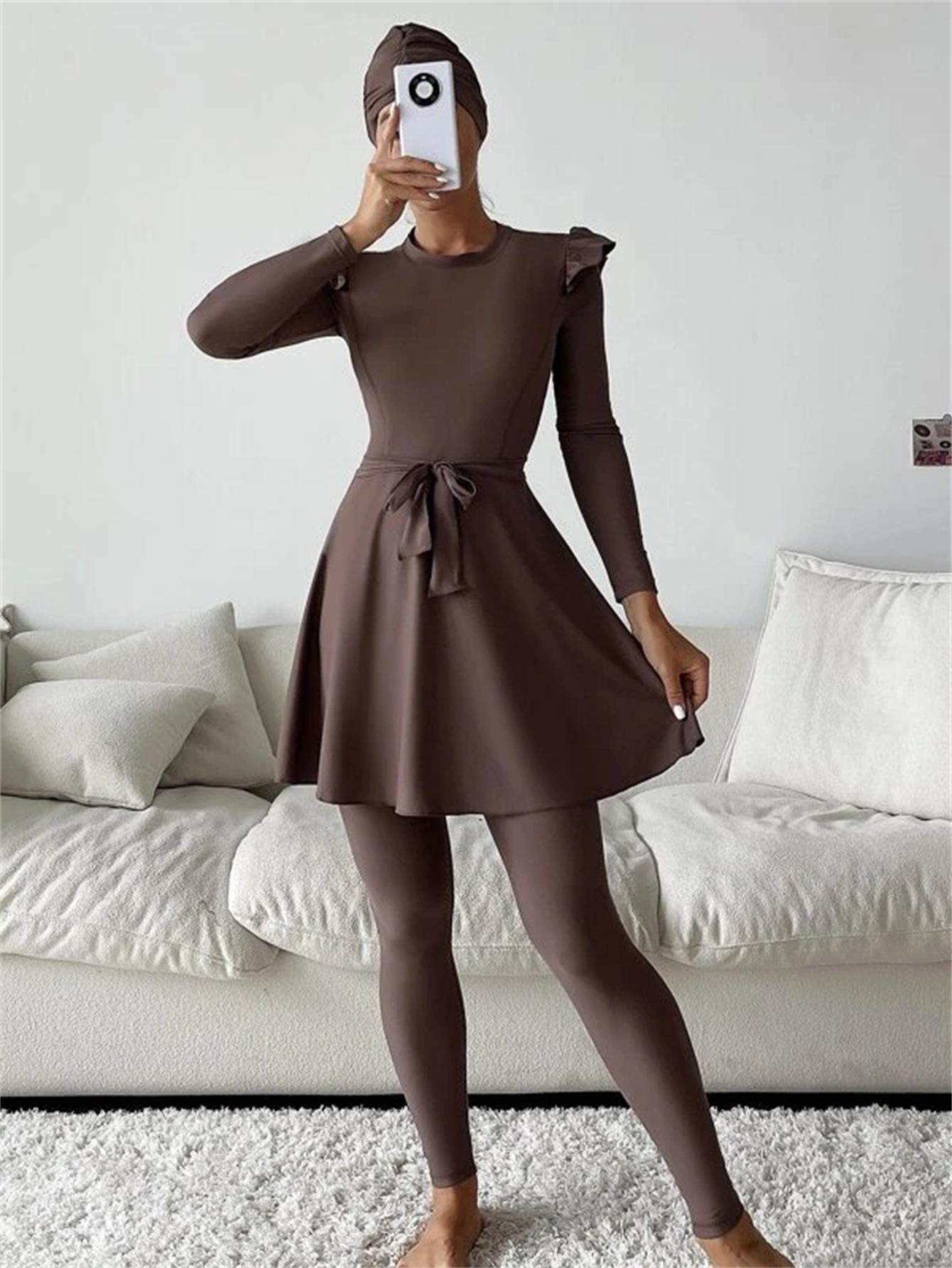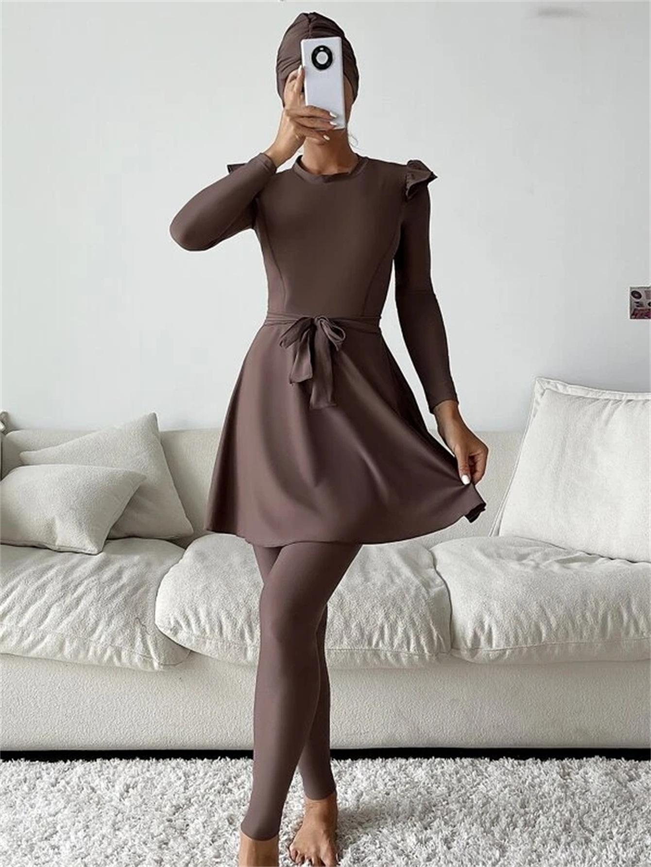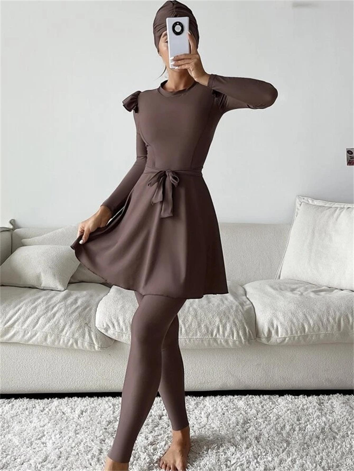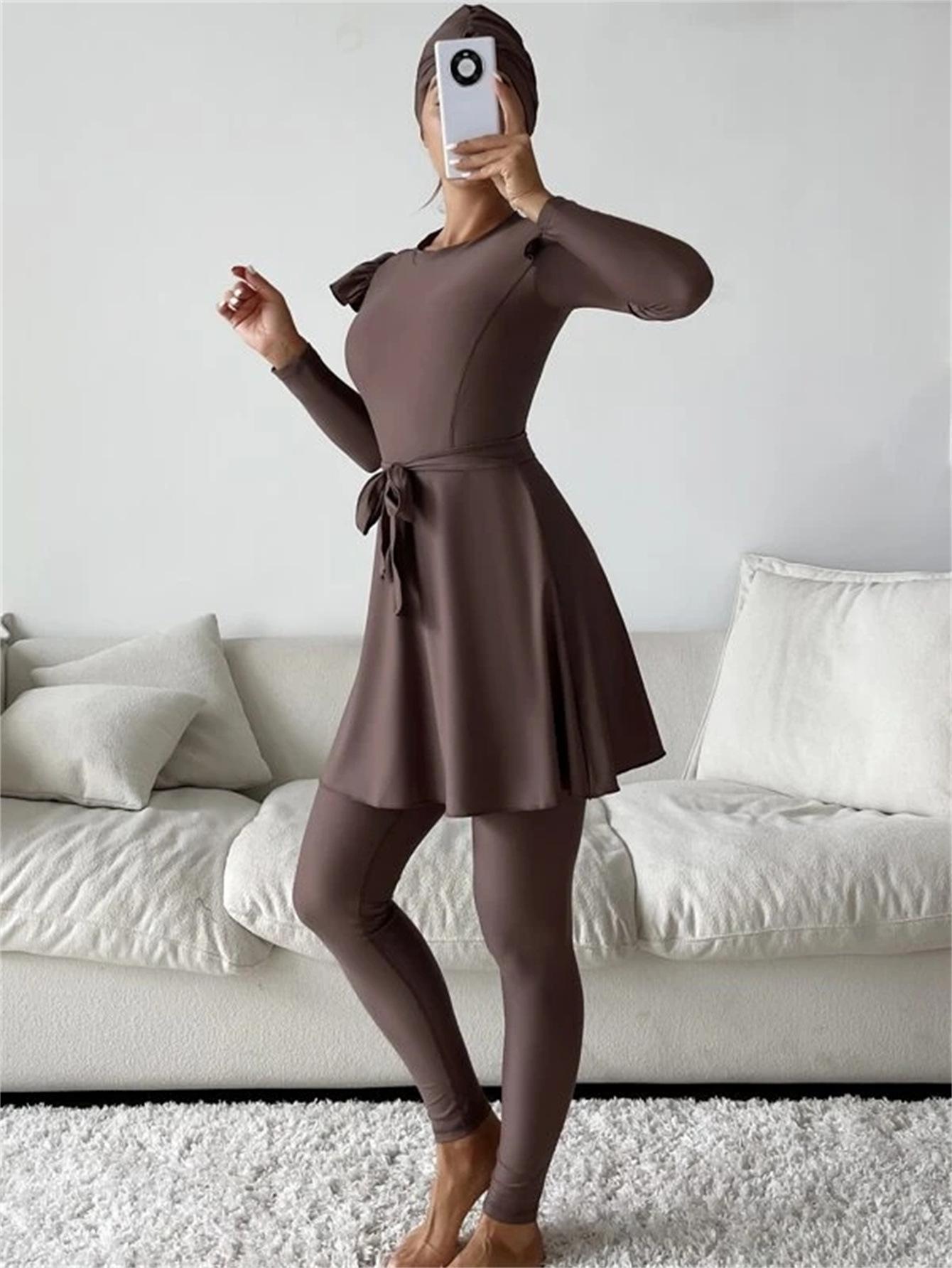 Traje de baño musulmán para mujer de color sólido transfronterizo, nuevo conjunto de tres o cuatro piezas con cinturón transfronterizo, conservador de manga larga y pantalones, traje de baño para vacaciones