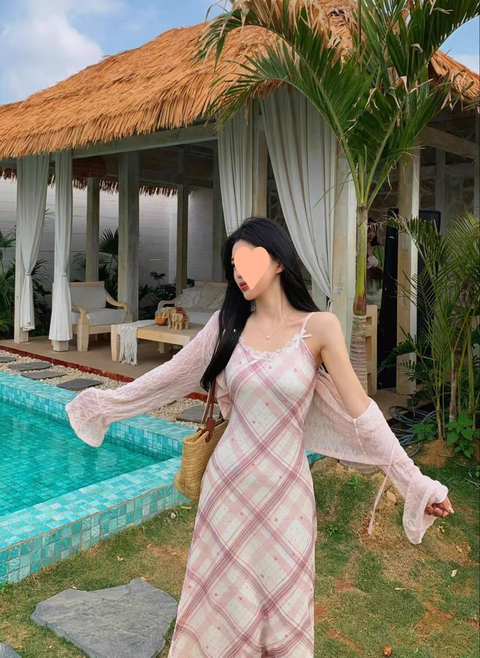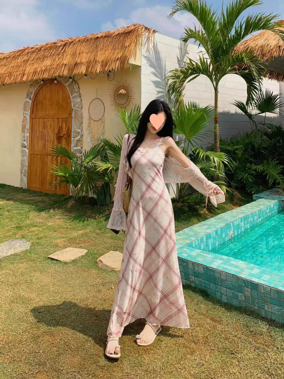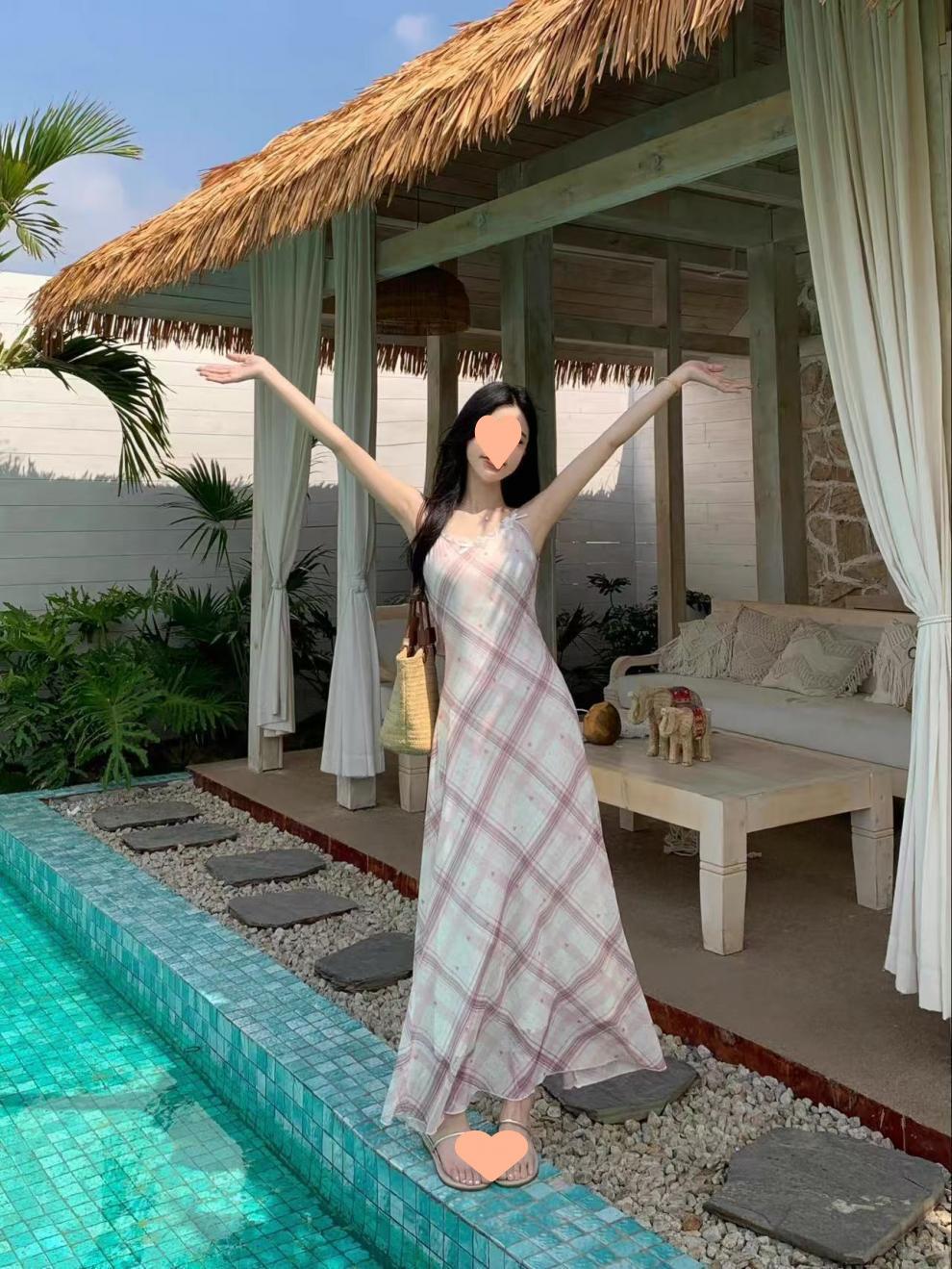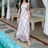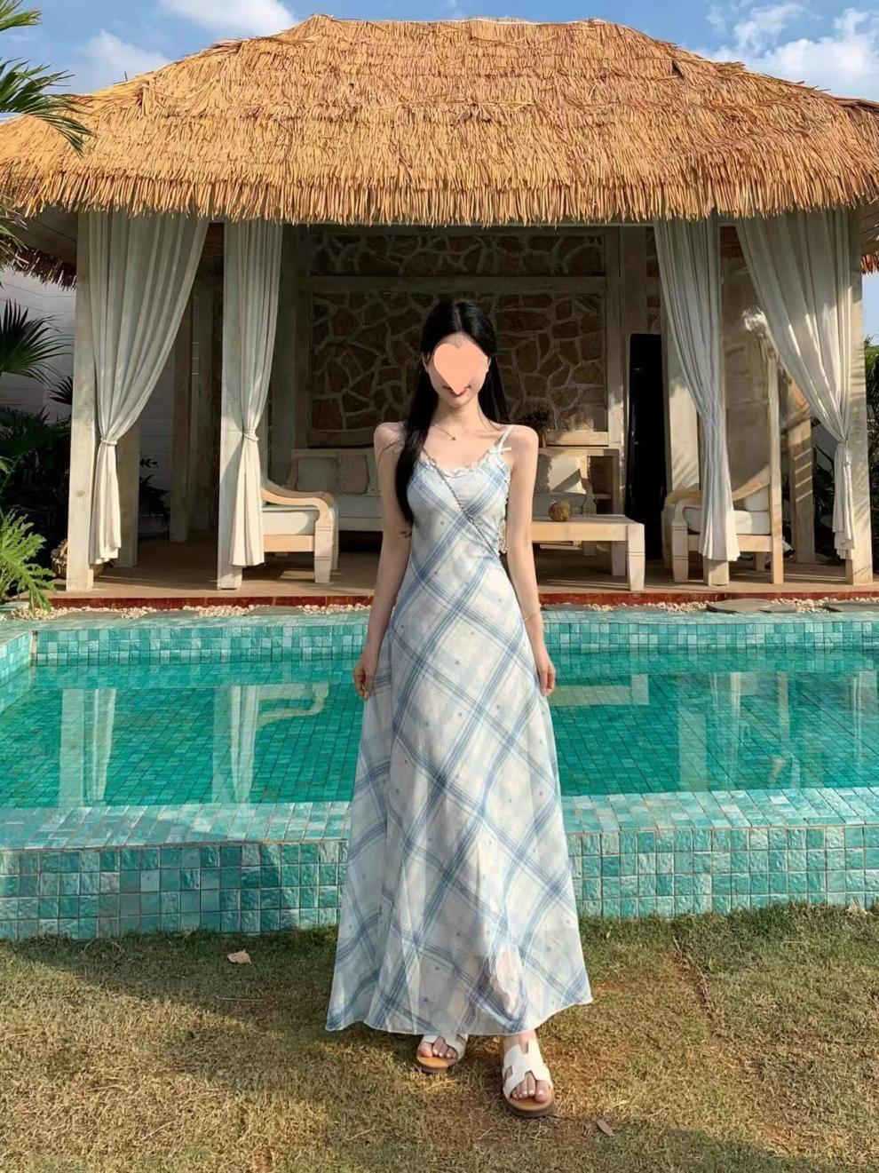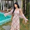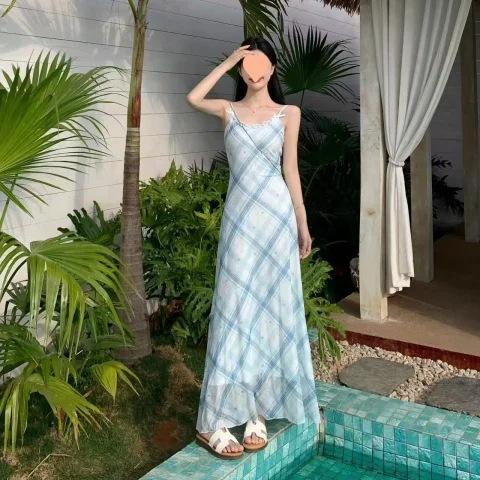 2025 Nuevo Verano Estilo Coreano Vestido de Tirantes a Rayas con Encaje y Lazo Cintura Alta Línea A Falda Larga