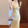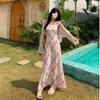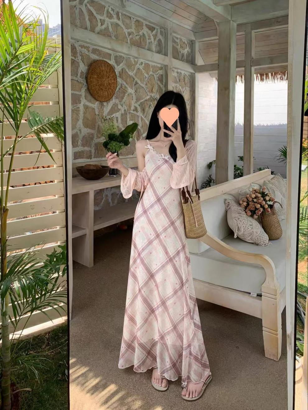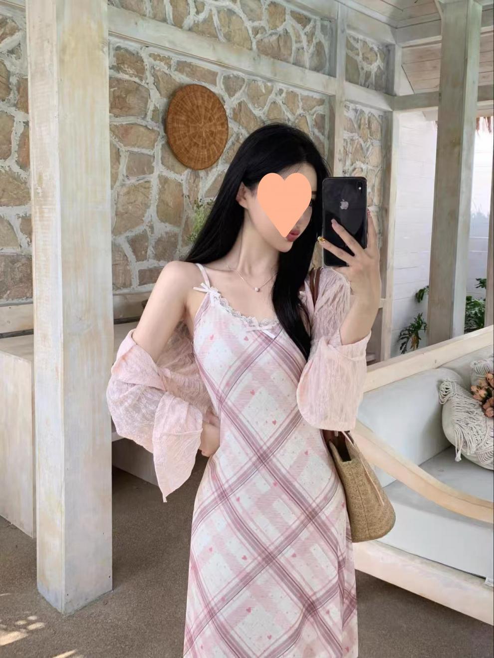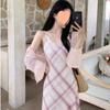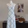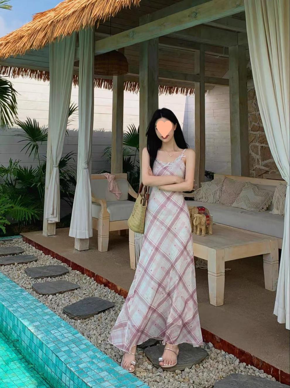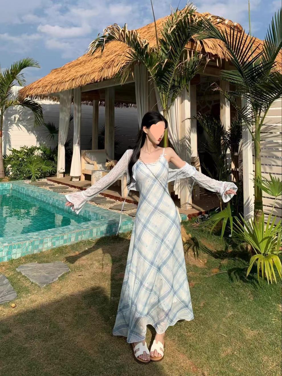 2025 Nuevo Verano Estilo Coreano Vestido de Tirantes a Rayas con Encaje y Lazo Cintura Alta Línea A Falda Larga