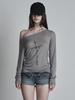 Camiseta Americana Retro con Estampado de Cruz de Manga Larga Otoño 2025 Cuello Inclinado Hombro Descubierto Sexy Holgada Ligera Top