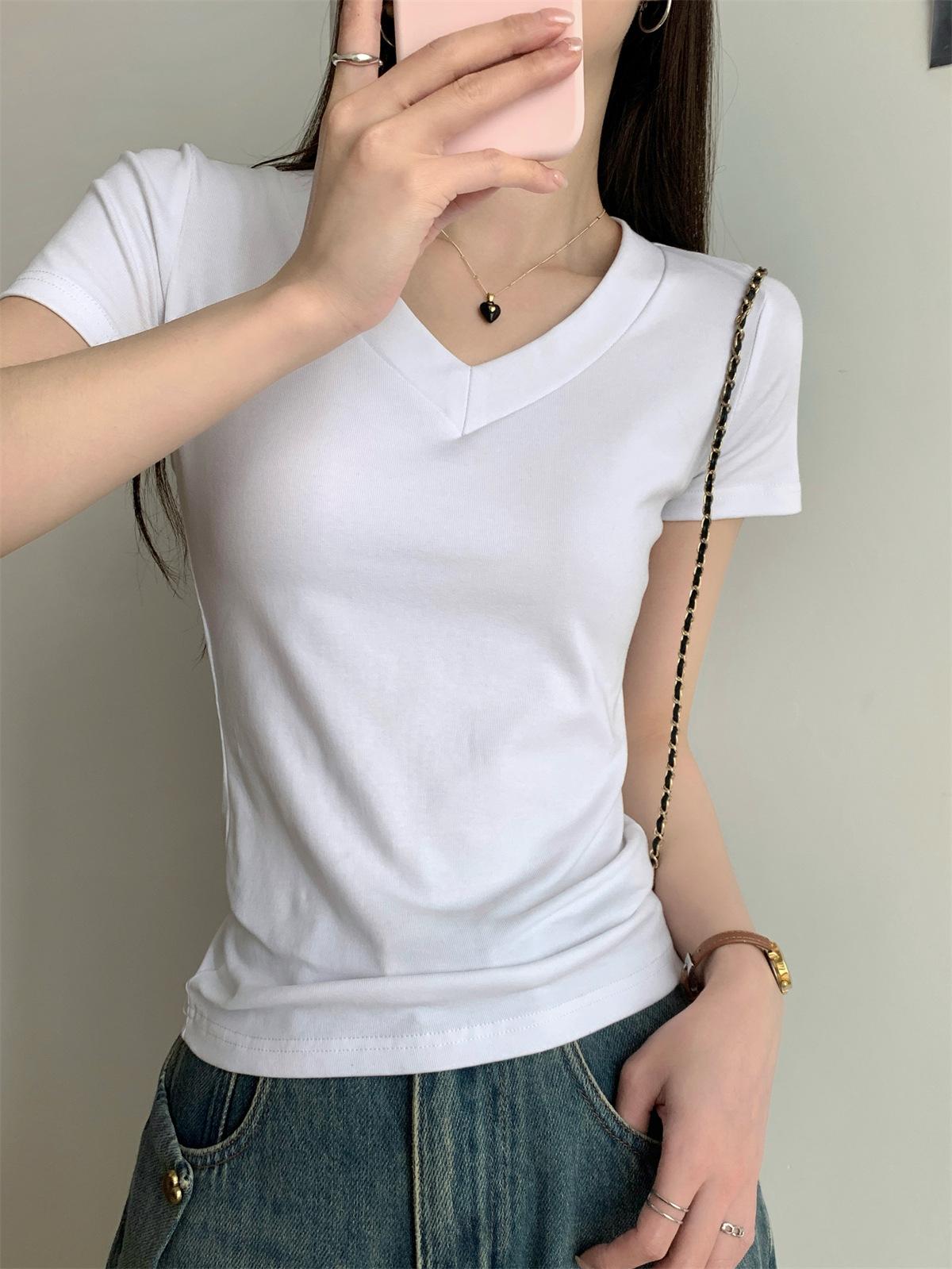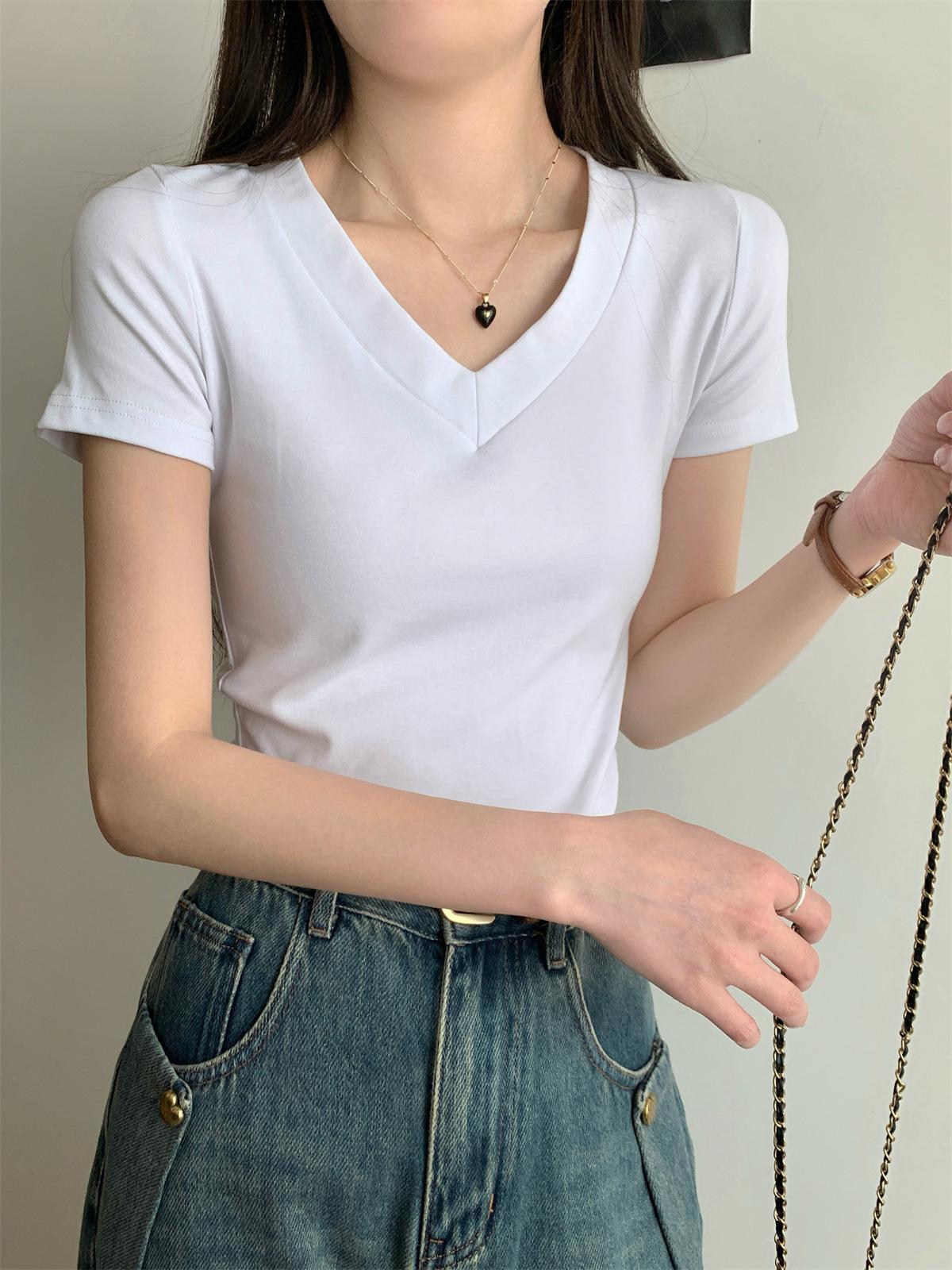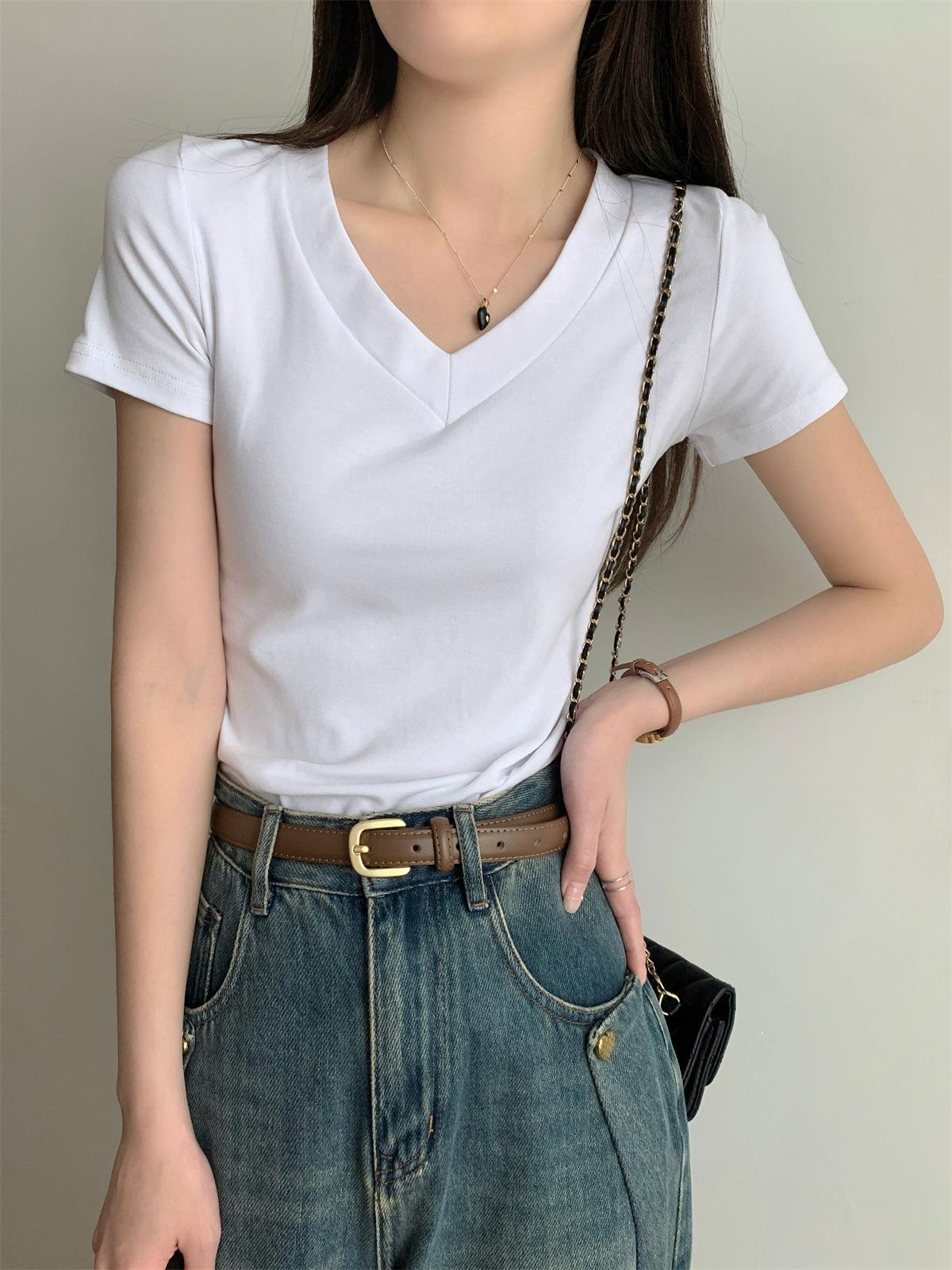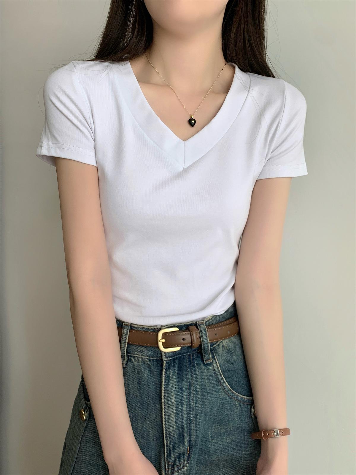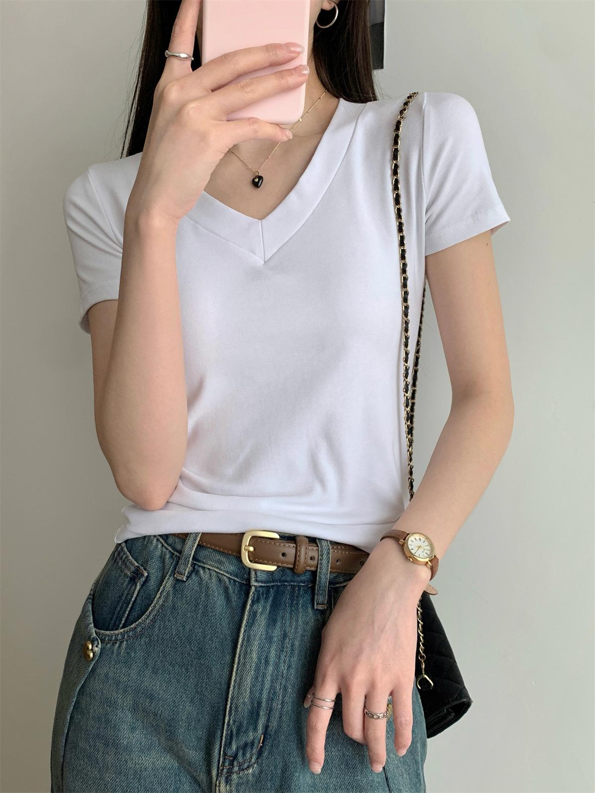 Playera Casual de Color Puro con Cuello en V y Manga Corta para el Hombro Derecho para Mujer Verano 2024 Nuevo Look Adelgazante Top Básico de Estudiante