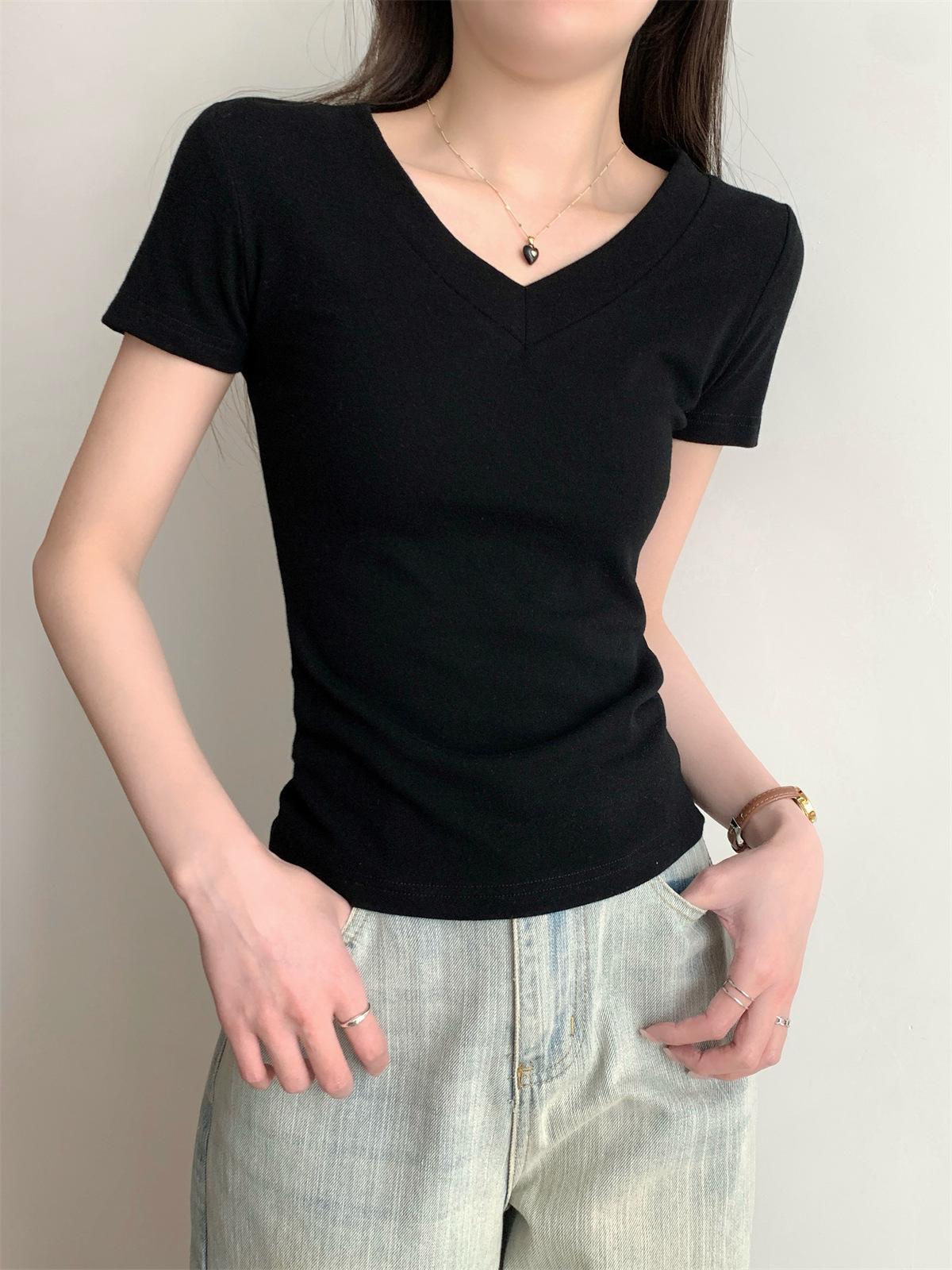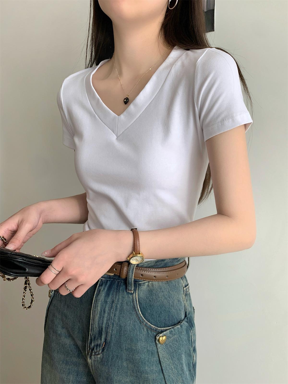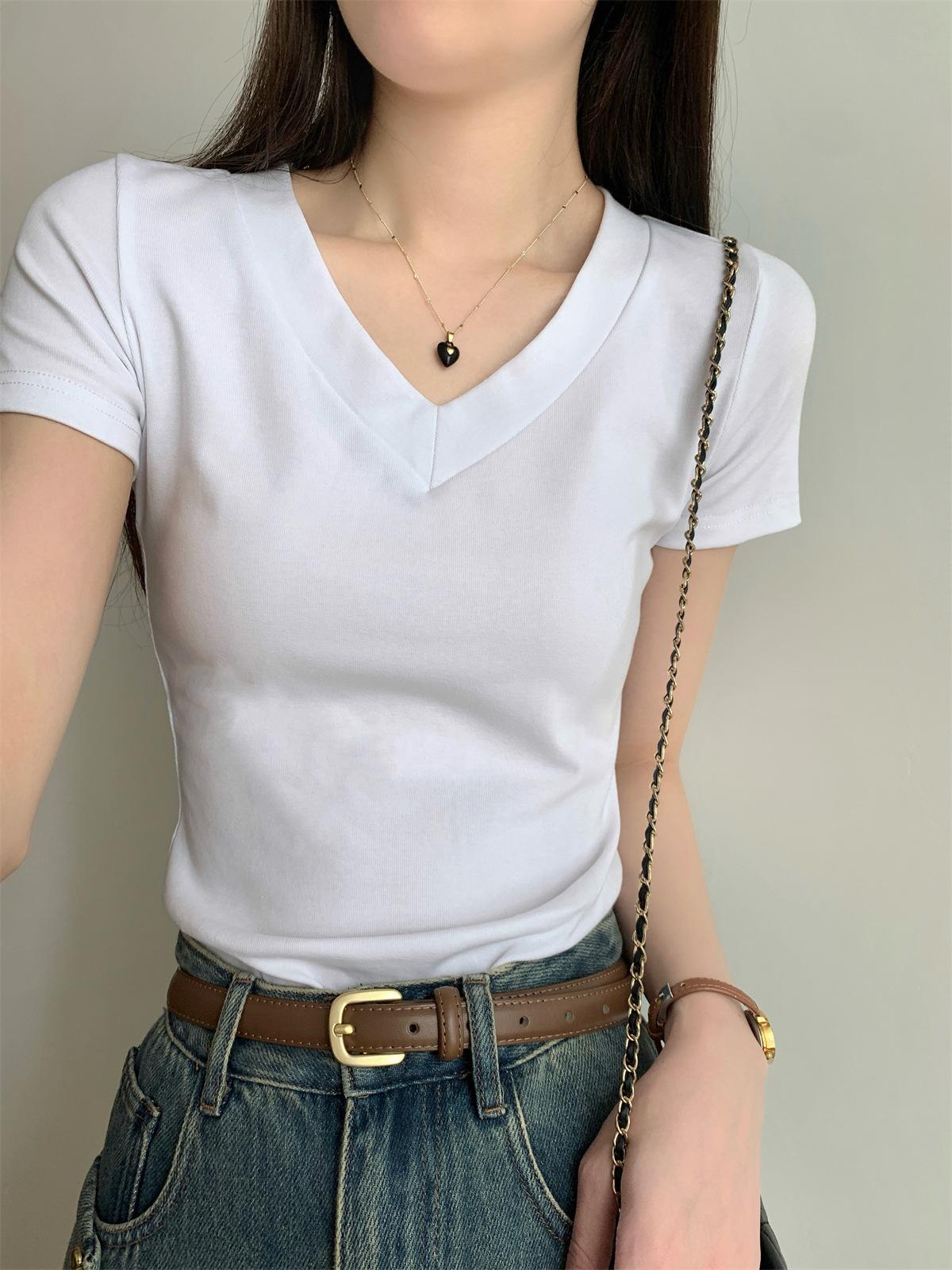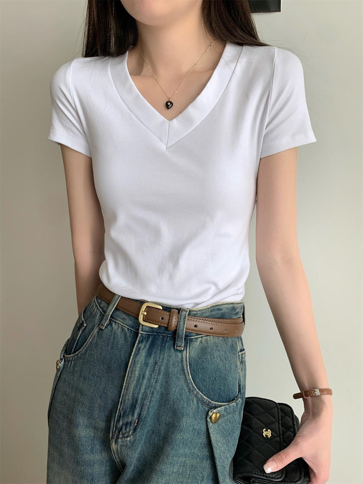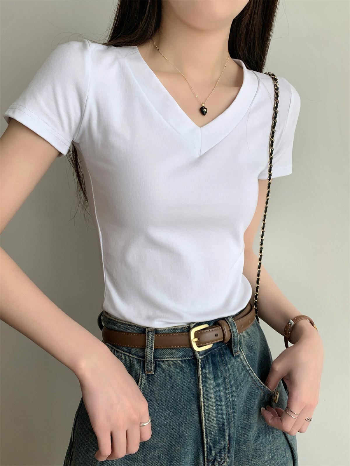 Playera Casual de Color Puro con Cuello en V y Manga Corta para el Hombro Derecho para Mujer Verano 2024 Nuevo Look Adelgazante Top Básico de Estudiante