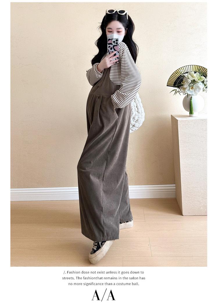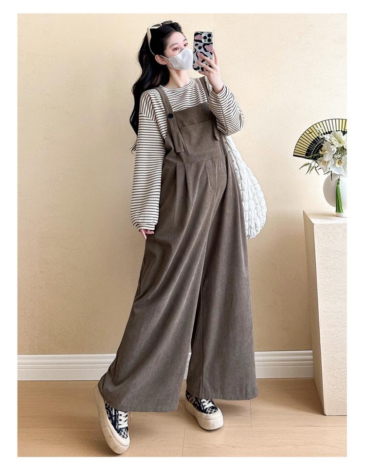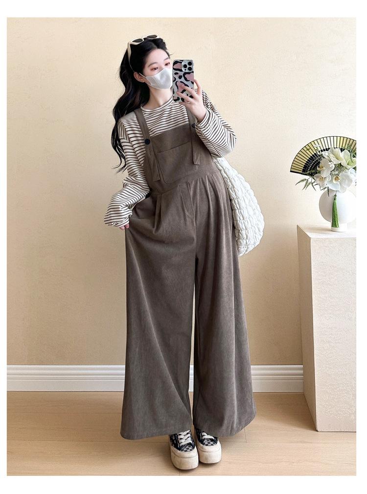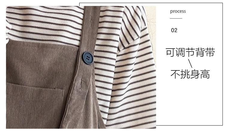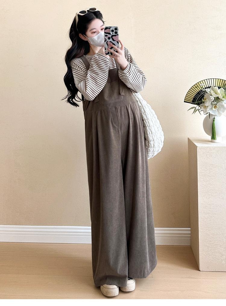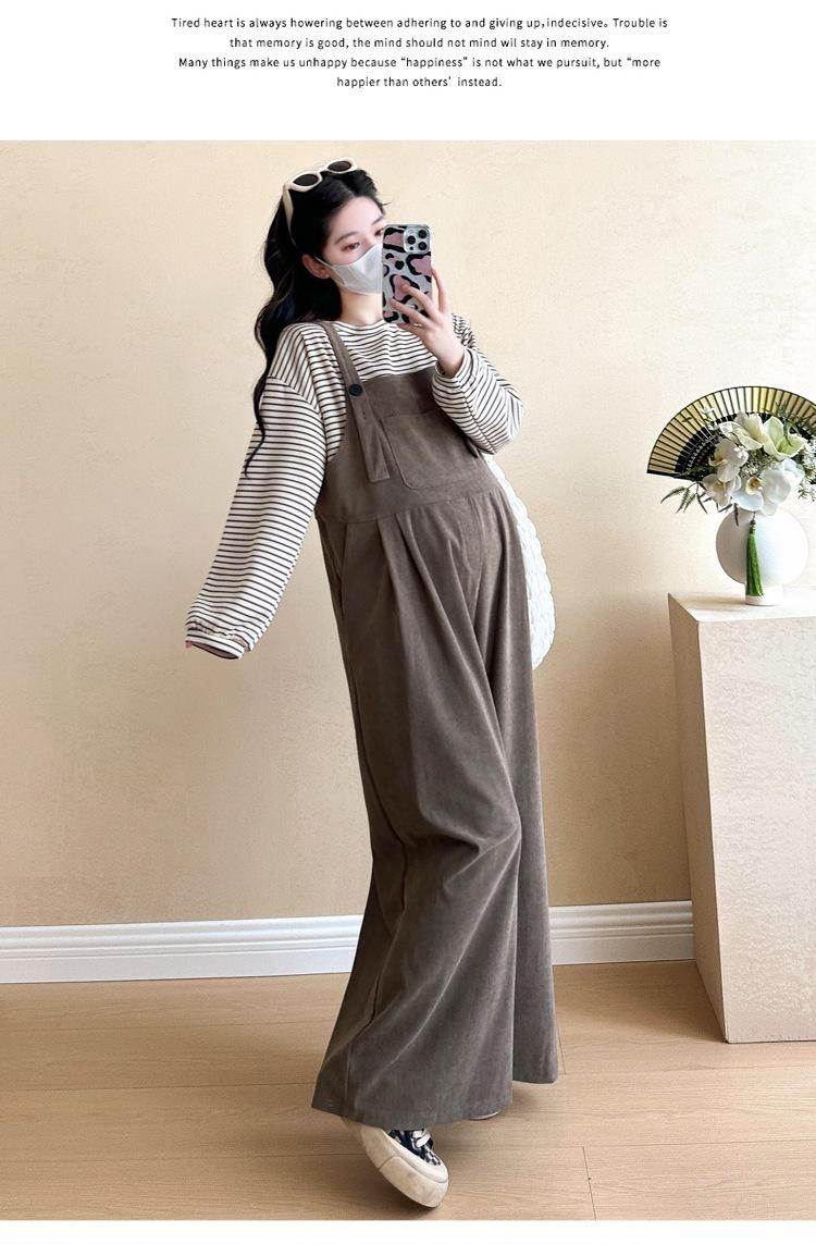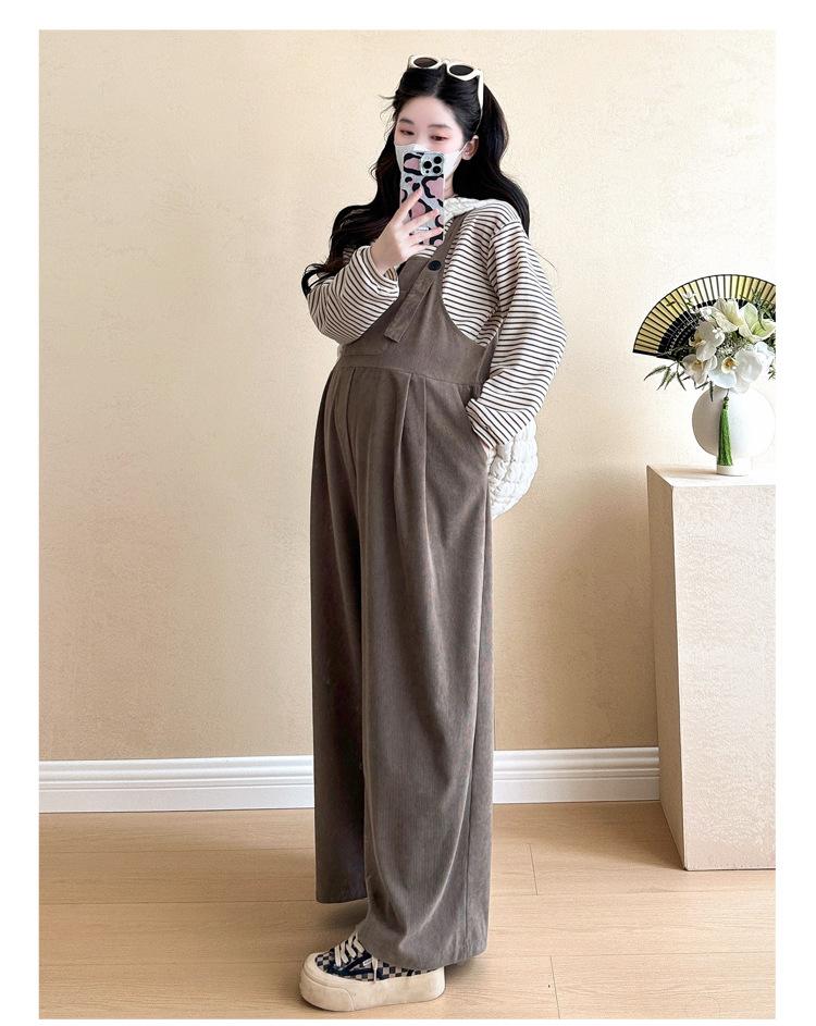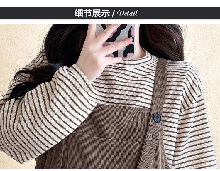 Overol de pana para otoño e invierno + Camiseta de punto a rayas Conjunto de dos piezas Traje de maternidad