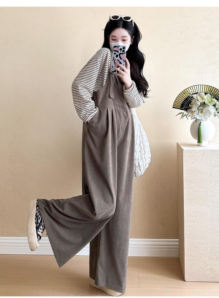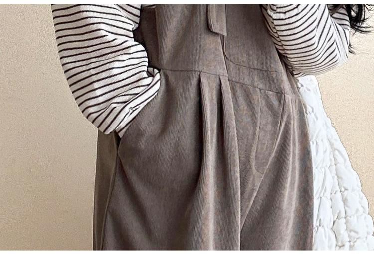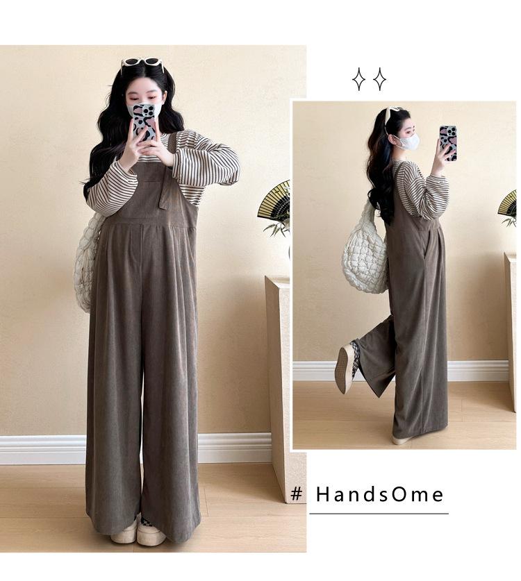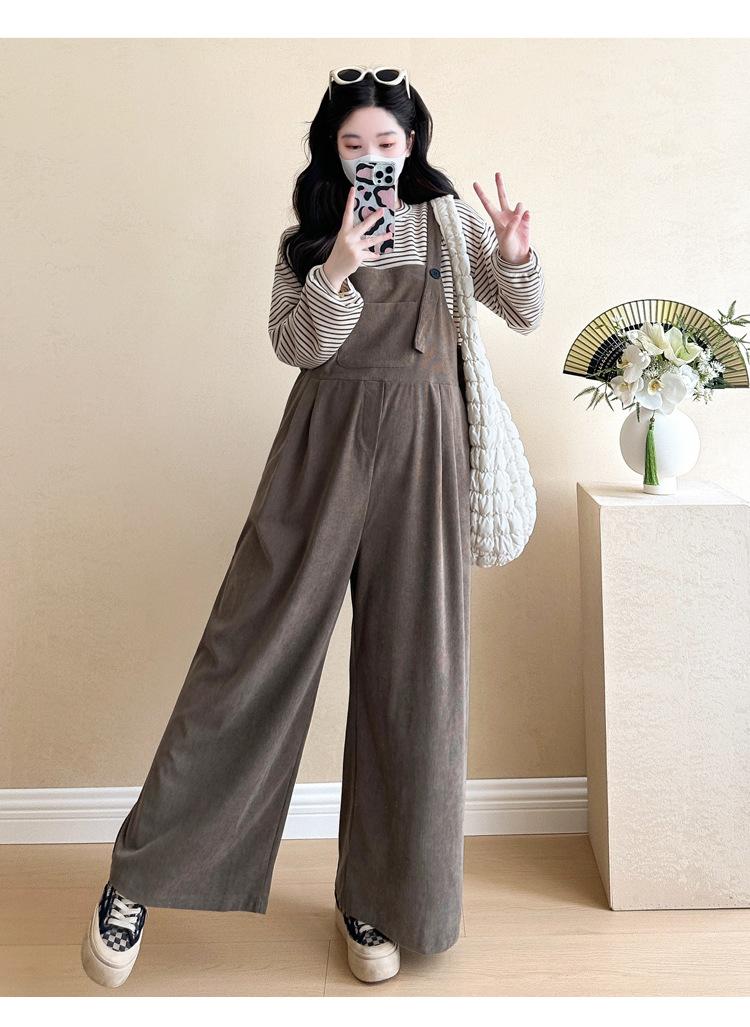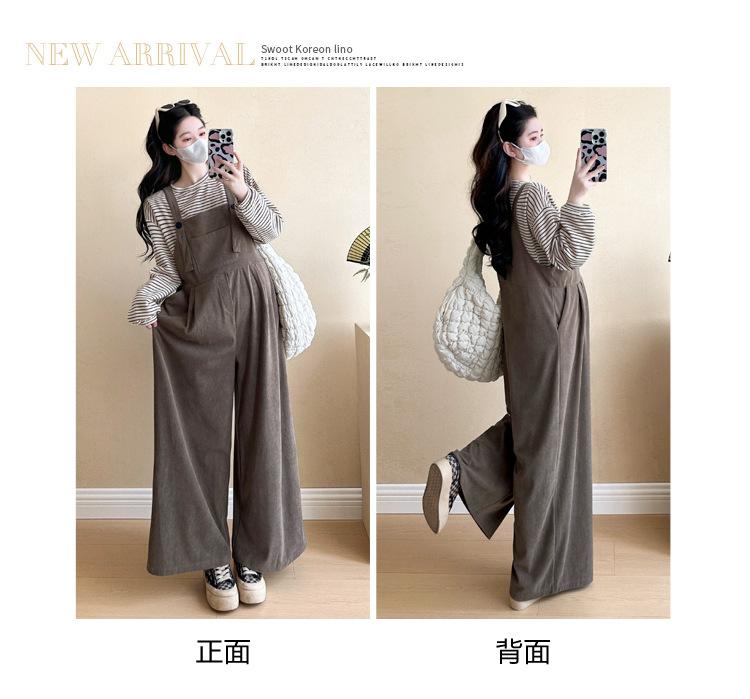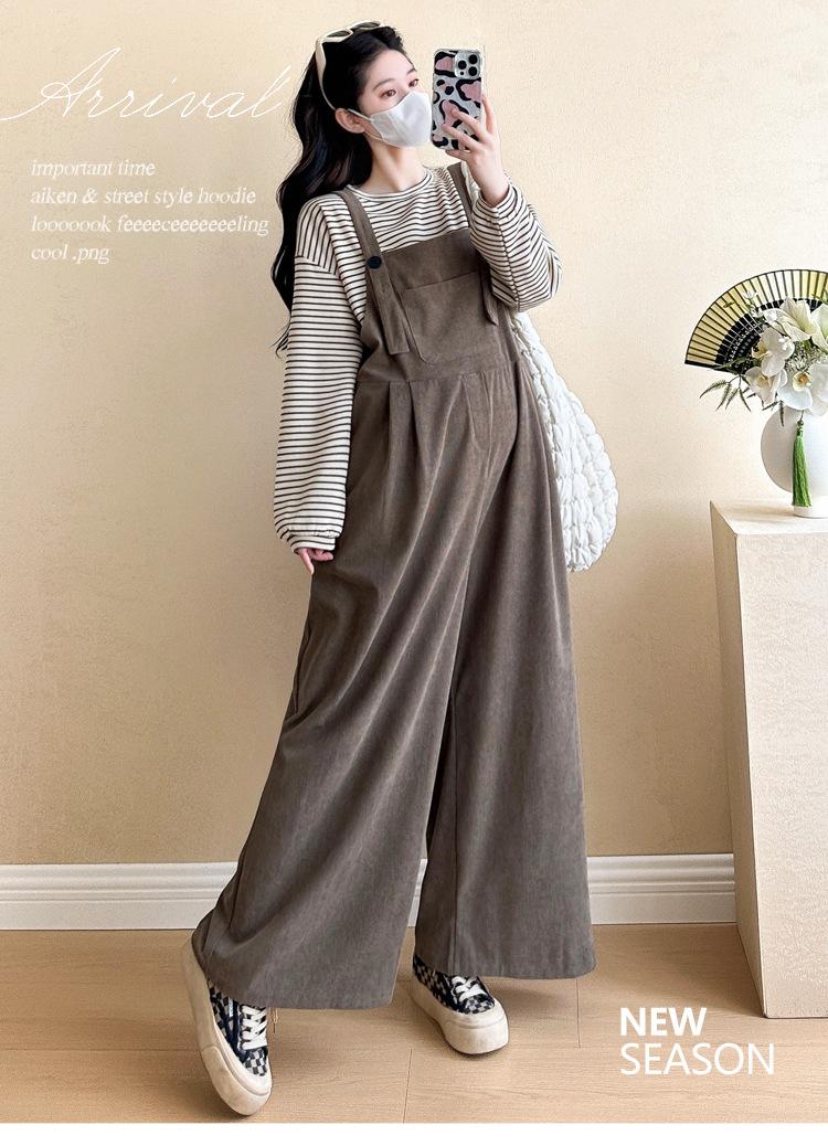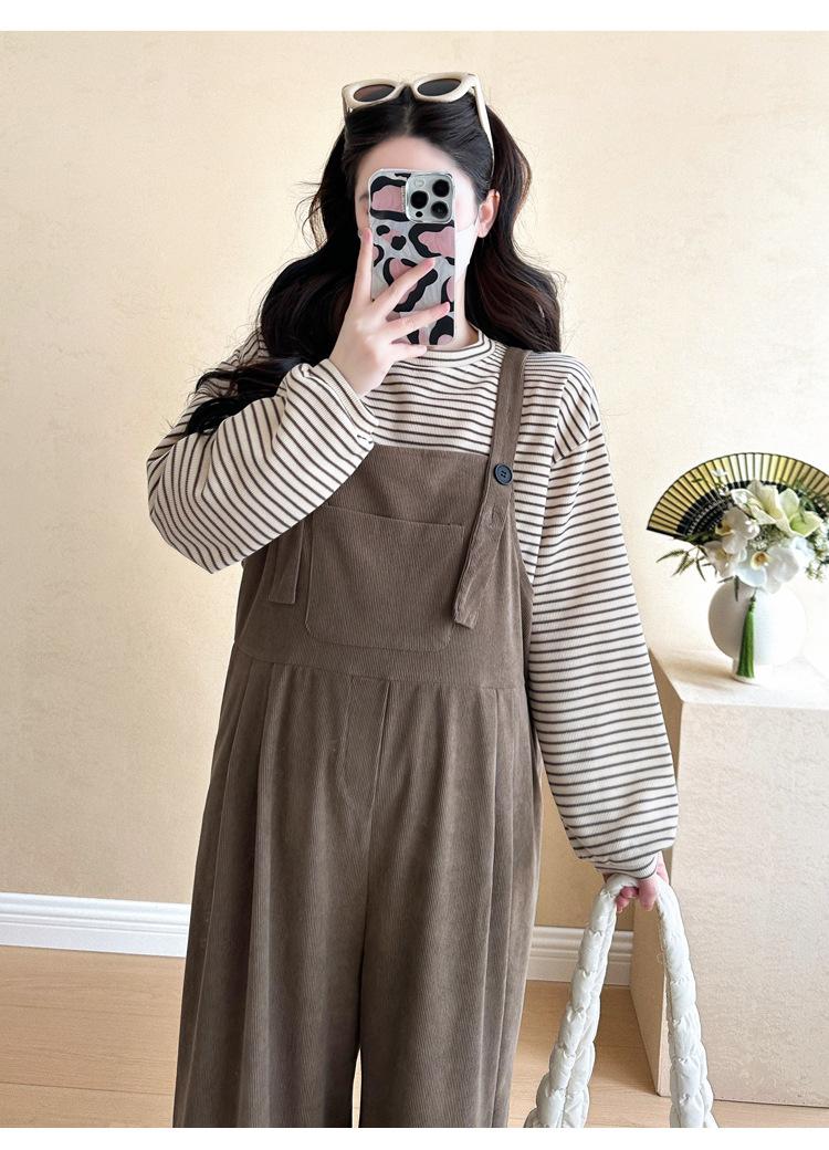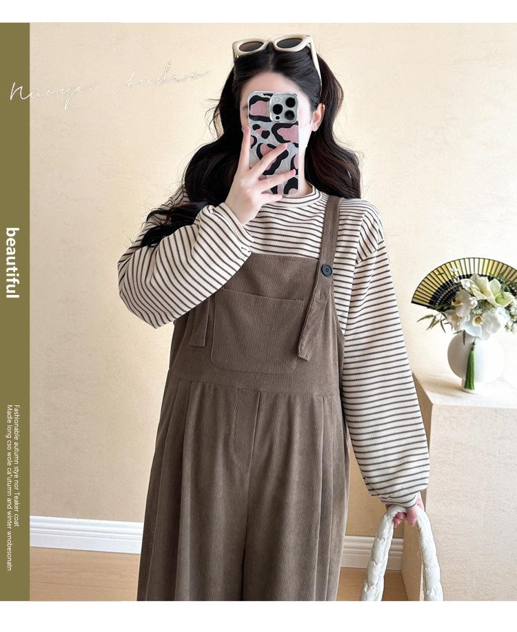 Overol de pana para otoño e invierno + Camiseta de punto a rayas Conjunto de dos piezas Traje de maternidad