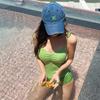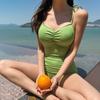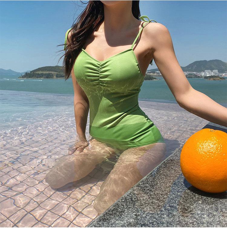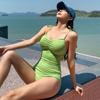 Traje de Baño Nuevo 2025 Sexy Ajustado Cubre Vientre Espalda Descubierta Push-Up Conservador Pequeño Fresco Verde Traje de Baño de Una Pieza para Mujer