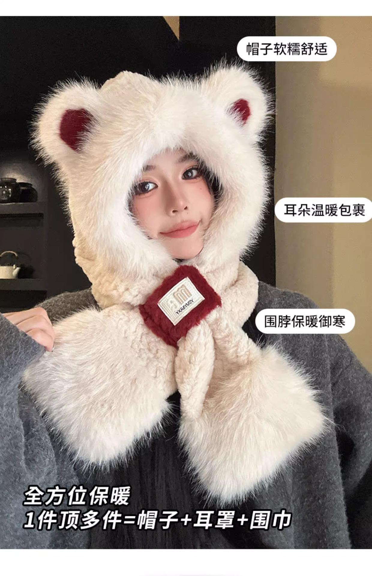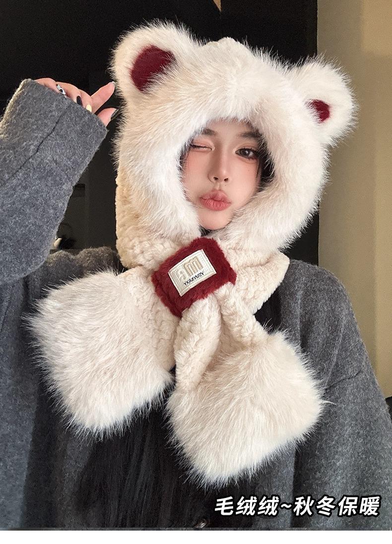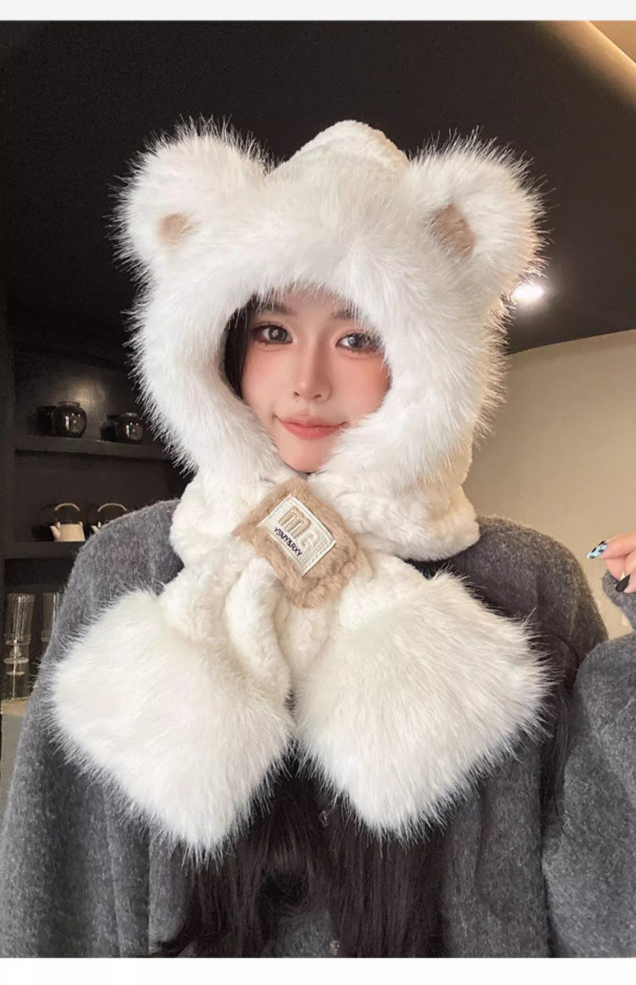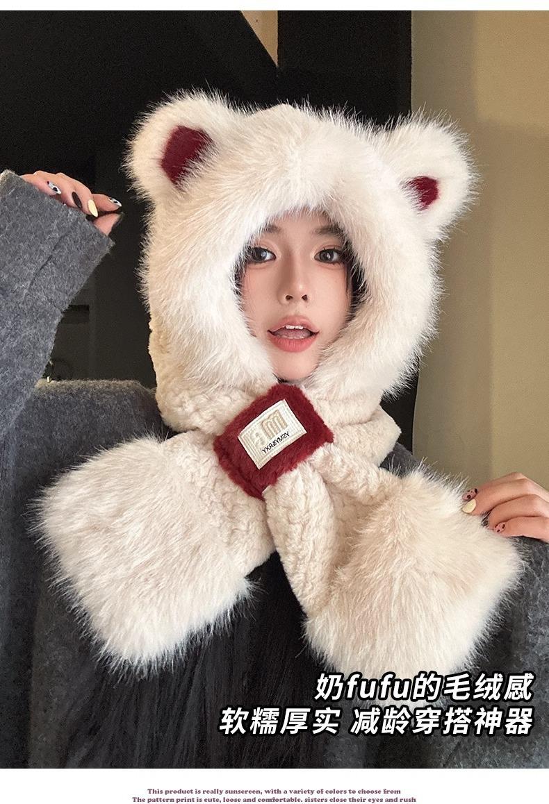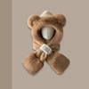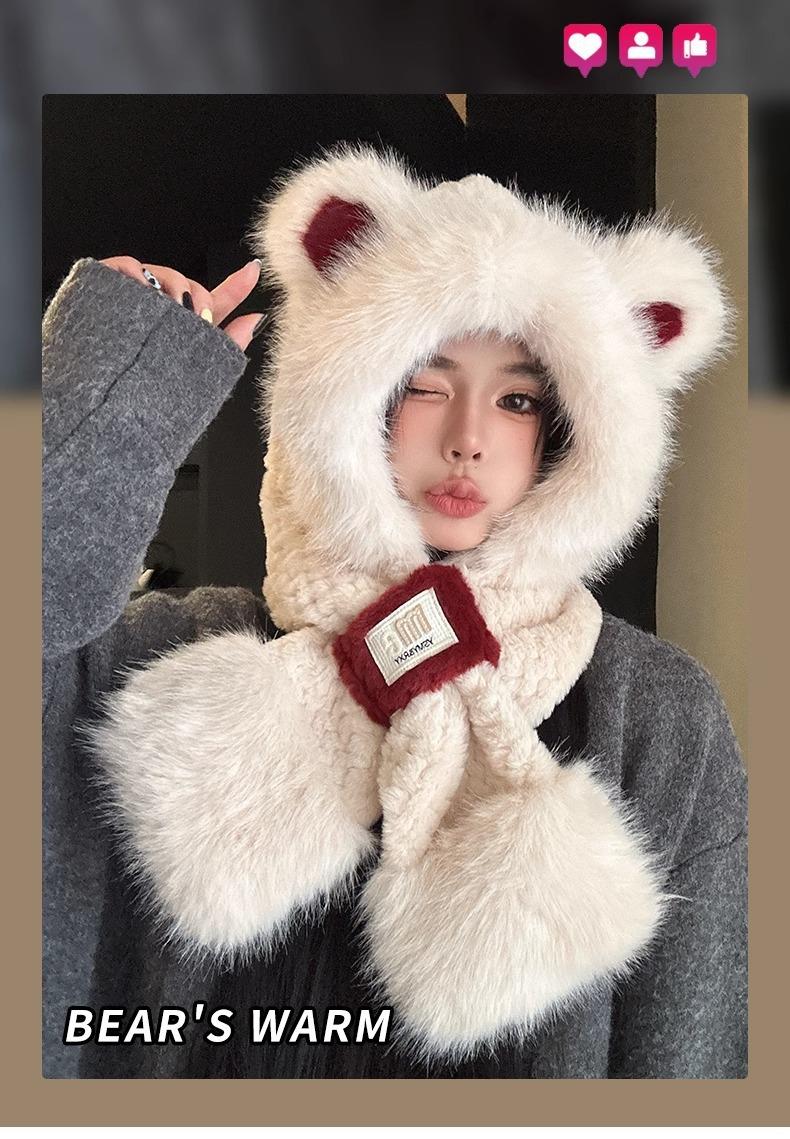 Lindo Gorro de Oso de Peluche Bufanda de Una Pieza para Mujer Estilo Coreano Invierno Cortavientos Cálido Protección para las Orejas para Montar Calentador de Cuello Gorro de Peluche