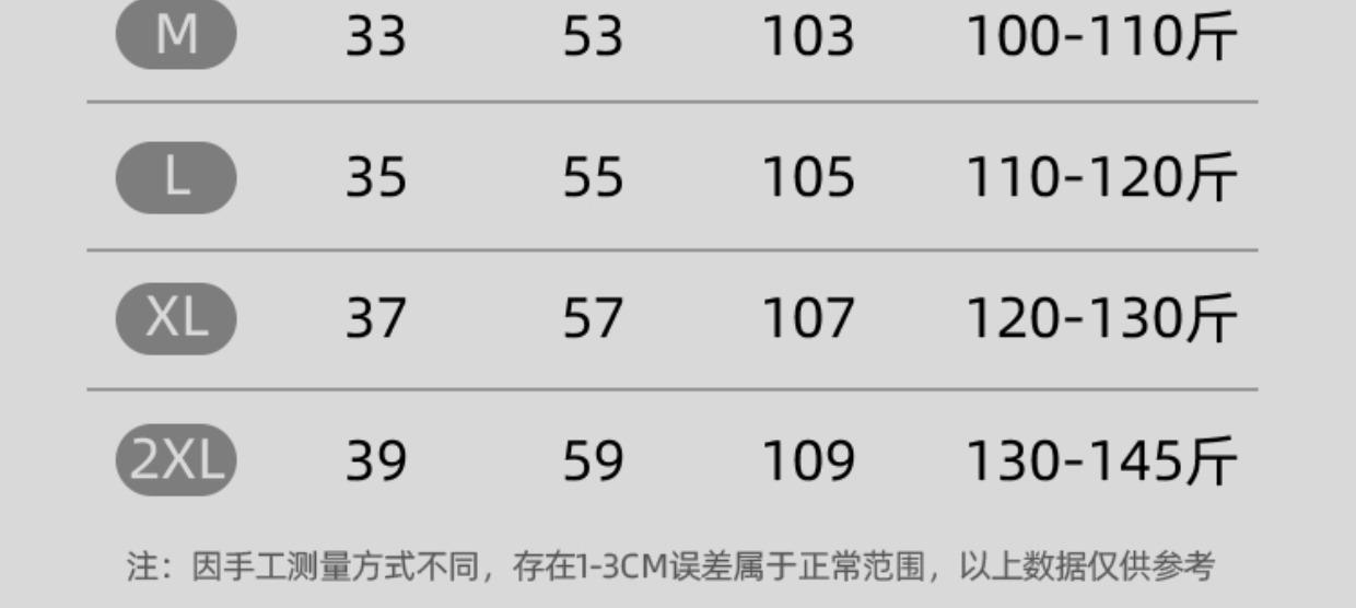 S 100 jin and below, M 100-115 catties, L 115-130 catties, XL 130-145 pounds, 2XL 145-160 catties