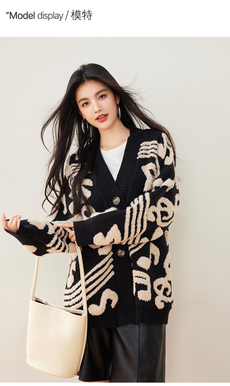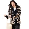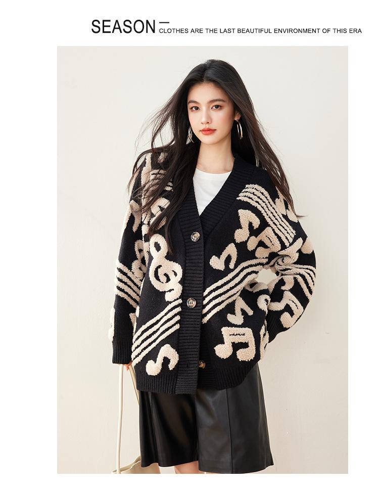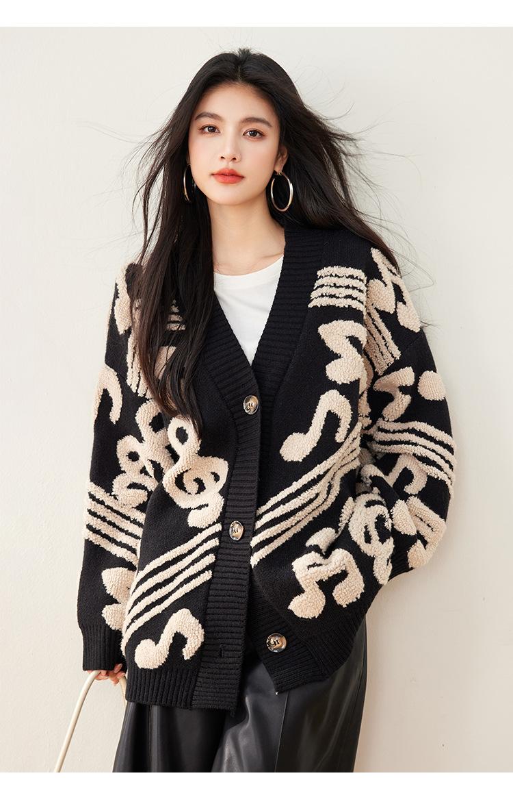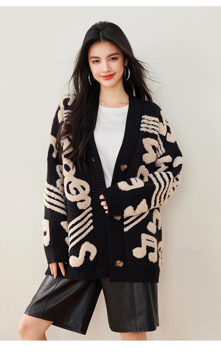 Fuente de Comercio Exterior Manga Larga Nota Bloque de Color Tejido de Punto Cárdigan Abrigo Top de Otoño e Invierno para Mujer Estilo Holgado Perezoso