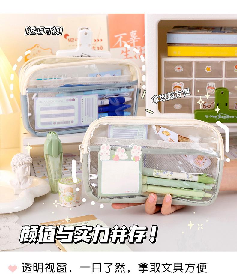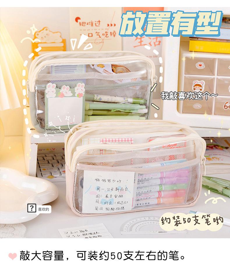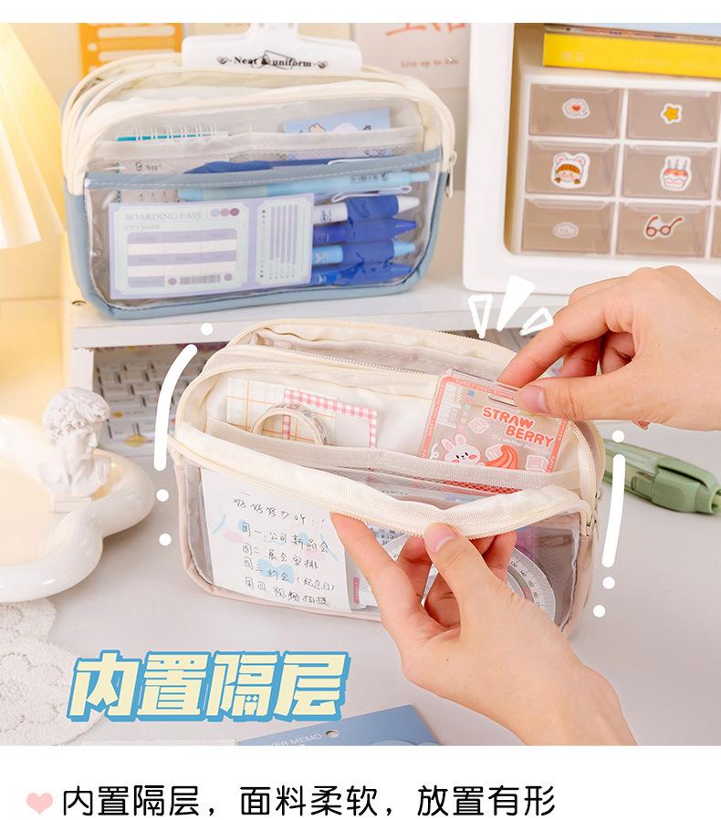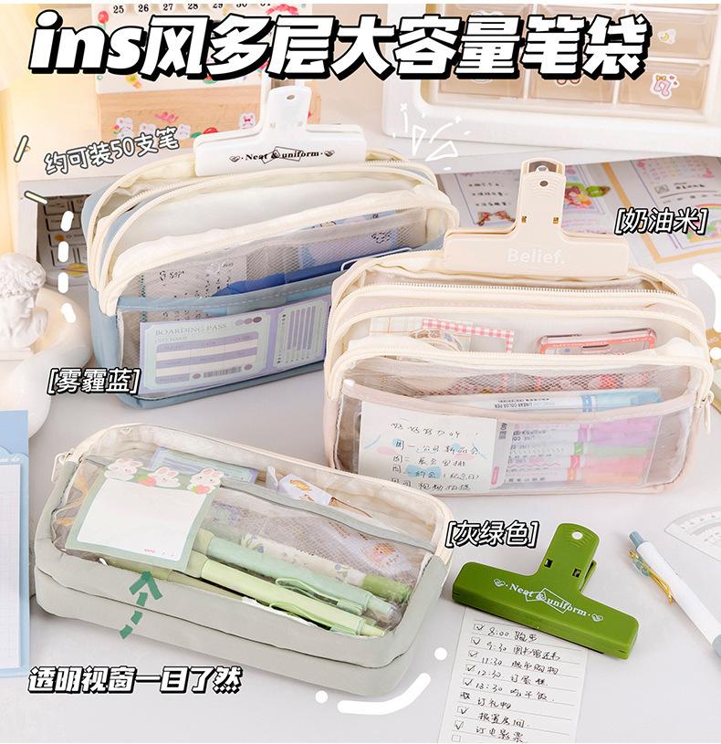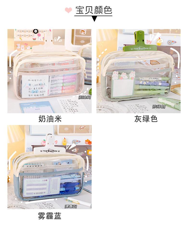 Estuche de papelería simple de estilo japonés moderno de tres capas de gran capacidad transparente al por mayor para niñas estudiantes de primaria caja para lápices almacenamiento