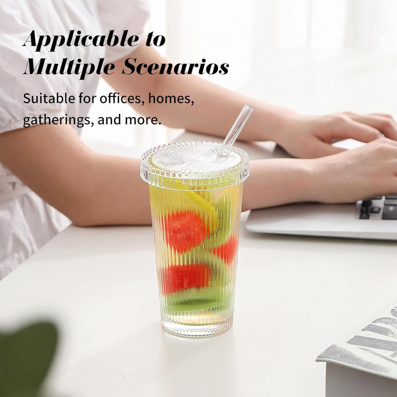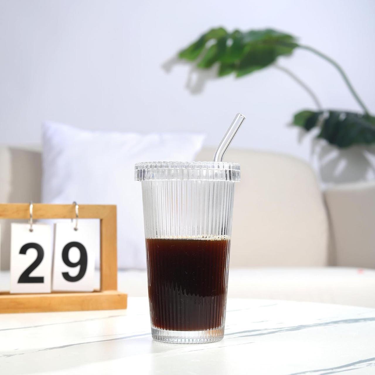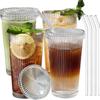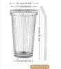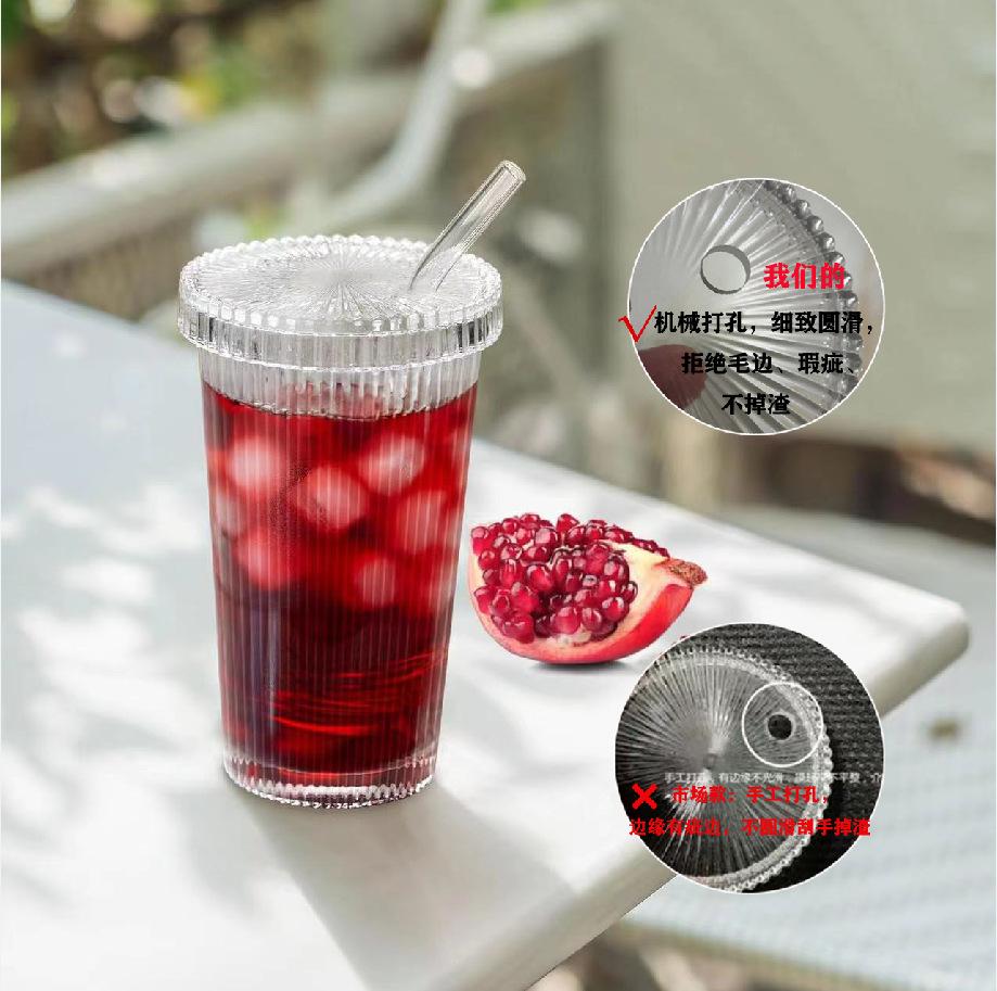 Taza de vidrio con pajita de rayas verticales al por mayor con tapa, taza de agua para bebida de café de aspecto elegante, taza sencilla para té con leche, jugo, ins