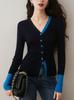 Suéter de Punto con Cuello en V de Color Contraste de Diseño Nuevo 2024 Otoño e Invierno Nuevo Sentido de Alta Gama Ajustado Adelgazante Súper Bonito Top