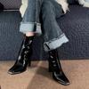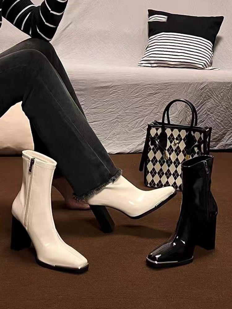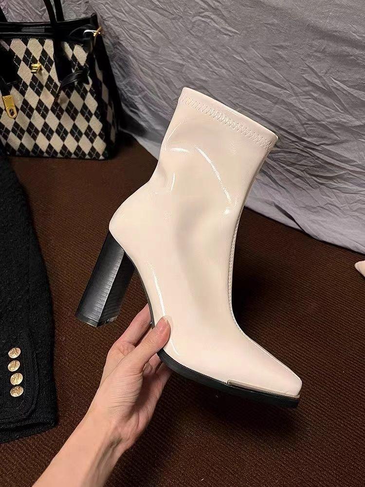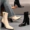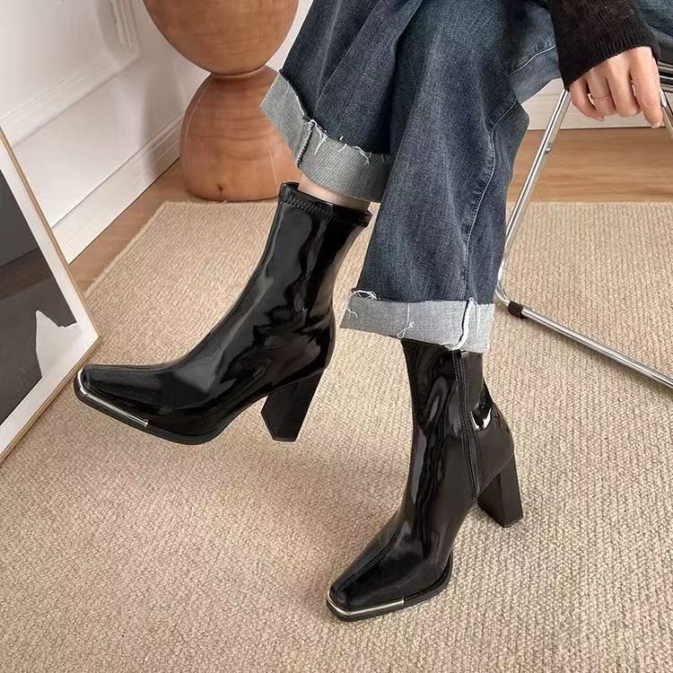 Botines de Tobillo Ajustados de Piel Patentada de Moda y Versátiles con Punta Cuadrada, Botas de Media Caña con Tacón Grueso, Nuevos Botines de Tobillo de Tacón Alto para Mujer Otoño e Invierno 2025