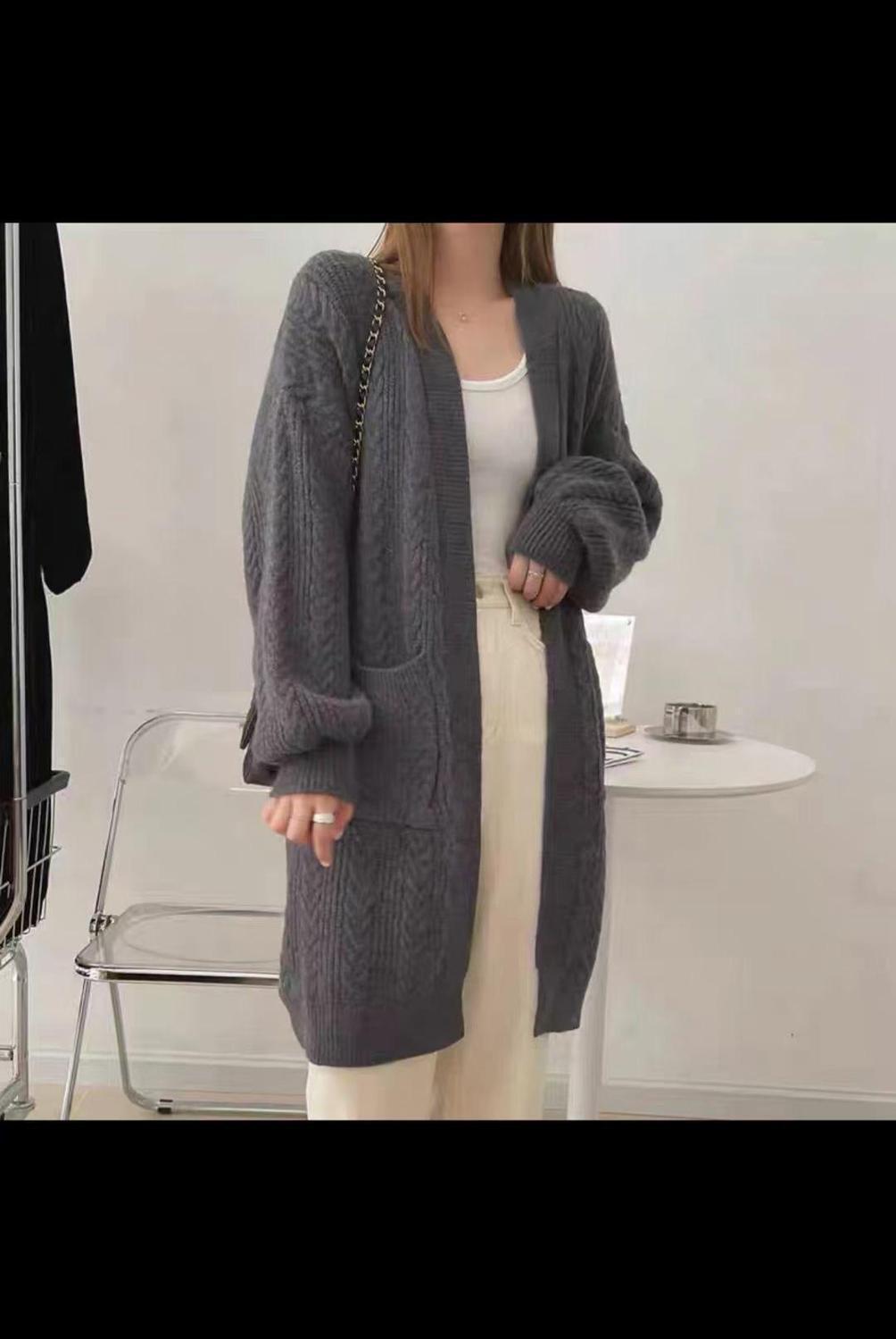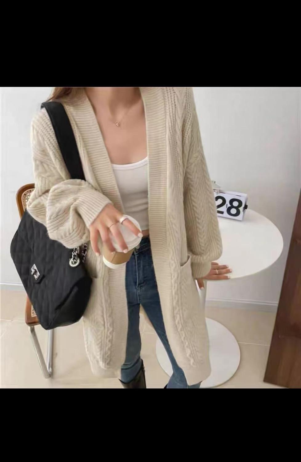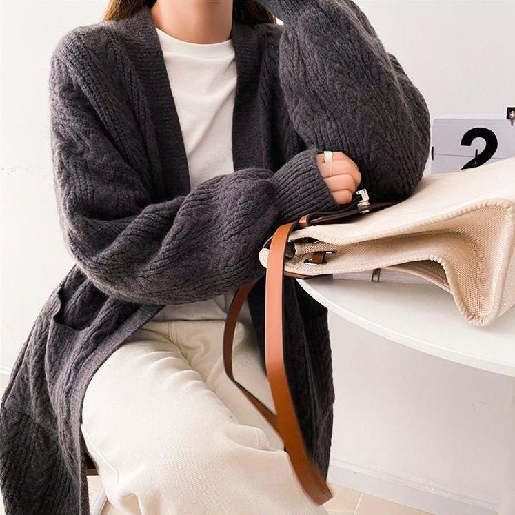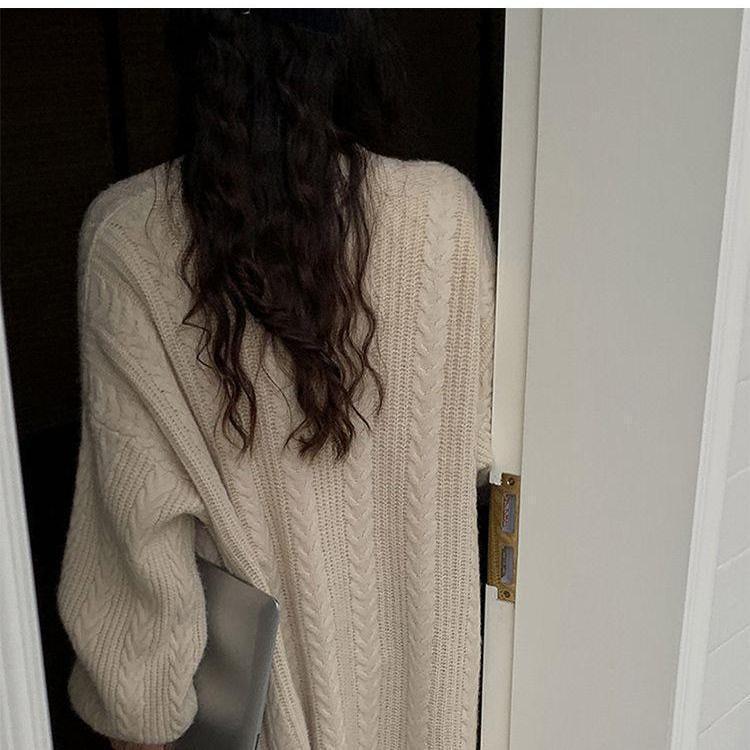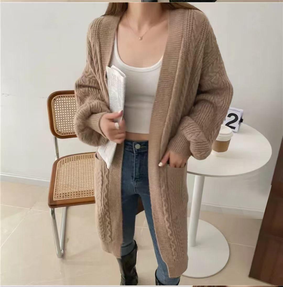 Suéter cárdigan holgado de manga linterna estilo perezoso sin botones grueso primavera y otoño retro tejido de cable largo medio para mujer holgado