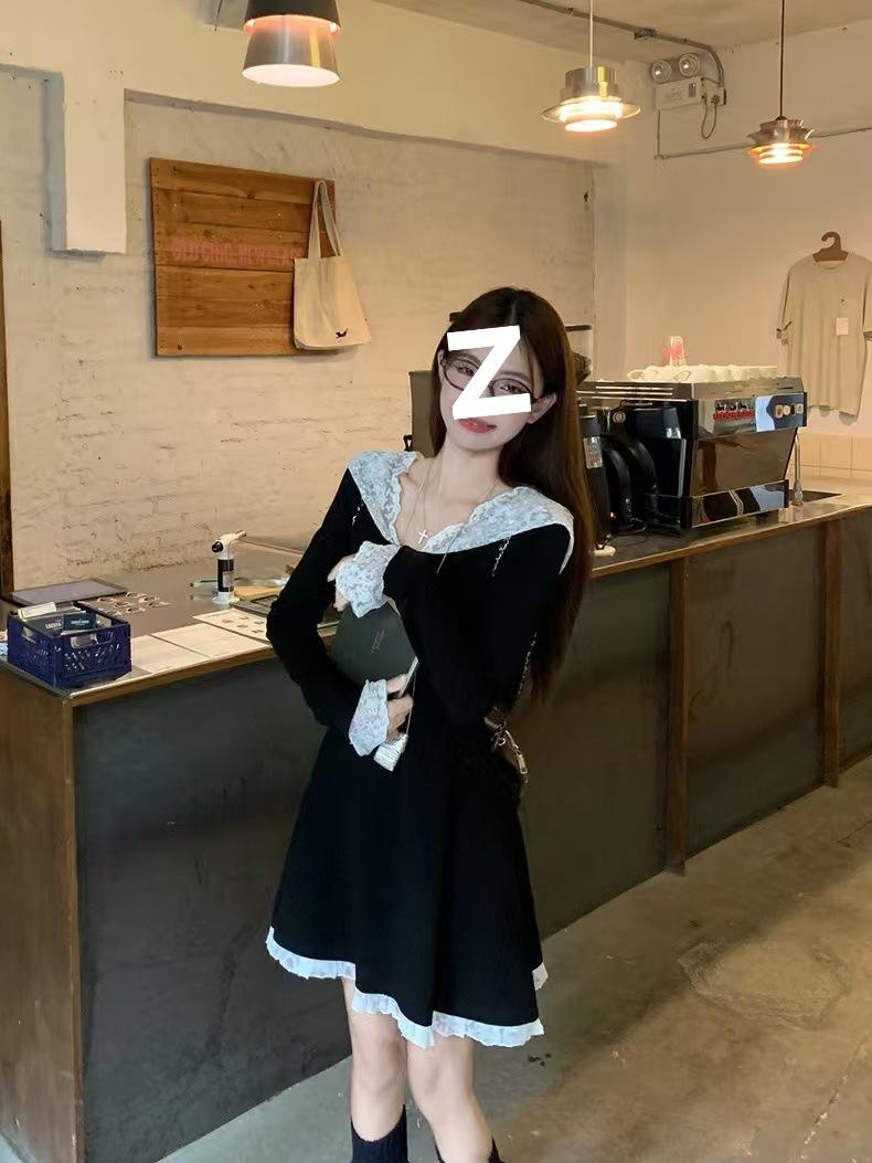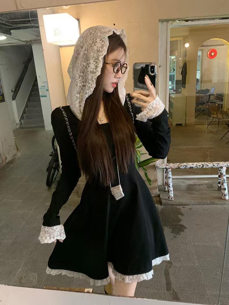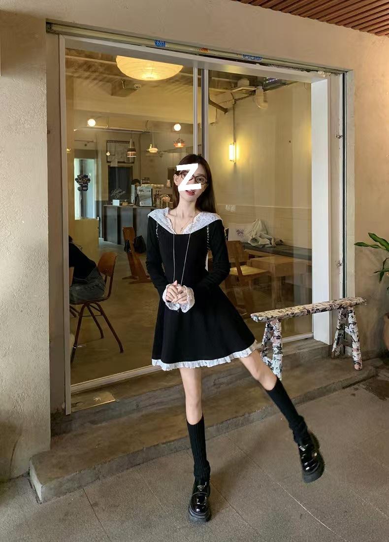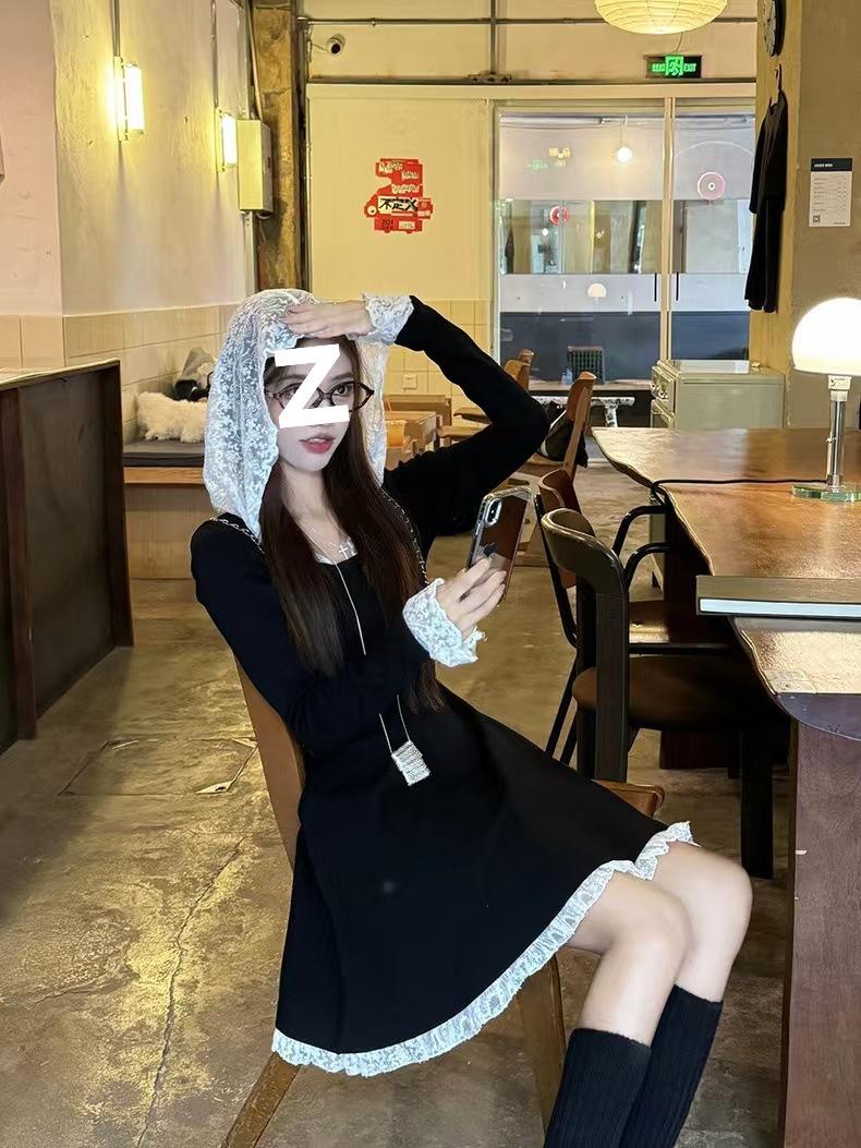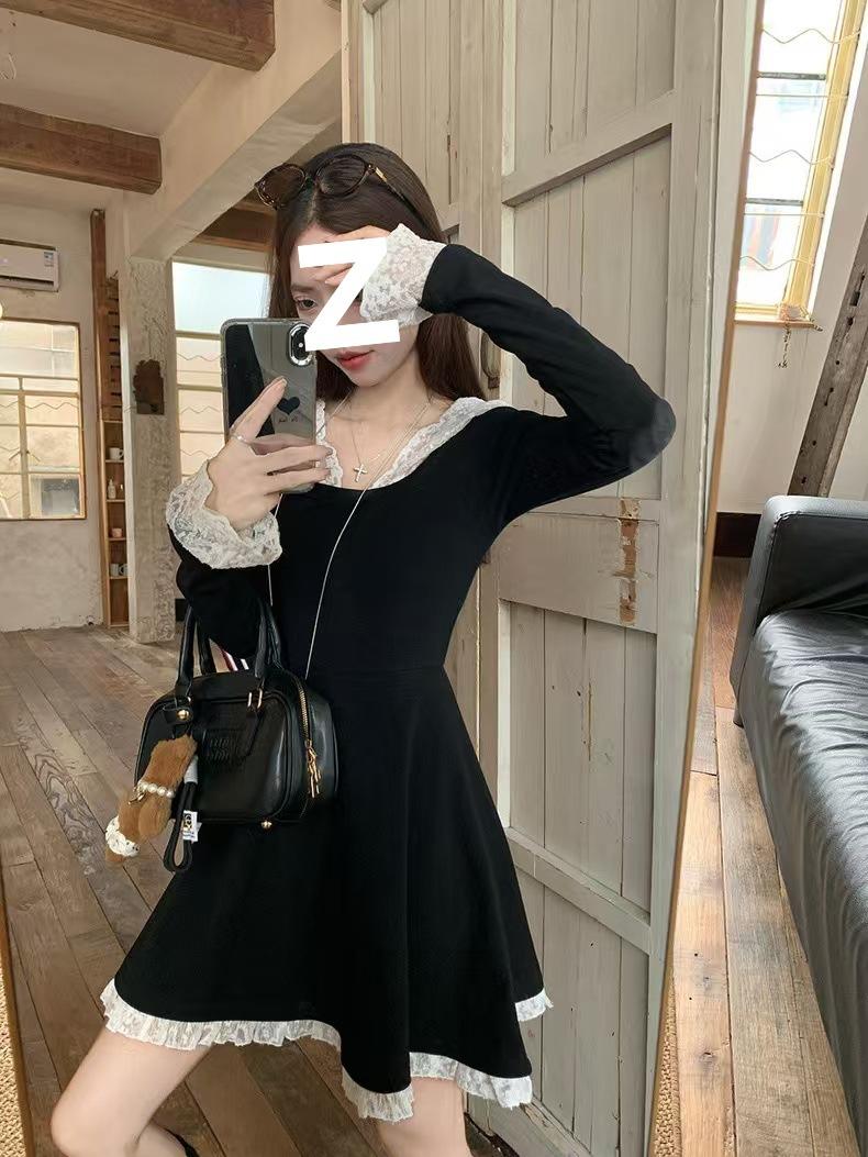 Vestido negro estilo Hepburn francés para mujer otoño/invierno 2025 nuevo encaje patchwork temperamento adelgazante línea A falda corta