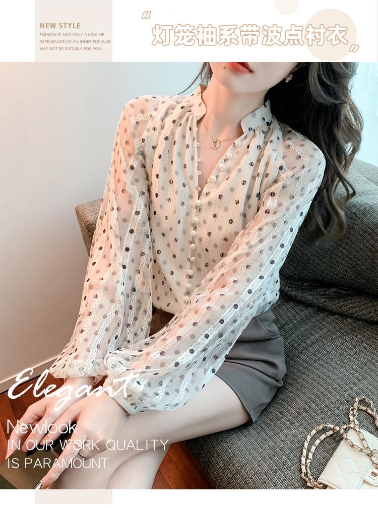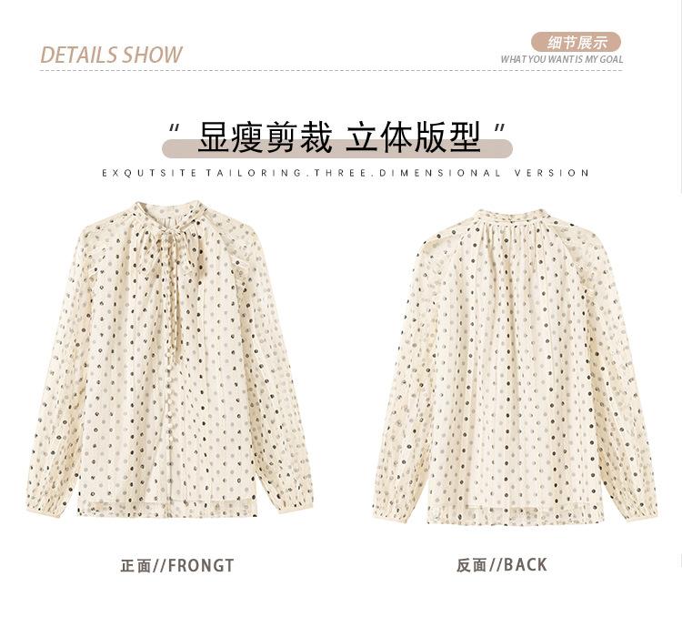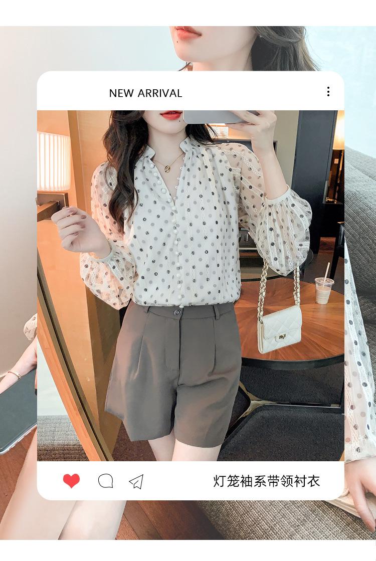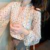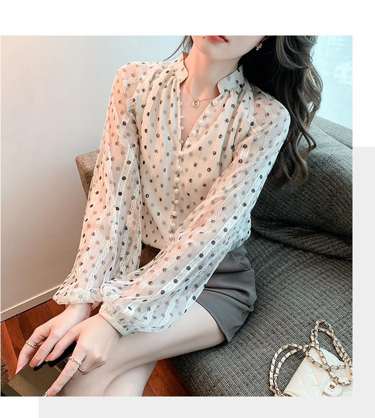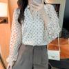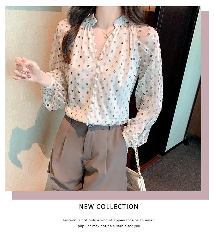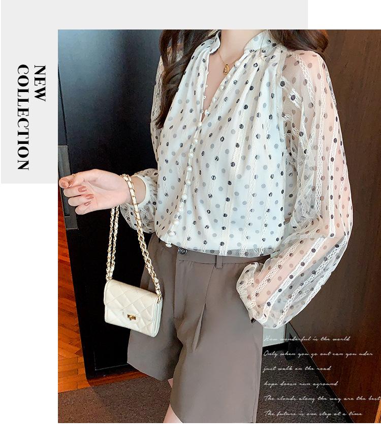 Camisa de gasa de estilo coreano para mujer, camisa de manga larga con cuello en V y costuras de malla, disponible en primavera de 2025.