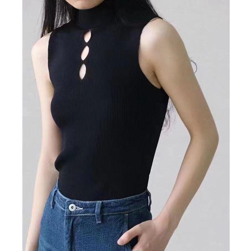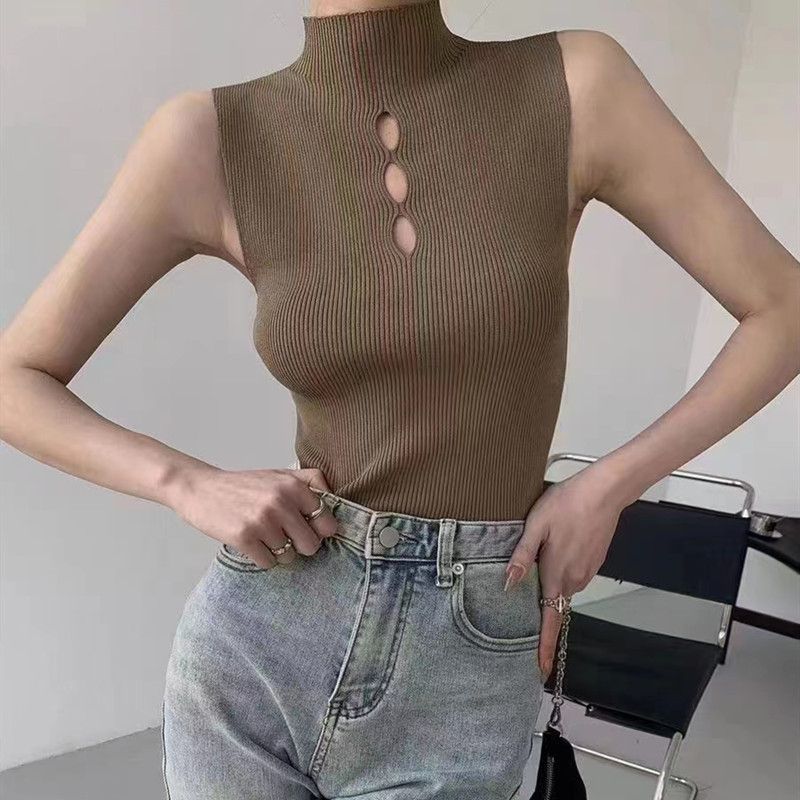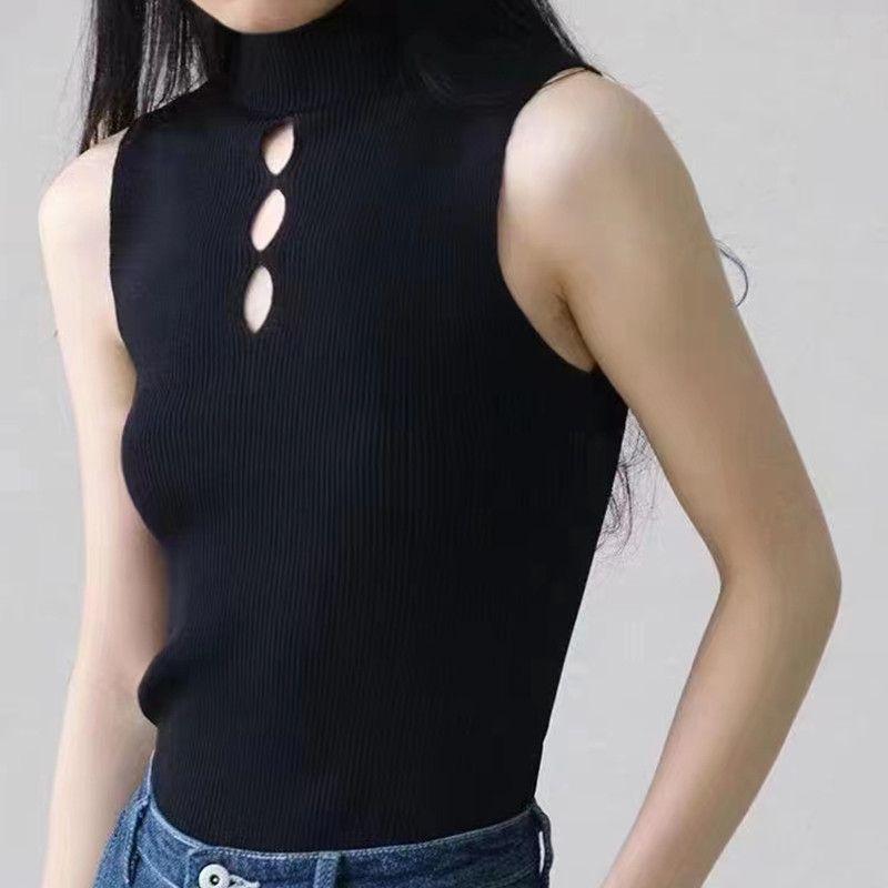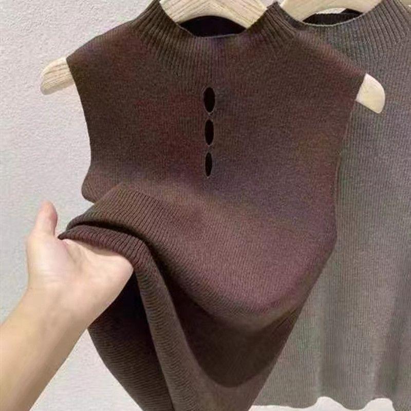 Chaleco de Punto de Cuello Semialto para Mujer, Diseño de Nicho, Sensación de Adelgazamiento, Agujeros en el Cuello de Punto sin Mangas, Base para Mujer, Ropa Exterior Elástica