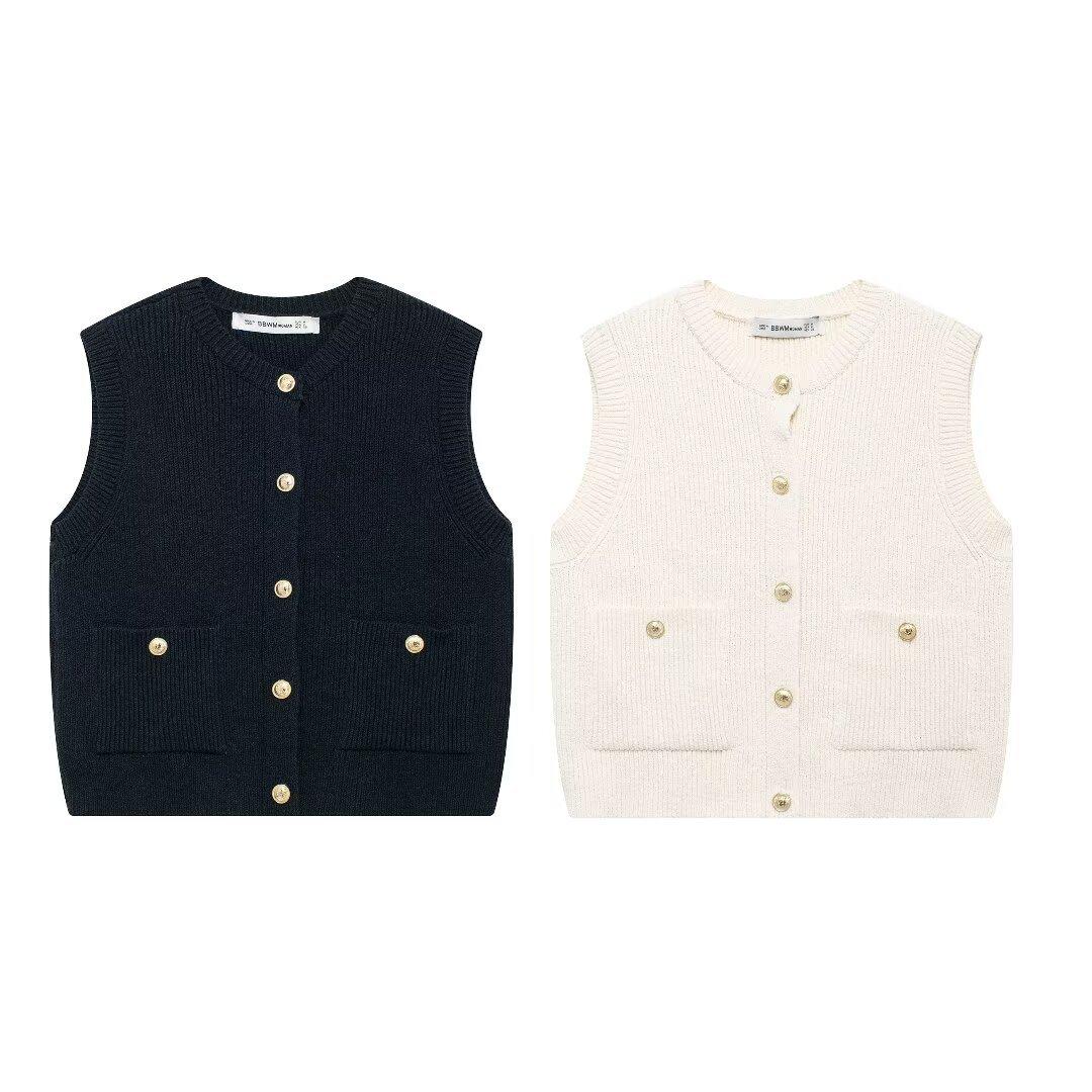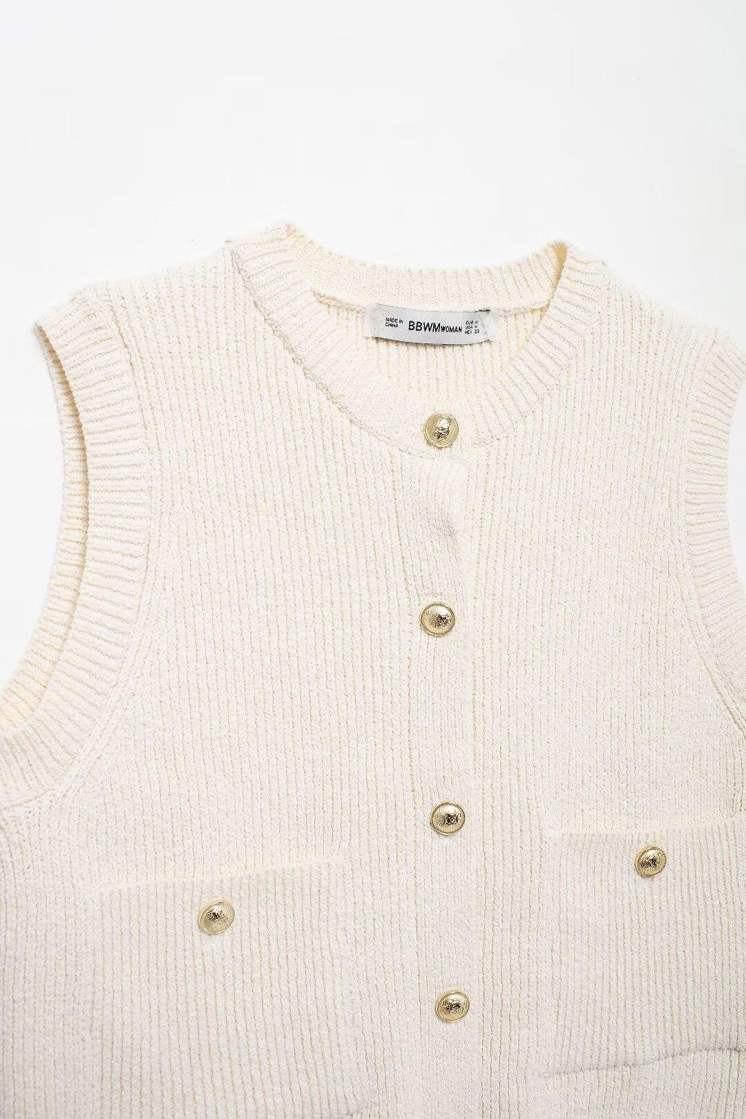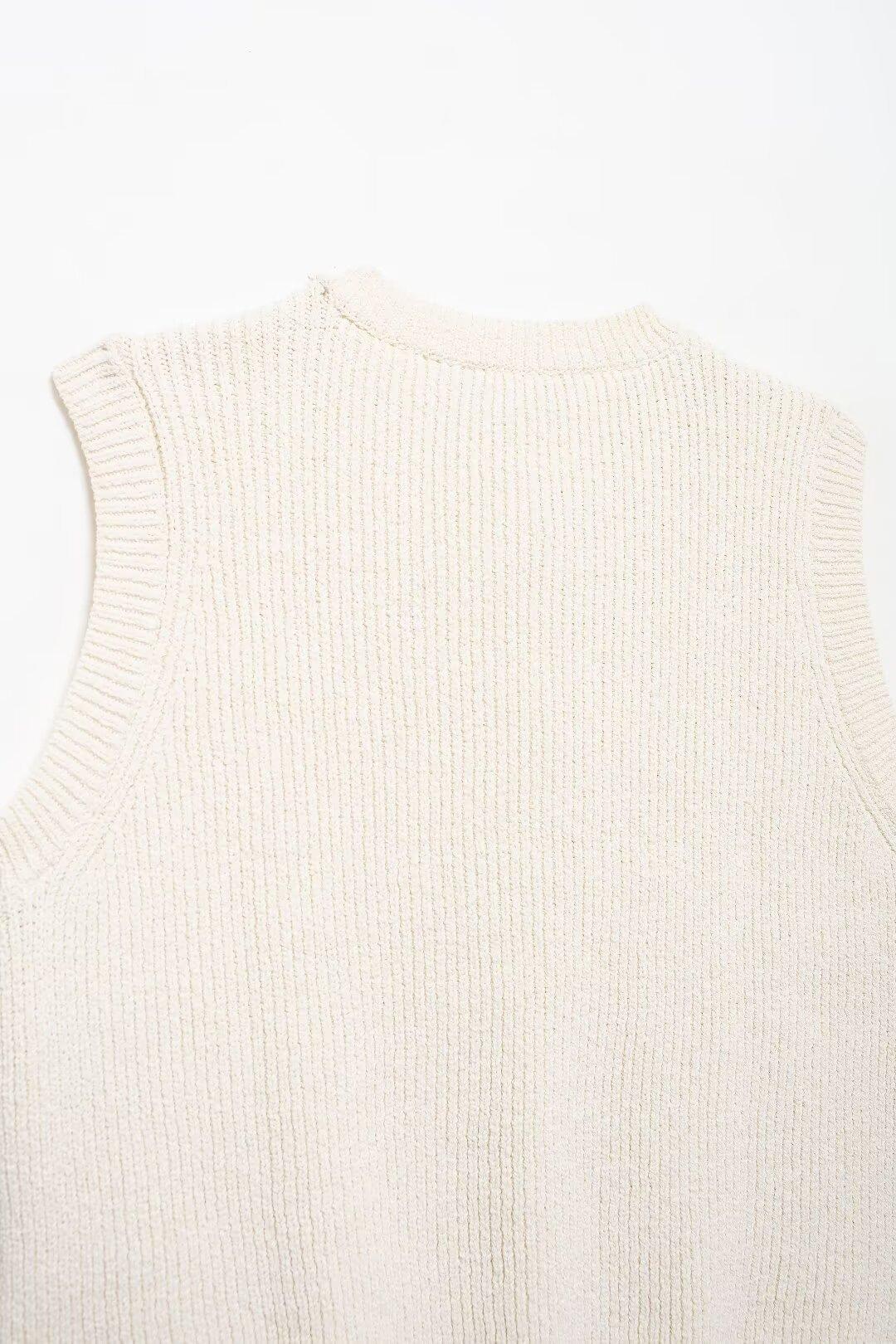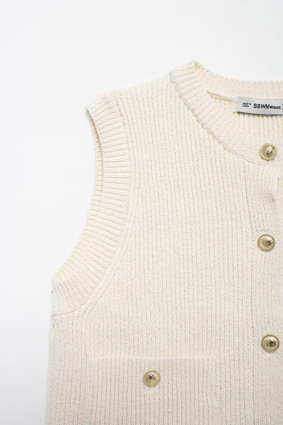 Ropa de Mujer de Comercio Exterior 2024 Principios de Otoño Nuevo Elegante Cuello Redondo Monopeto Sin Mangas Color Puro Cárdigan de Punto Chaleco de Mujer