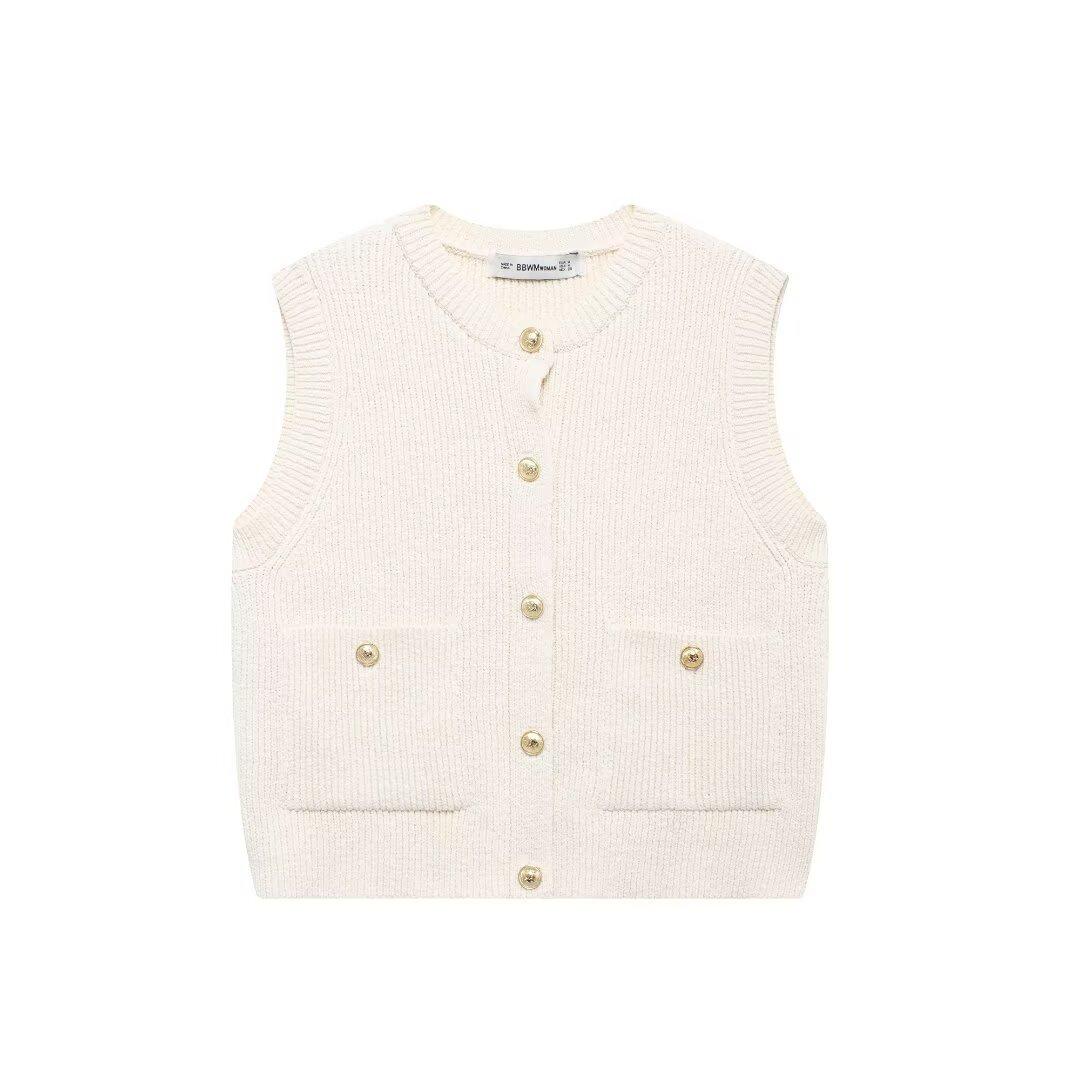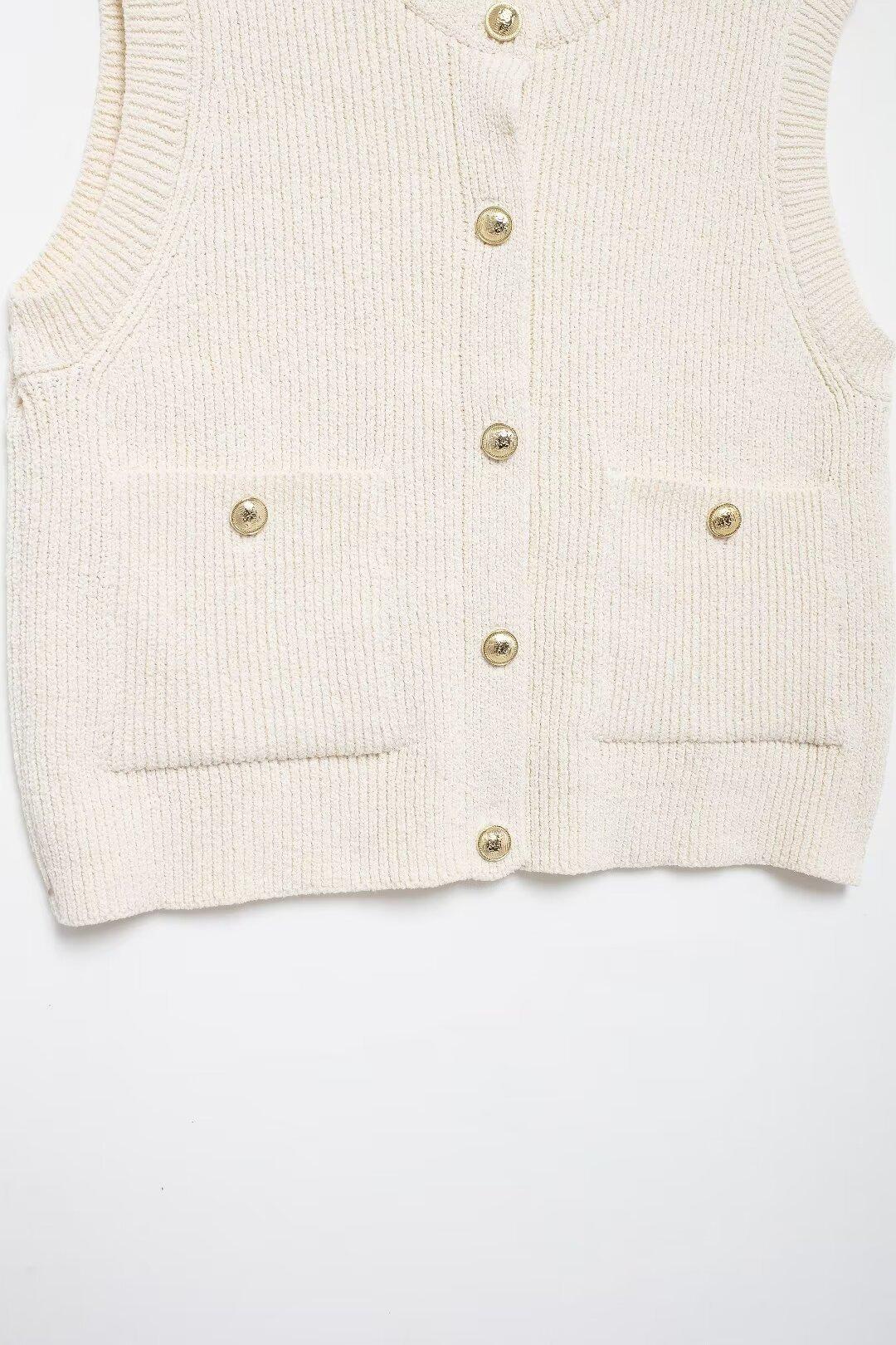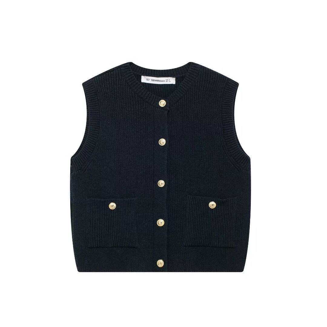 Ropa de Mujer de Comercio Exterior 2024 Principios de Otoño Nuevo Elegante Cuello Redondo Monopeto Sin Mangas Color Puro Cárdigan de Punto Chaleco de Mujer