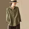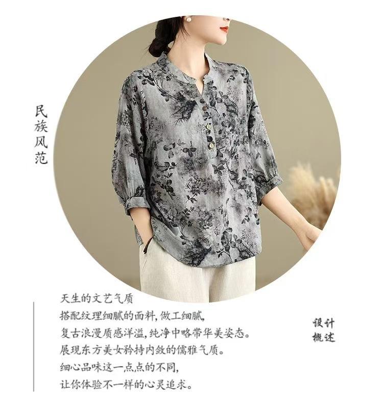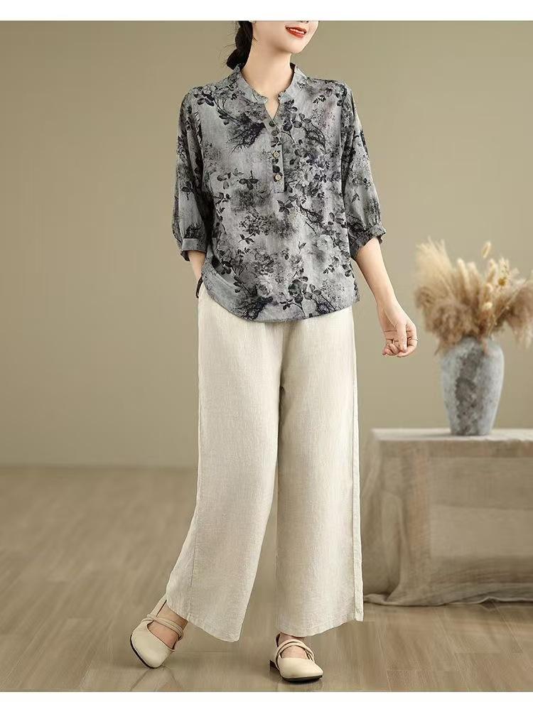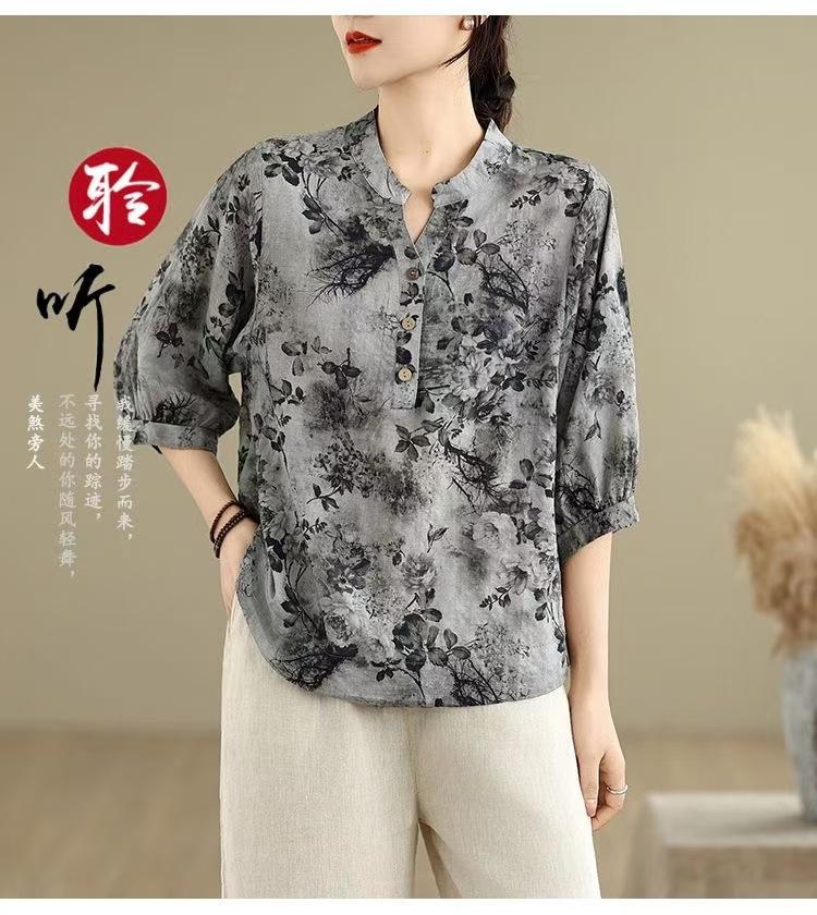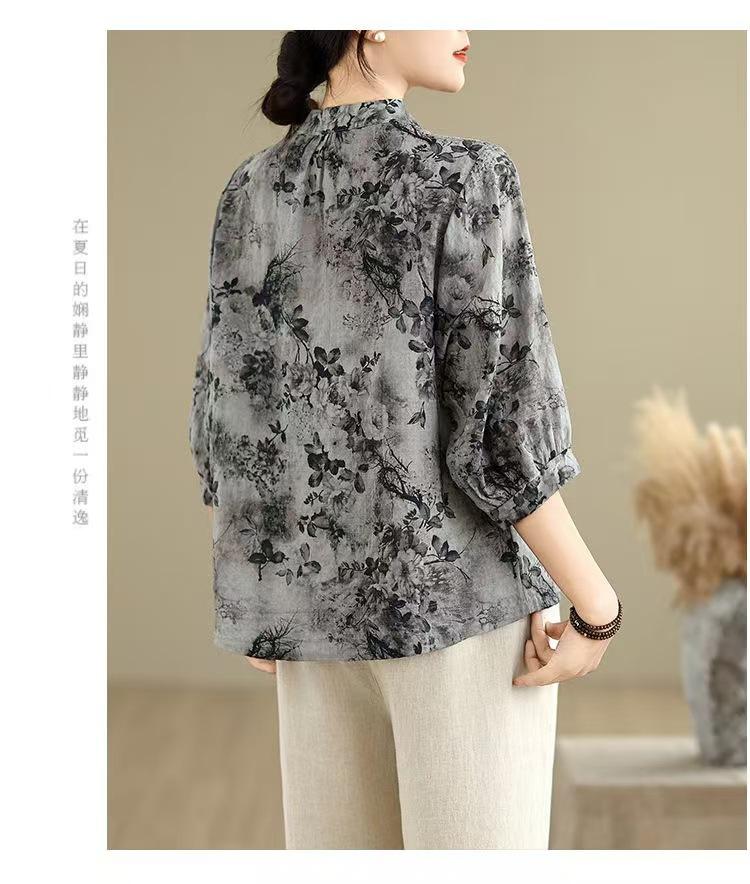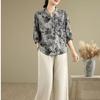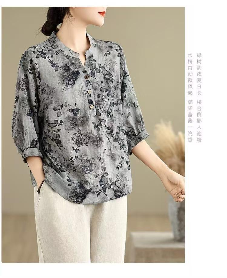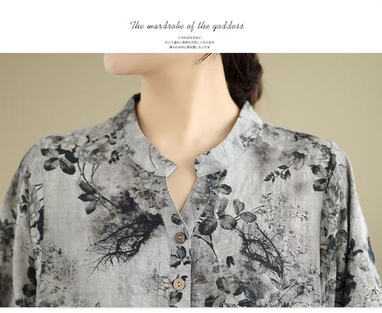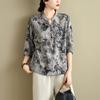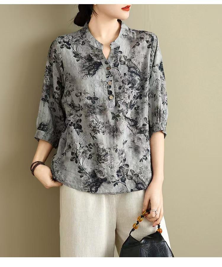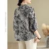 2025 Estilo Literario Verano Nueva Camisa Temperamento Algodón Lino Estampado Suelta Versátil Adelgazante Moda Top de Cuello Medio Abierto