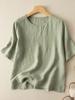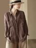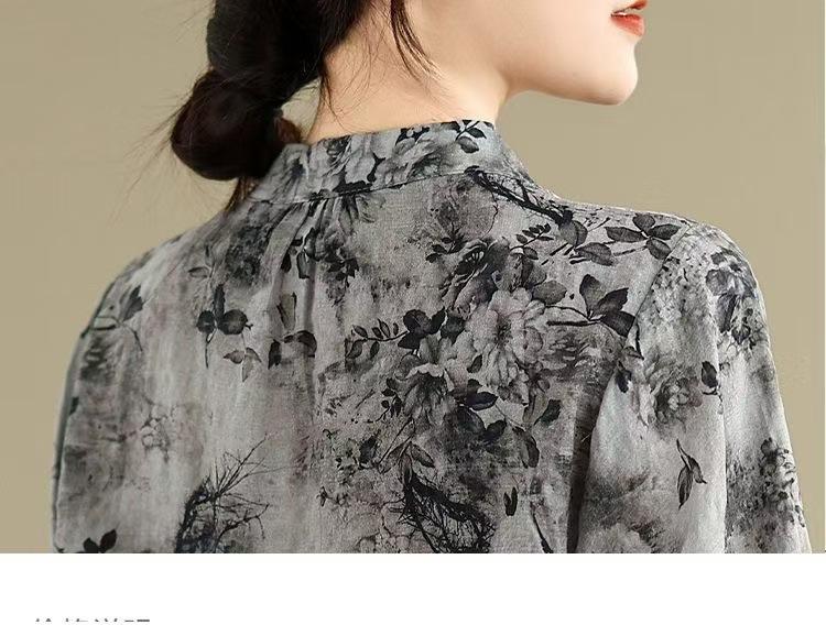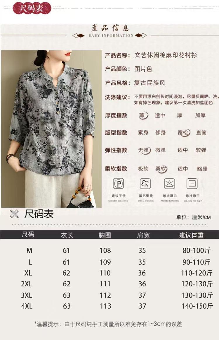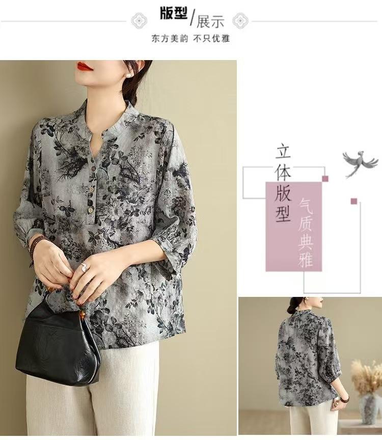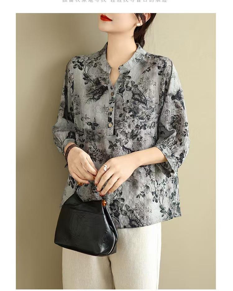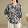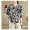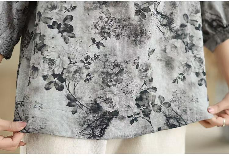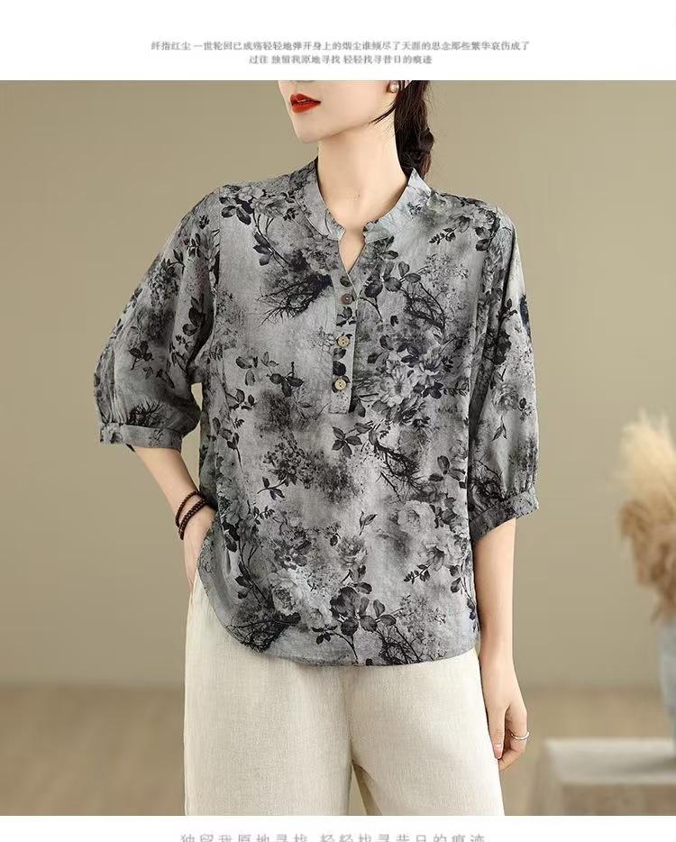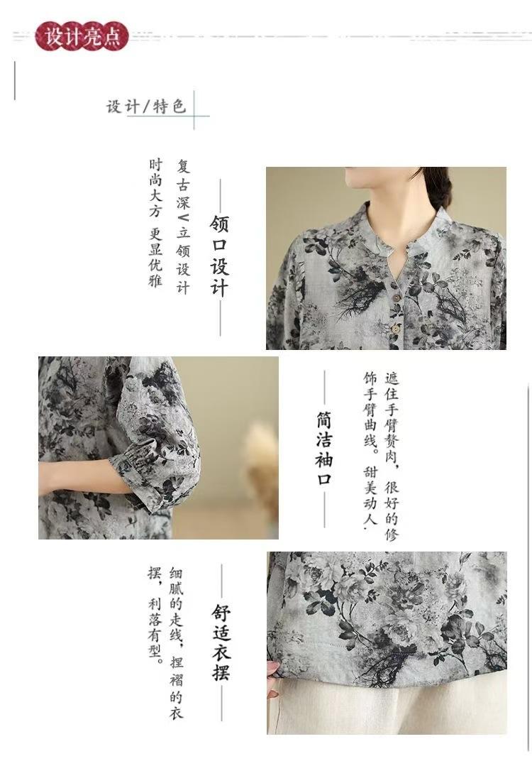 2025 Estilo Literario Verano Nueva Camisa Temperamento Algodón Lino Estampado Suelta Versátil Adelgazante Moda Top de Cuello Medio Abierto