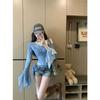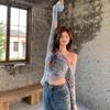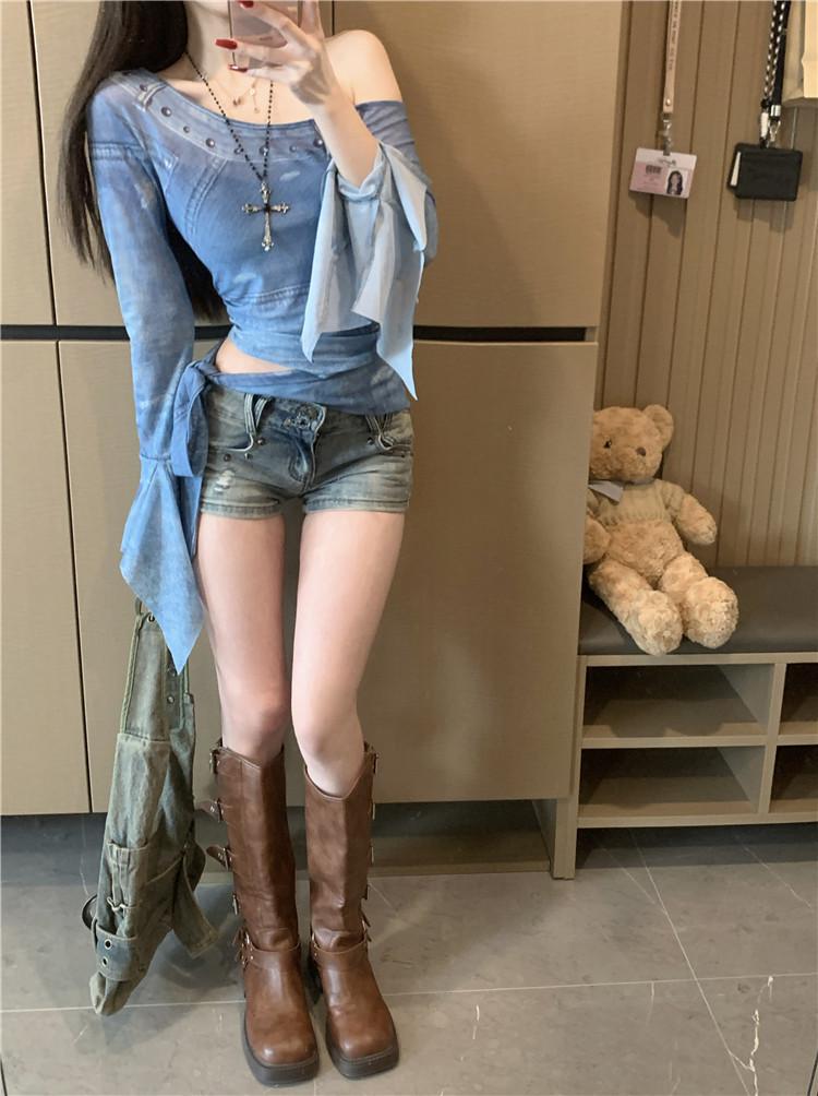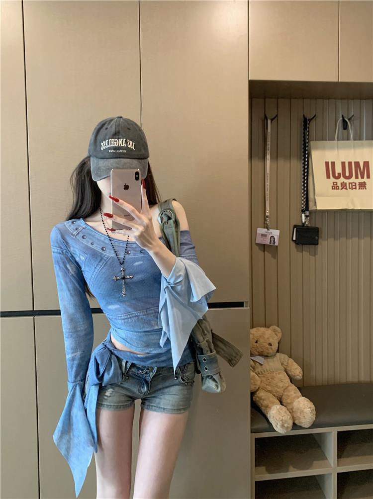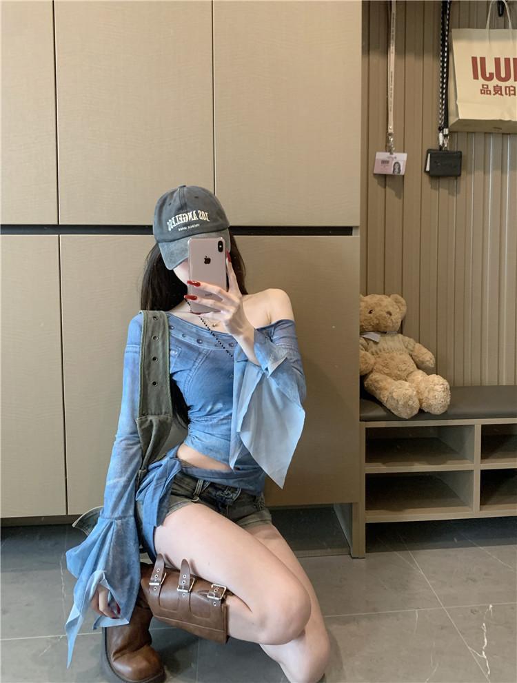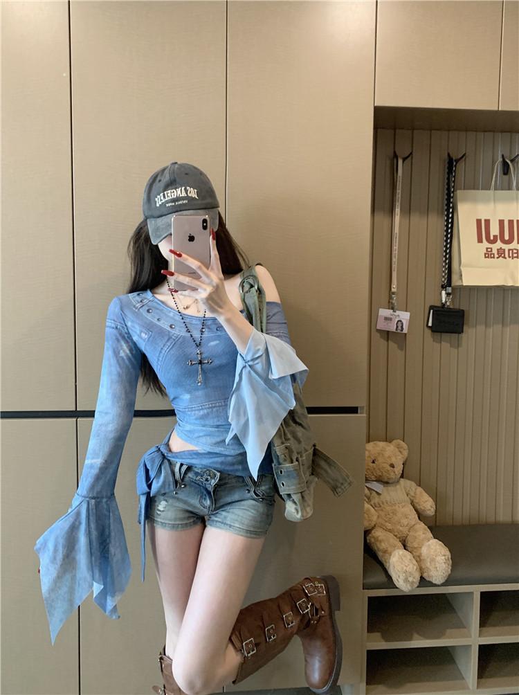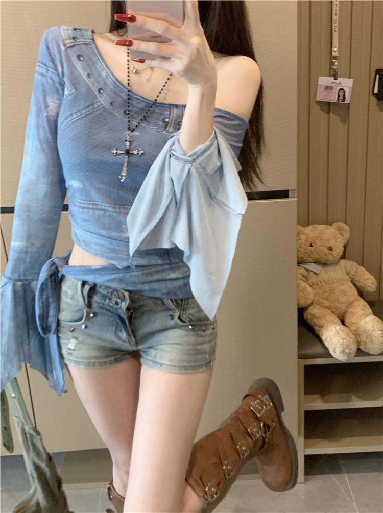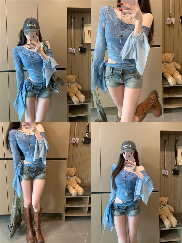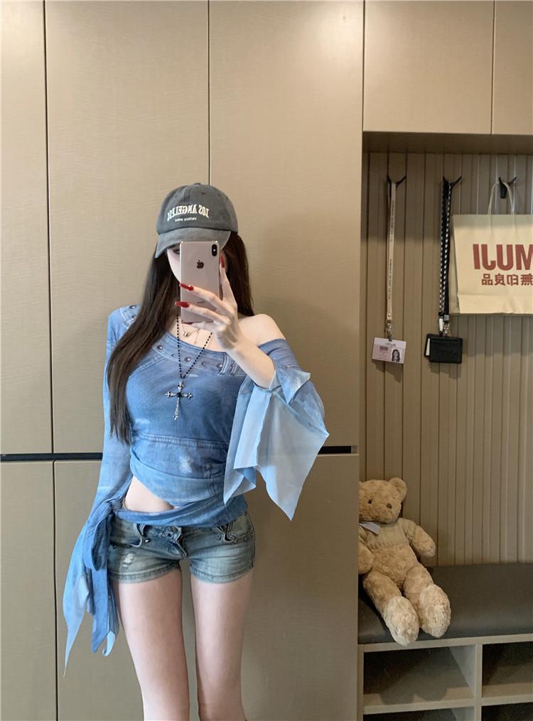 Camiseta de Manga Larga de Malla con Hombro Descubierto para Chica Picante Retro Americana para Mujer Verano Nuevo Manga Acampanada Protección Solar Top de Hombro Inclinado