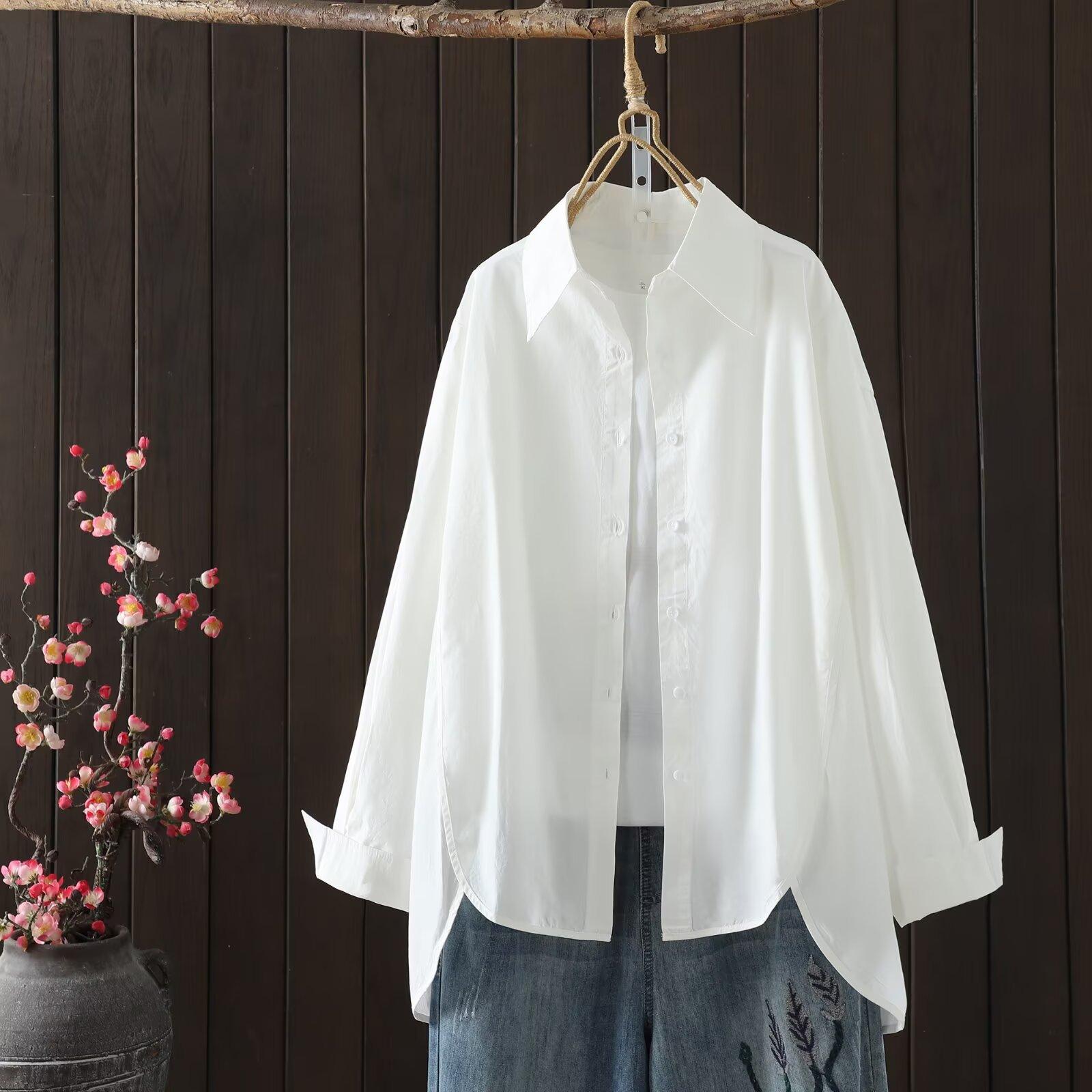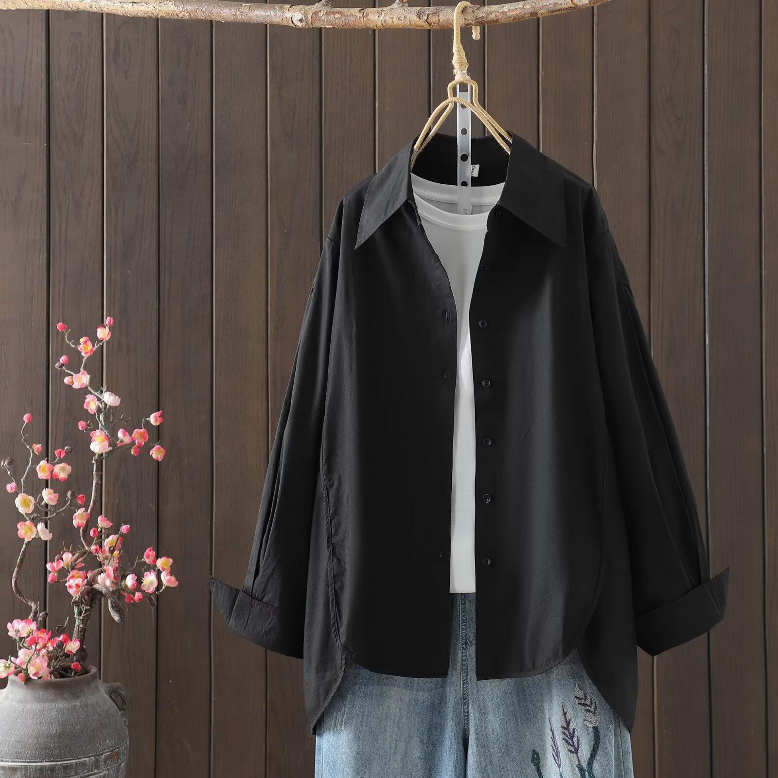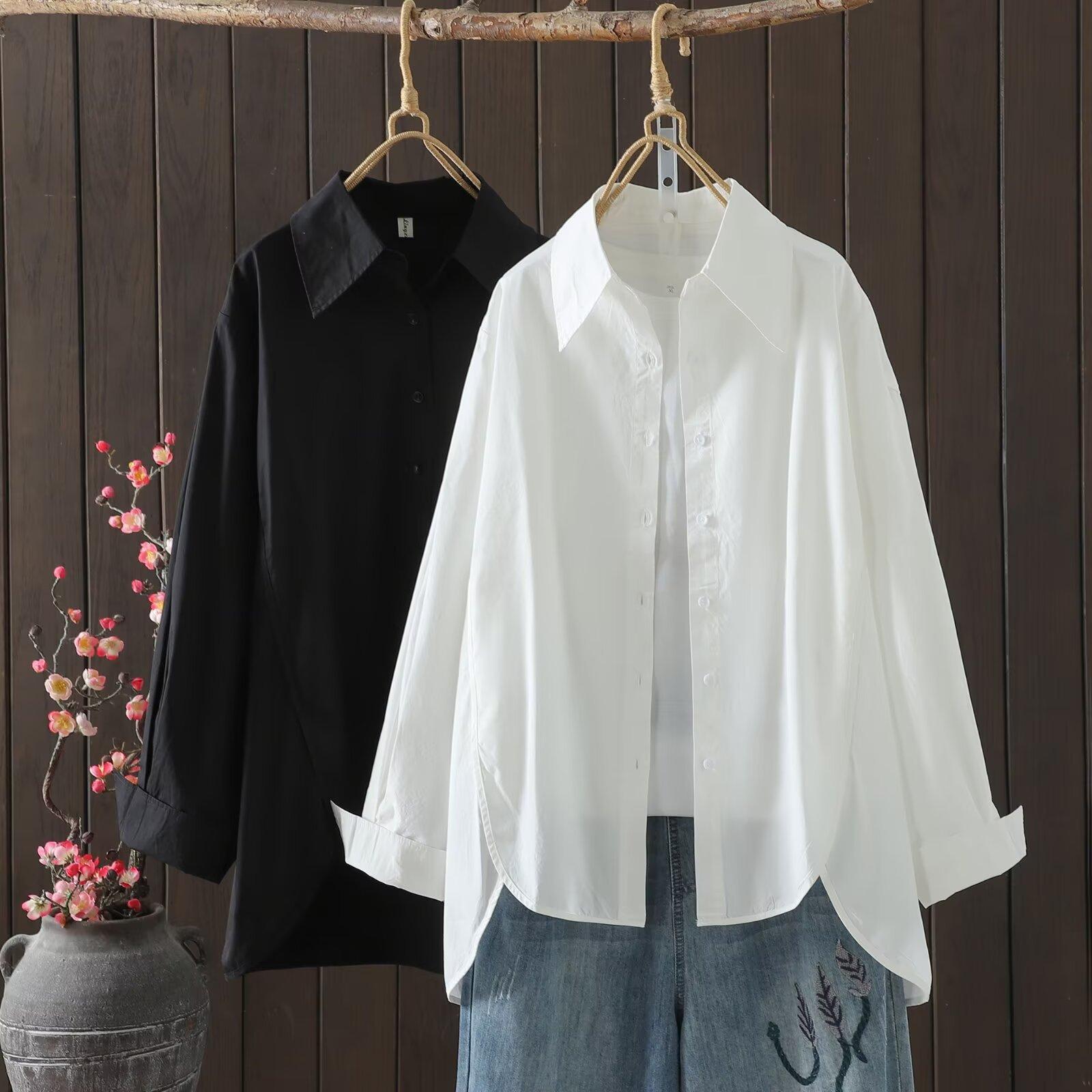 Otoño 2025 Nuevo Camisa de Manga Larga Color Sólido Top para Mujer Cárdigan Talla Grande Holgado Algodón Cuello Vuelto Al Por Mayor