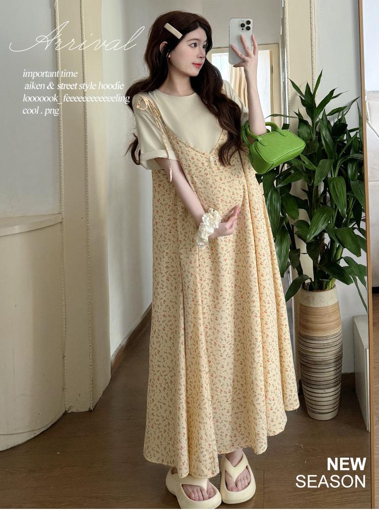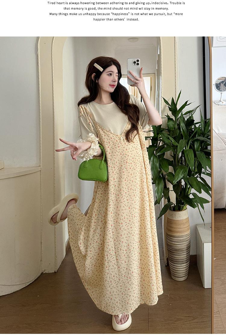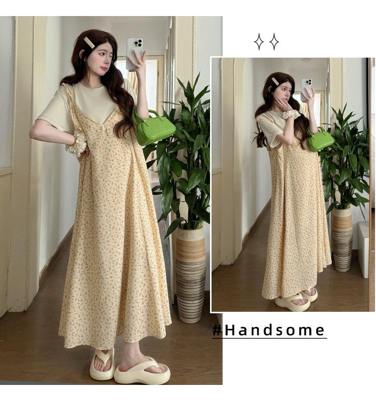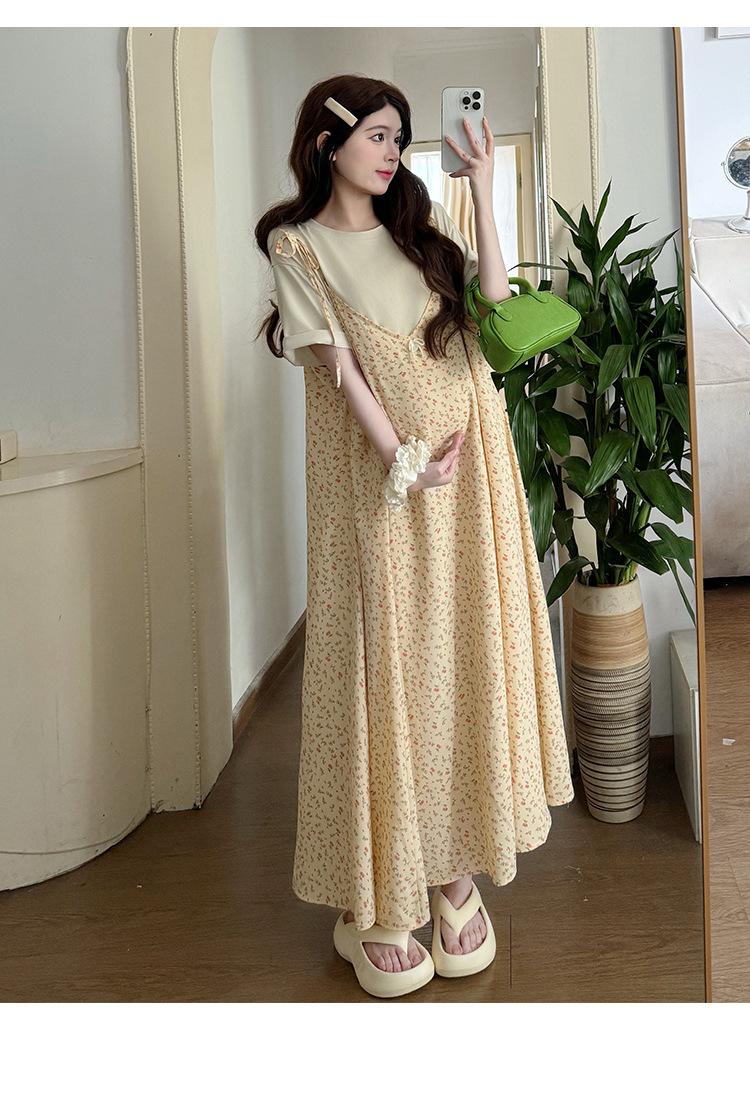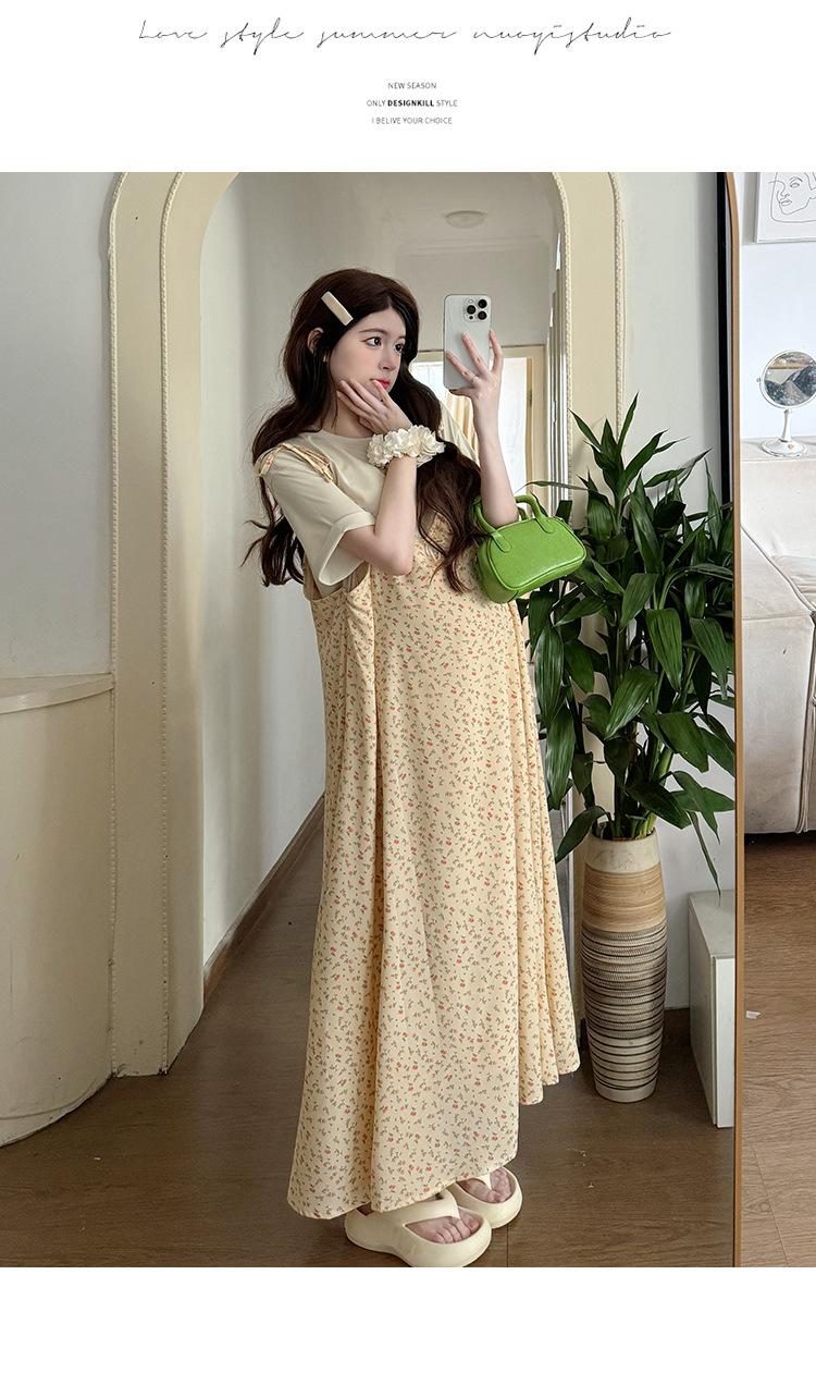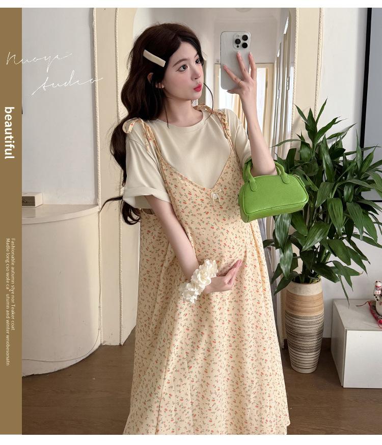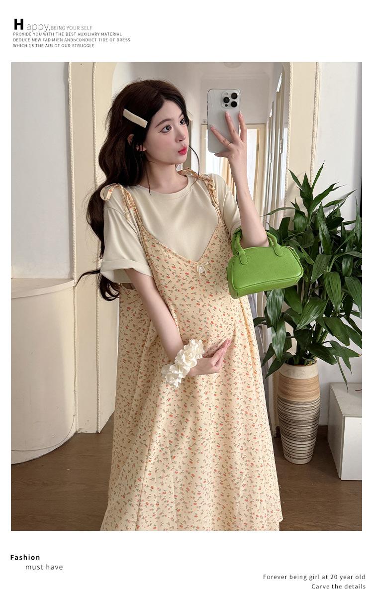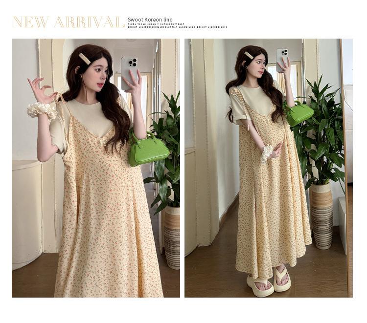 Ropa de Maternidad 2025 Verano Nuevo Dulce y a la Moda Falda de Tirantes Floral + Camiseta Holgada Vestido de Maternidad de Dos Piezas
