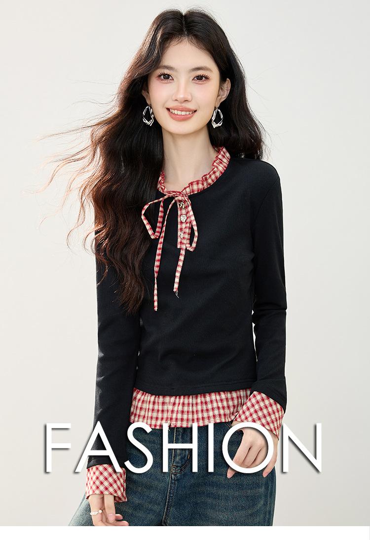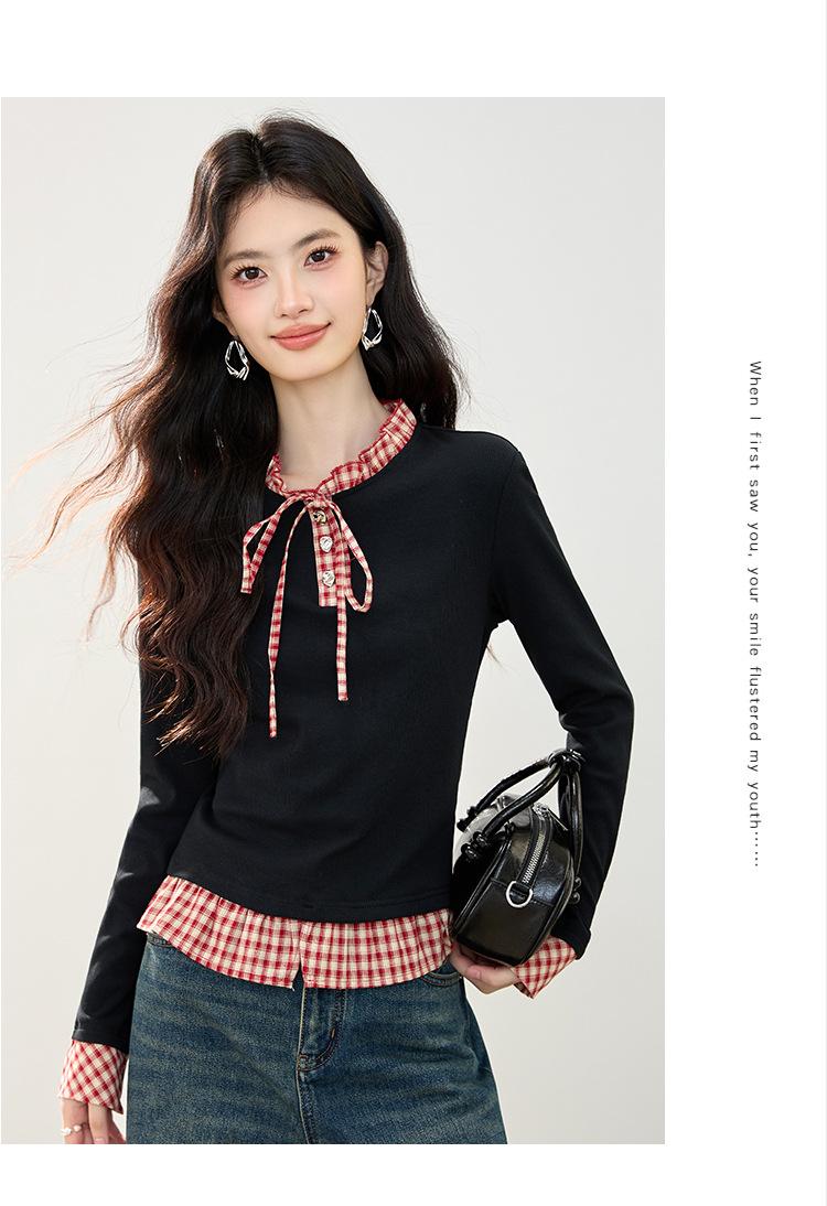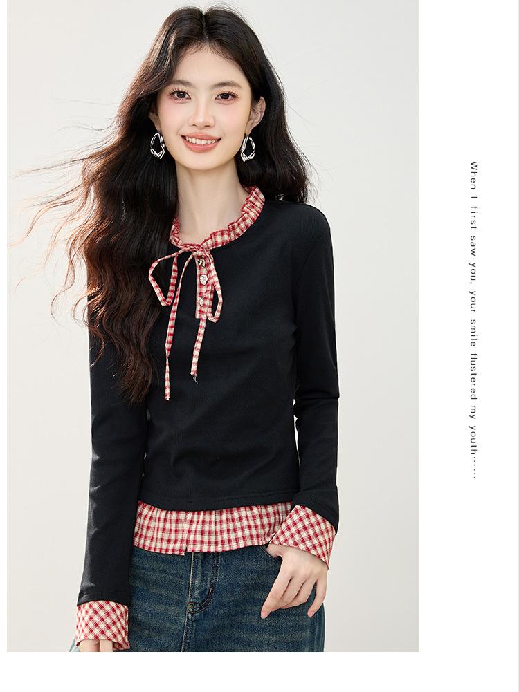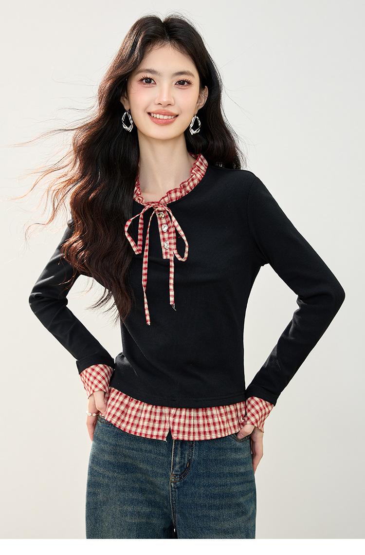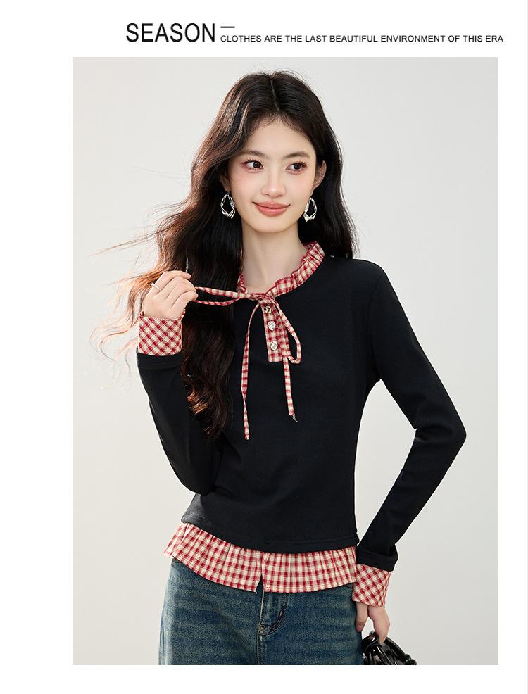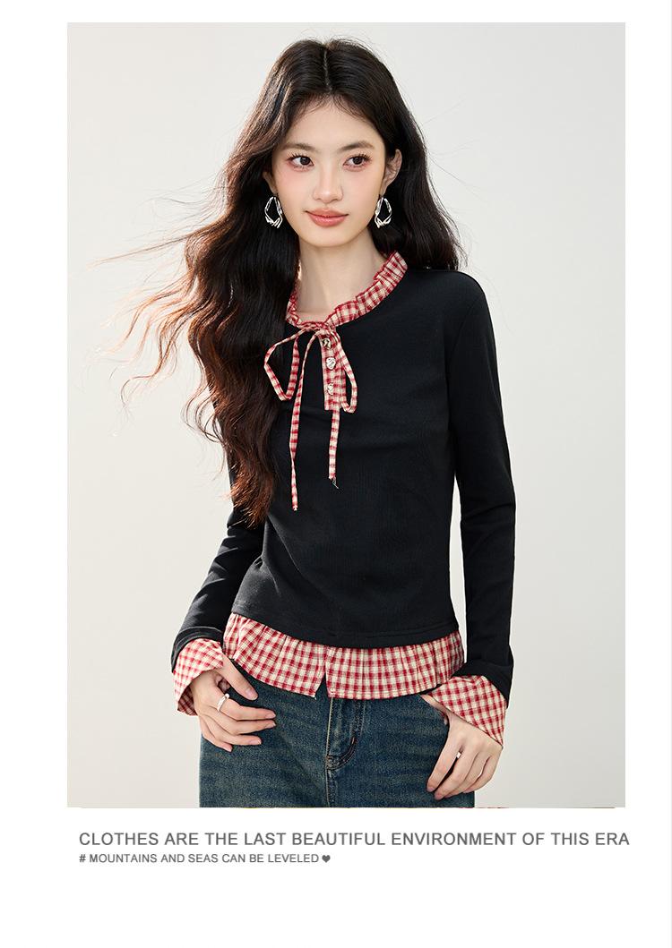 Otoño 2025 Nuevo Top de Dos Piezas Falso con Lazo de Cuadros Diseño Nicho de Moda Adelgazante Manga Larga Suéter de Punto para Mujer