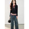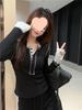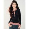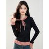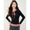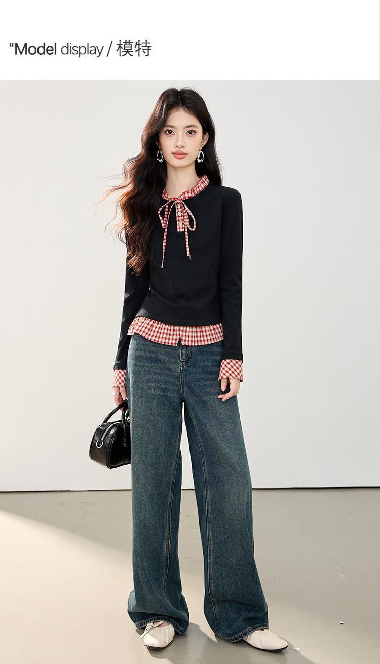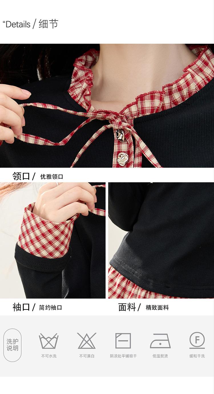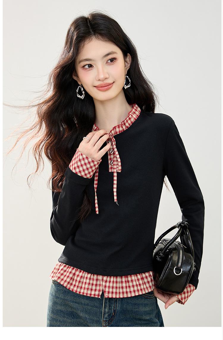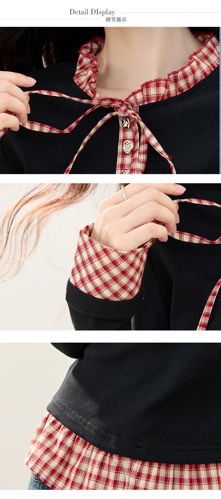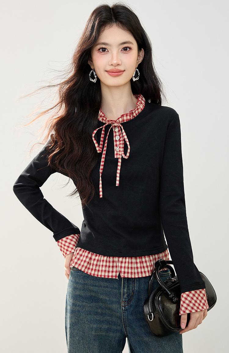 Otoño 2025 Nuevo Top de Dos Piezas Falso con Lazo de Cuadros Diseño Nicho de Moda Adelgazante Manga Larga Suéter de Punto para Mujer