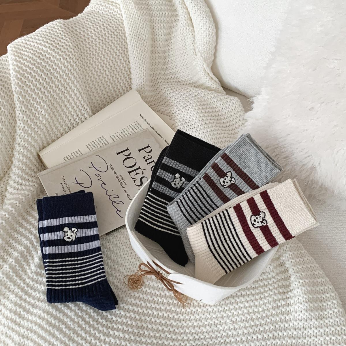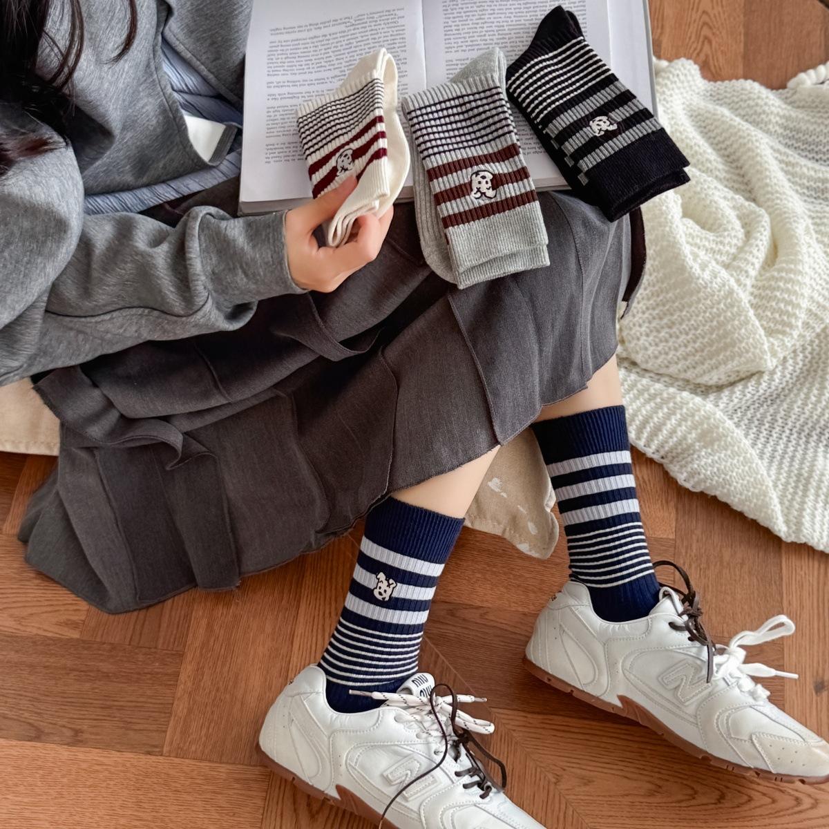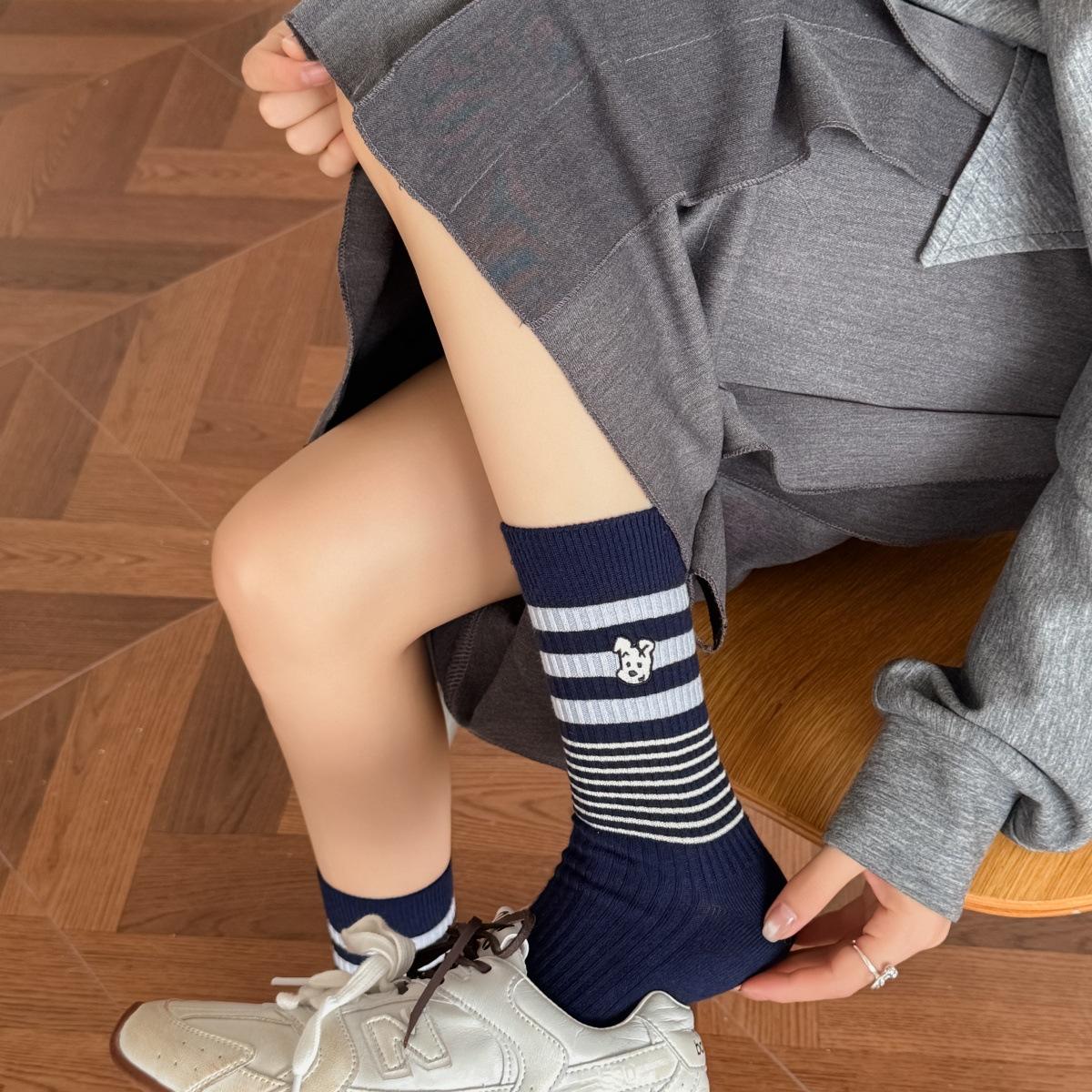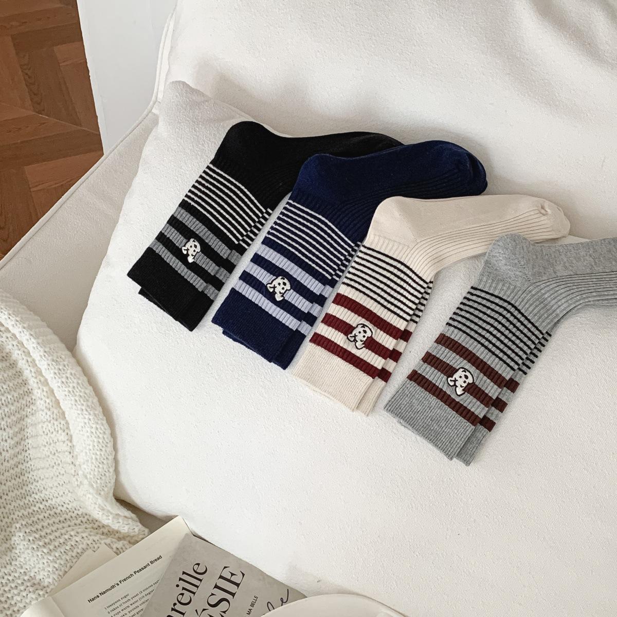 Calcetines de Algodón de Media Caña con Bloques de Color a Rayas y Bordado de Perro de Doble Aguja Estilo Xiaohongshu Mismo Estilo Calcetines Estilo Coreano de Dibujos Animados para Mujer Estilo Universitario