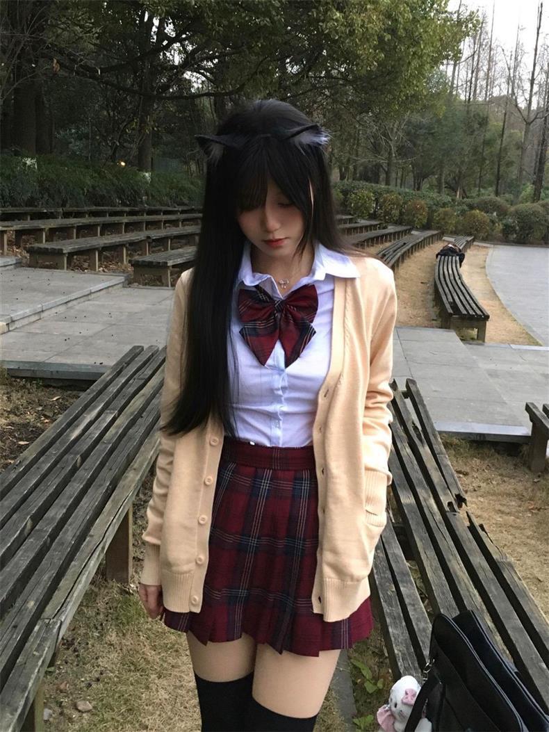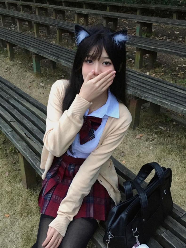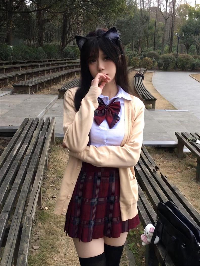 [suit] v-waist short sleeves + black red plaid skirt + bow tie