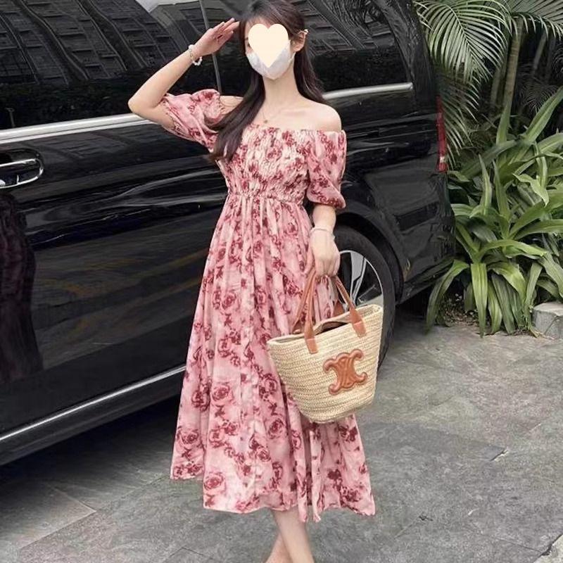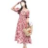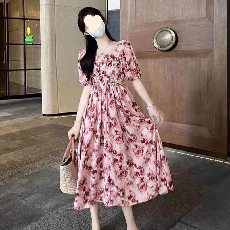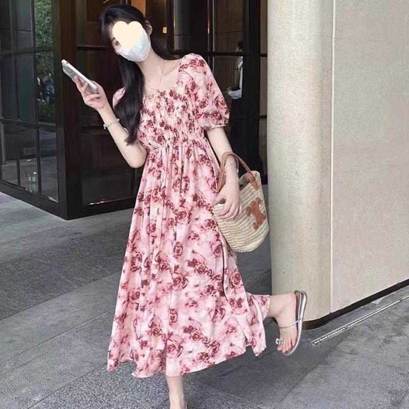 Vestido Retro Francés Rosa para Mujer Verano 2025 Nuevo Estilo Cintura Plisada Adelgazante Midi Floral