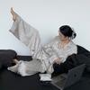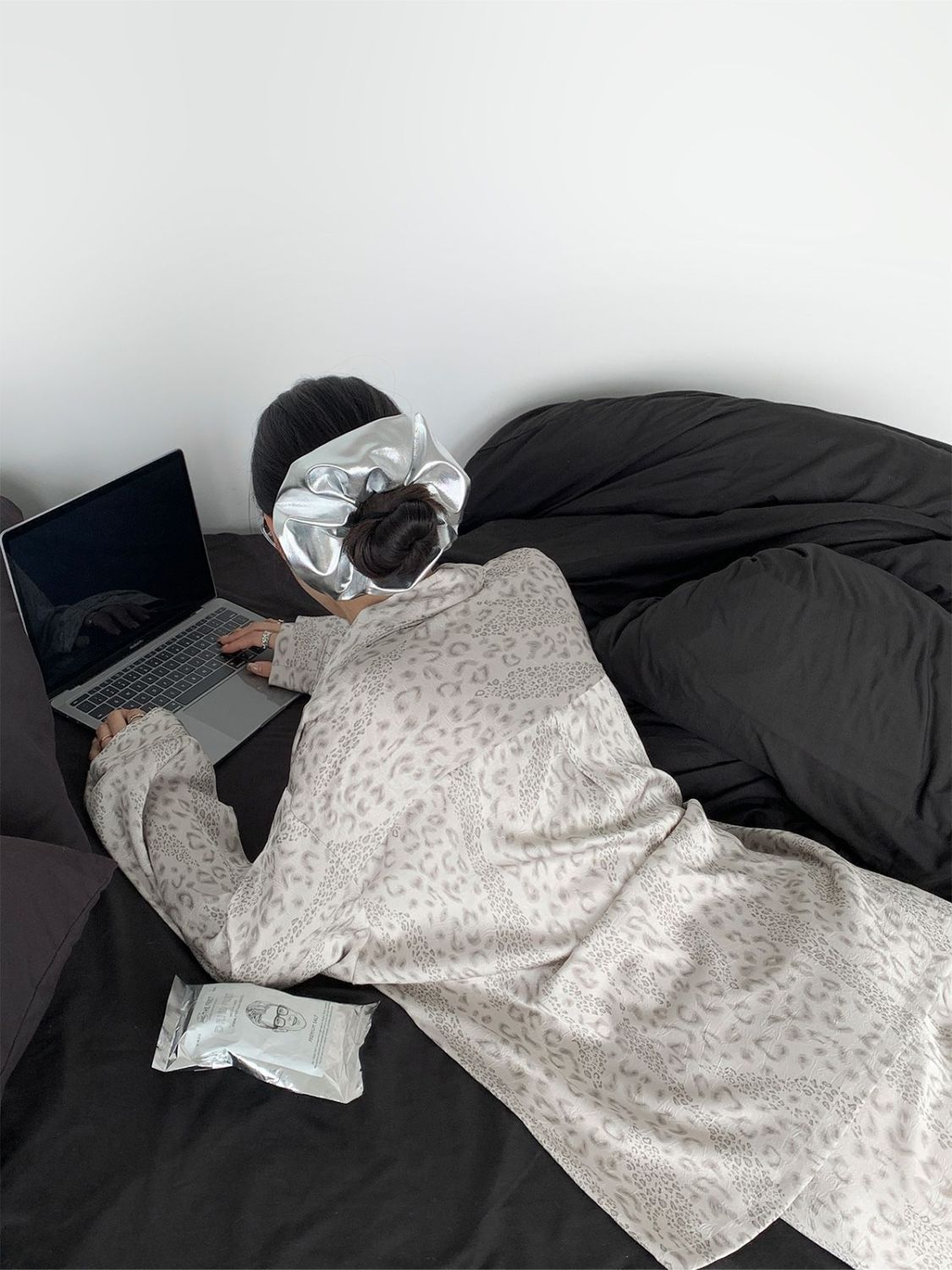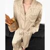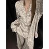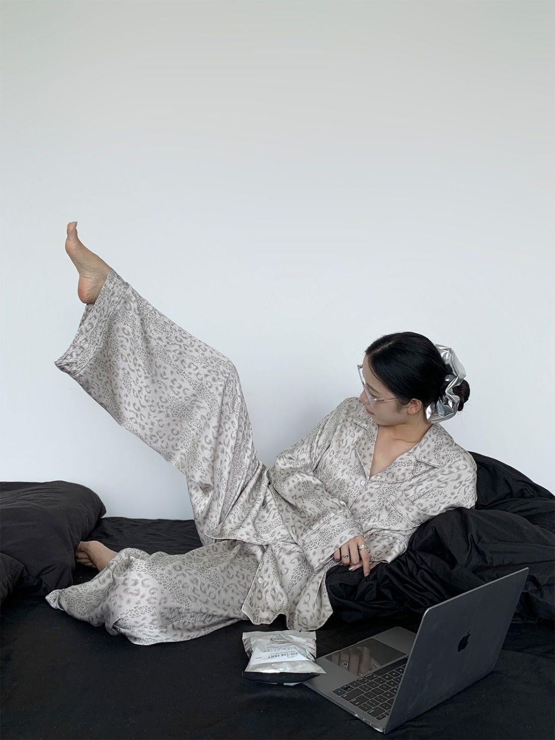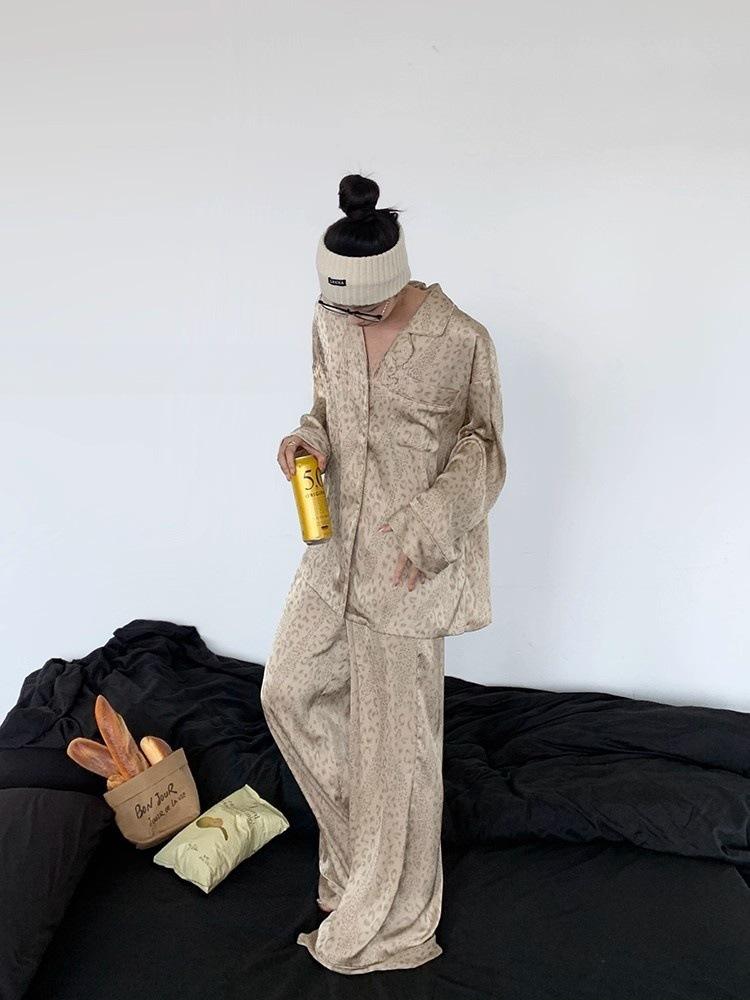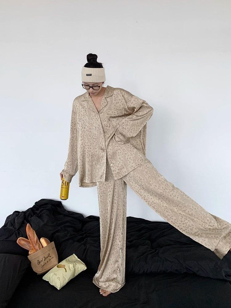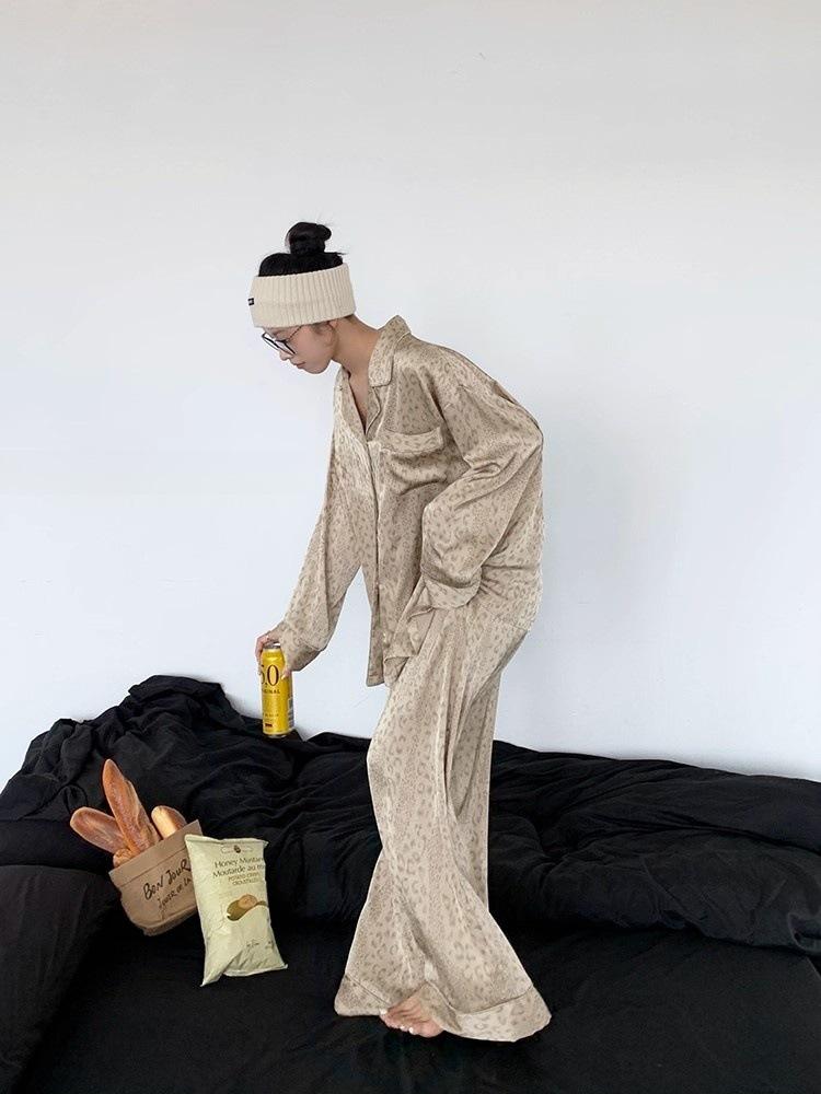 Pijama de seda de hielo con diseño de leopardo estilo coreano para mujer, nuevo para principios de otoño, manga larga, pantalón largo, conjunto para estar en casa ins