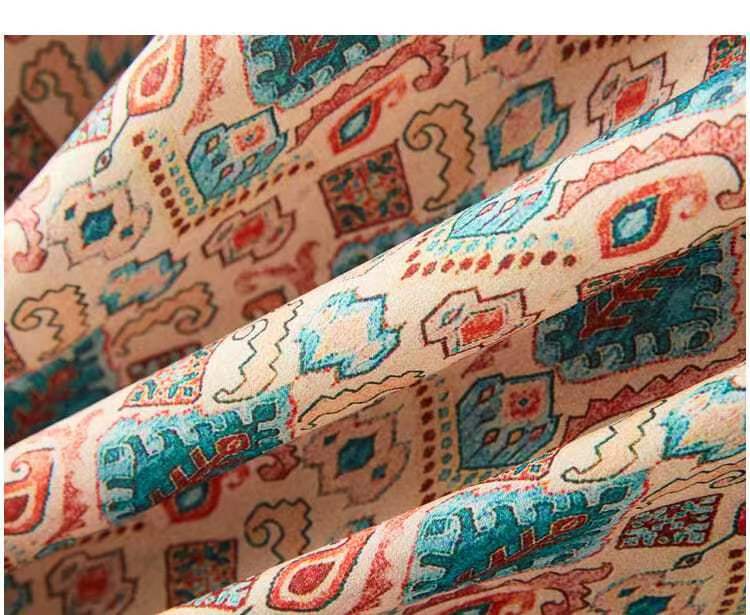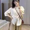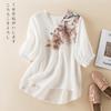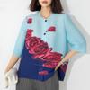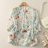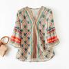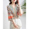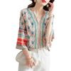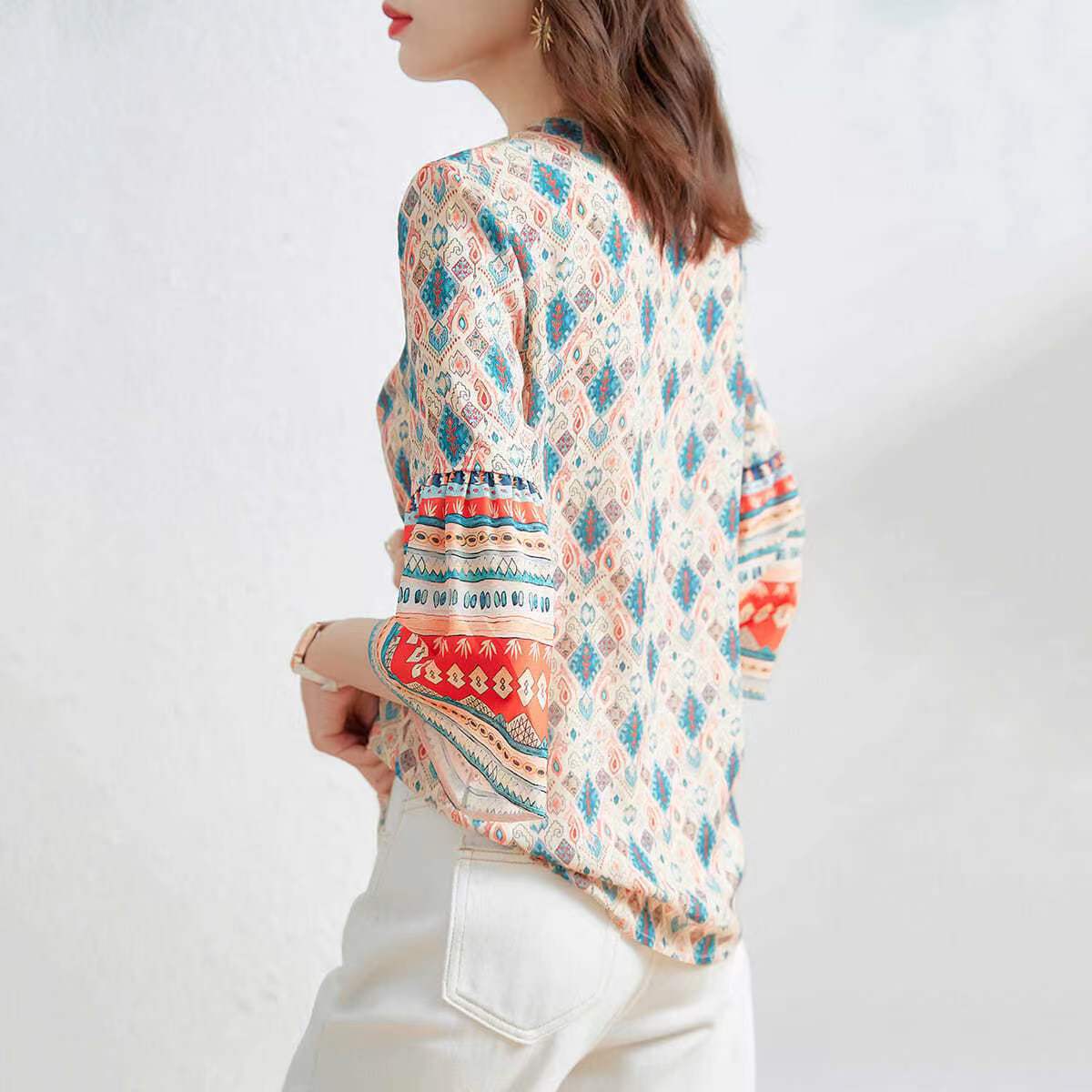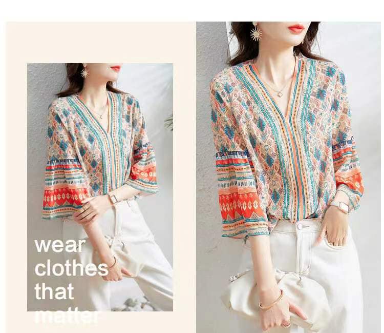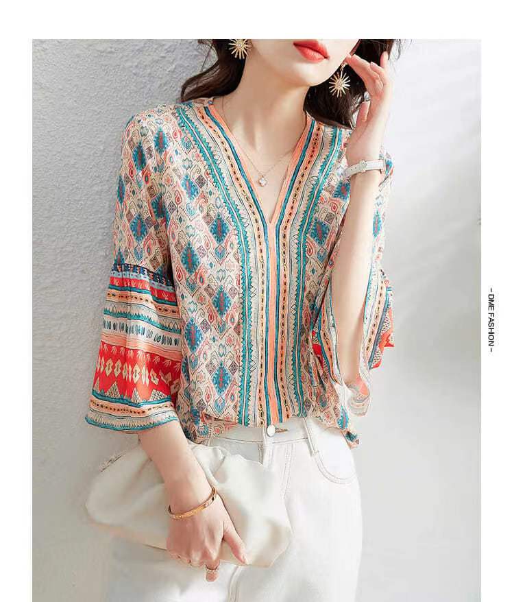 Camisa sencilla de chifón estampado para ir al trabajo 2023 Verano Nueva Cuello en V Suelta Manga trompeta Siete mangas Top de mujer