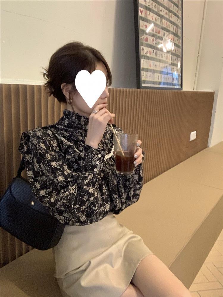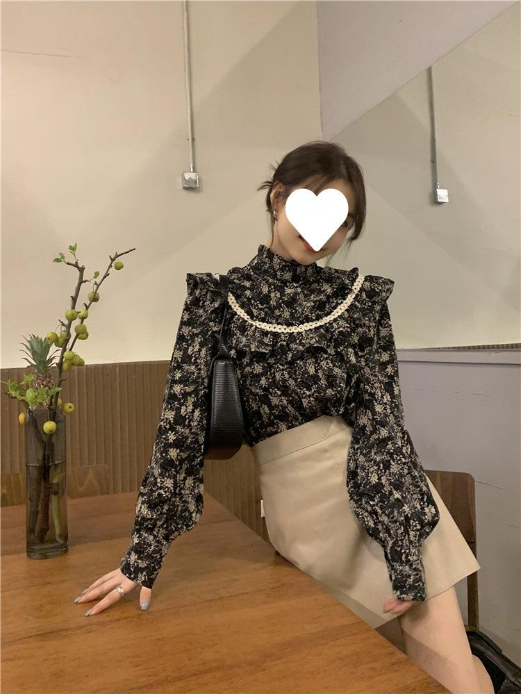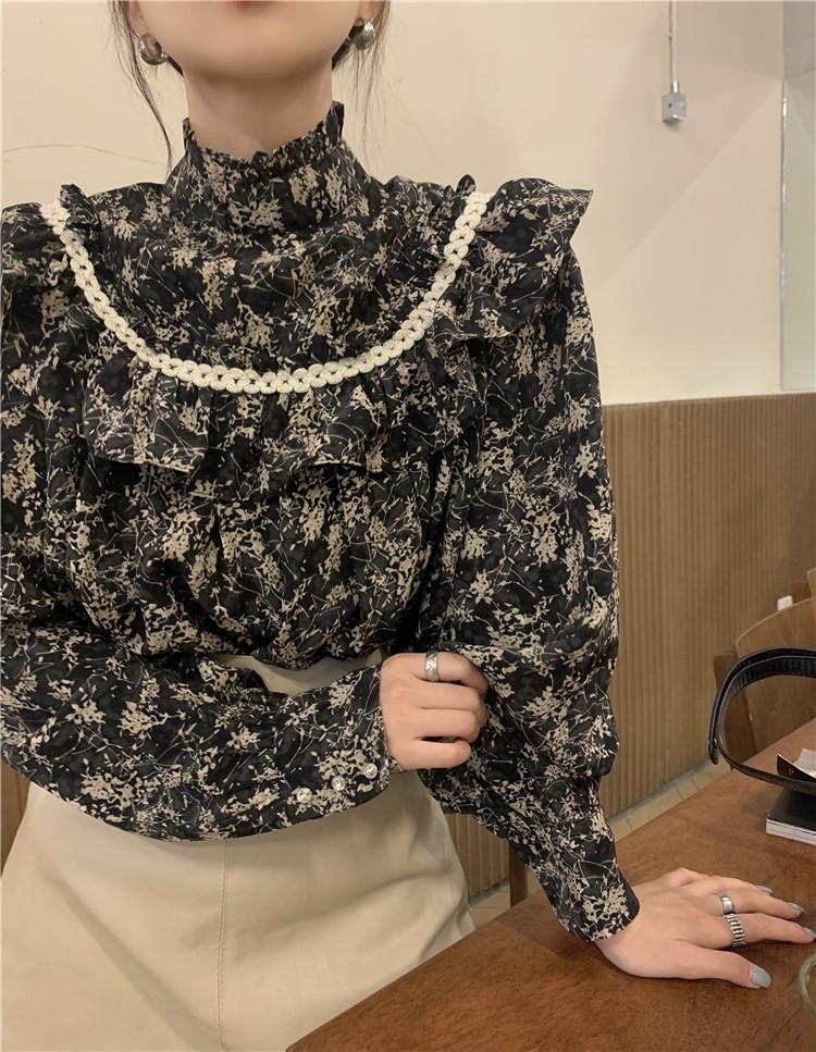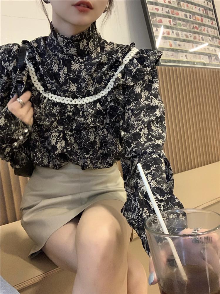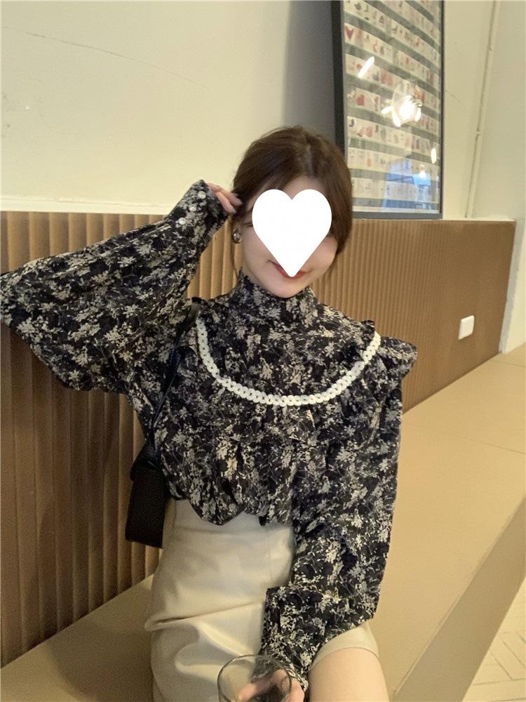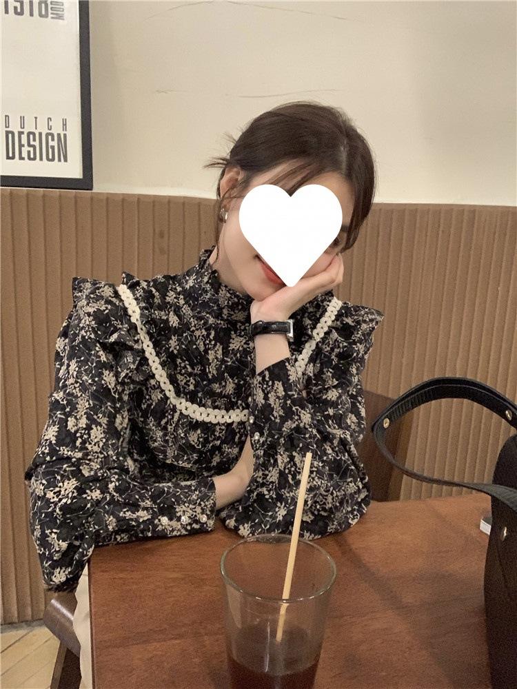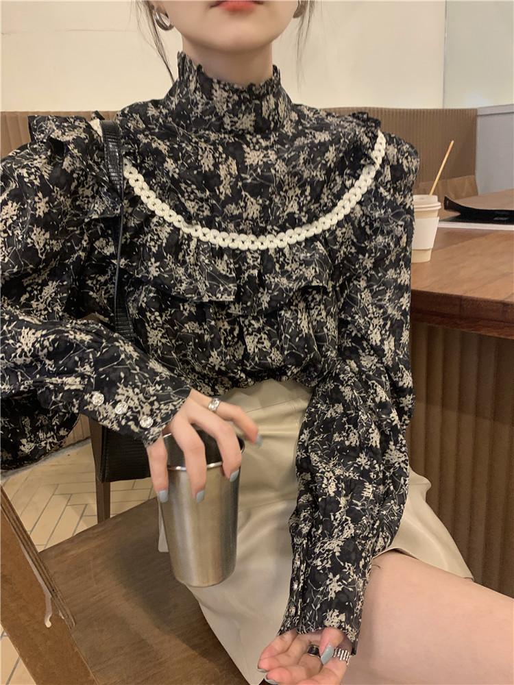 Camisa floral retro estilo francés para mujer, diseño de nicho con sentido del diseño para primavera y otoño, cuello alto, camisa con pespuntes de oreja de madera, top chic a la moda