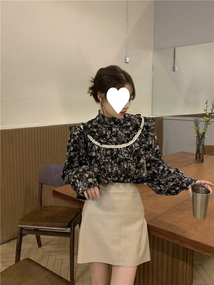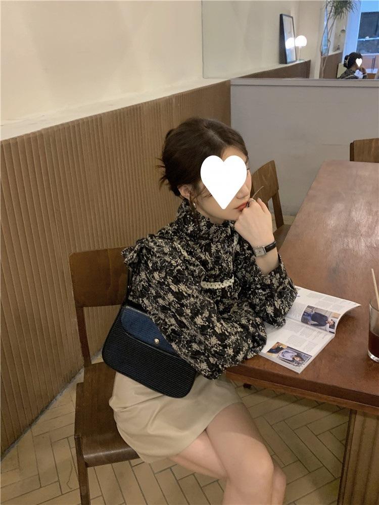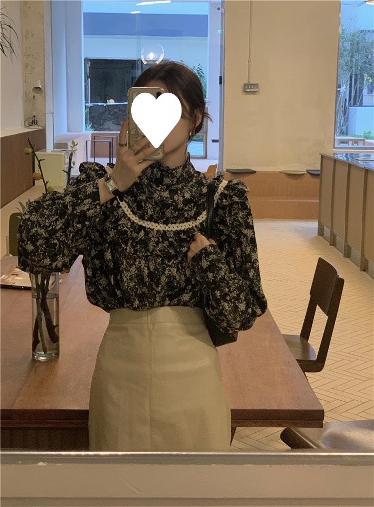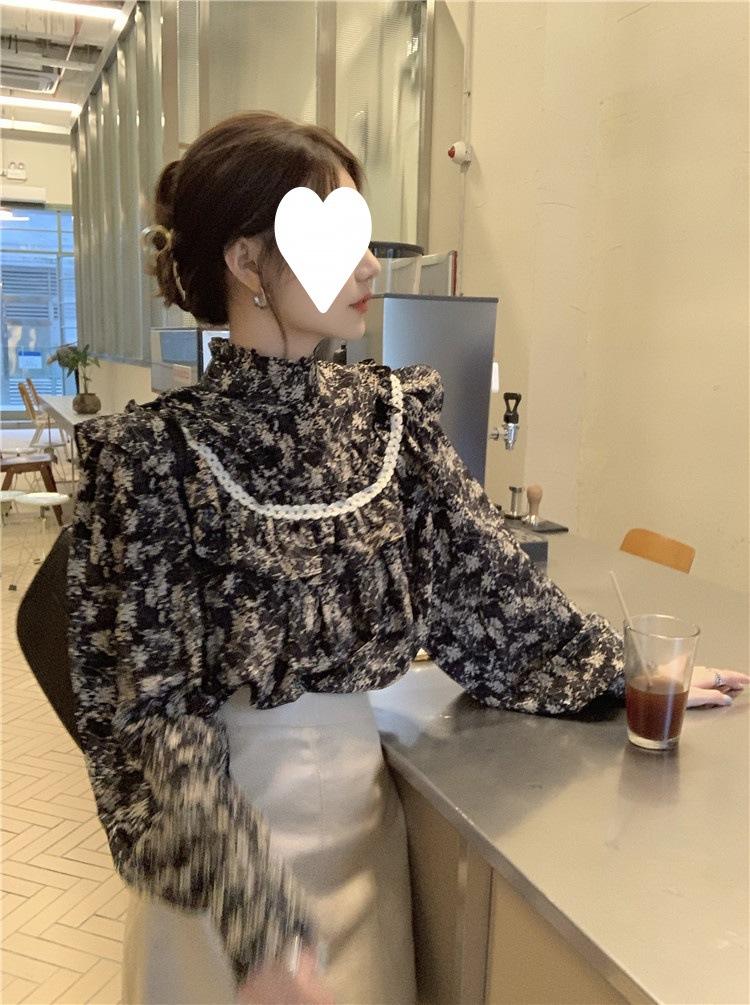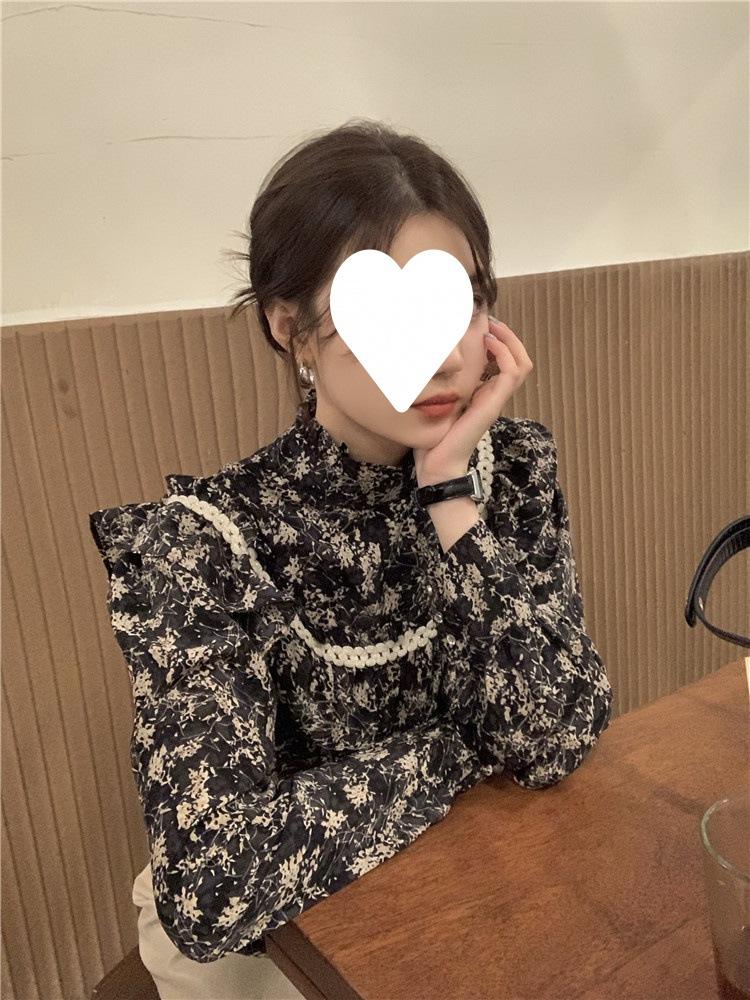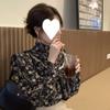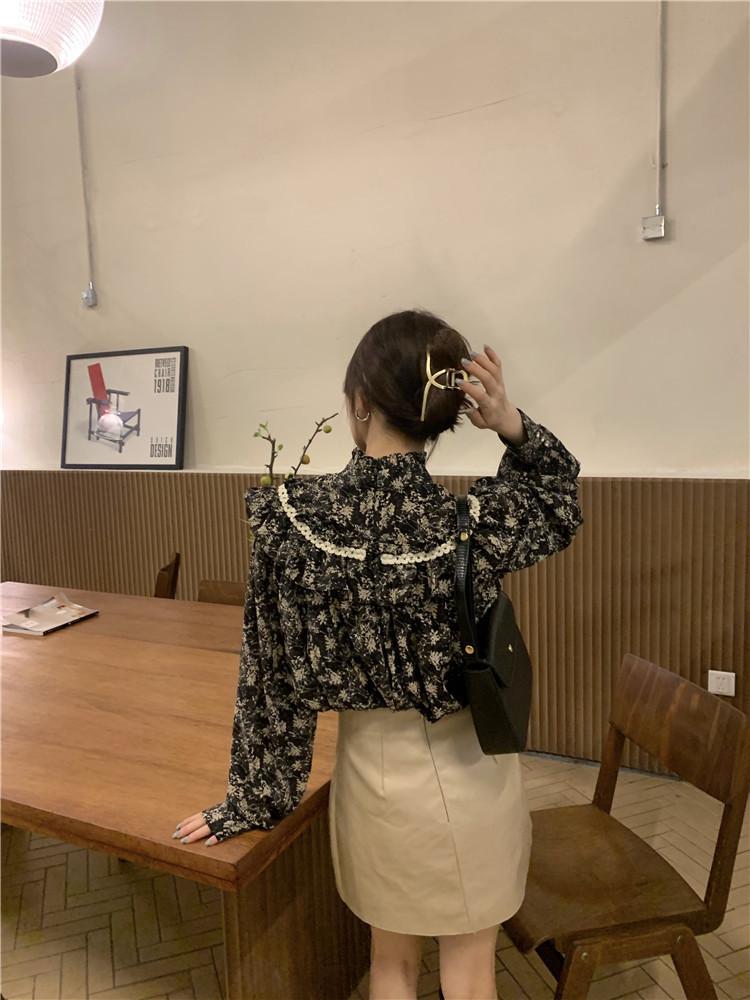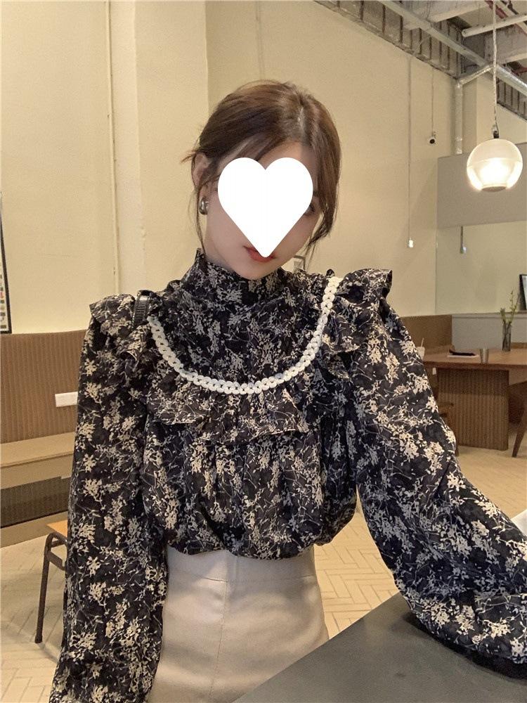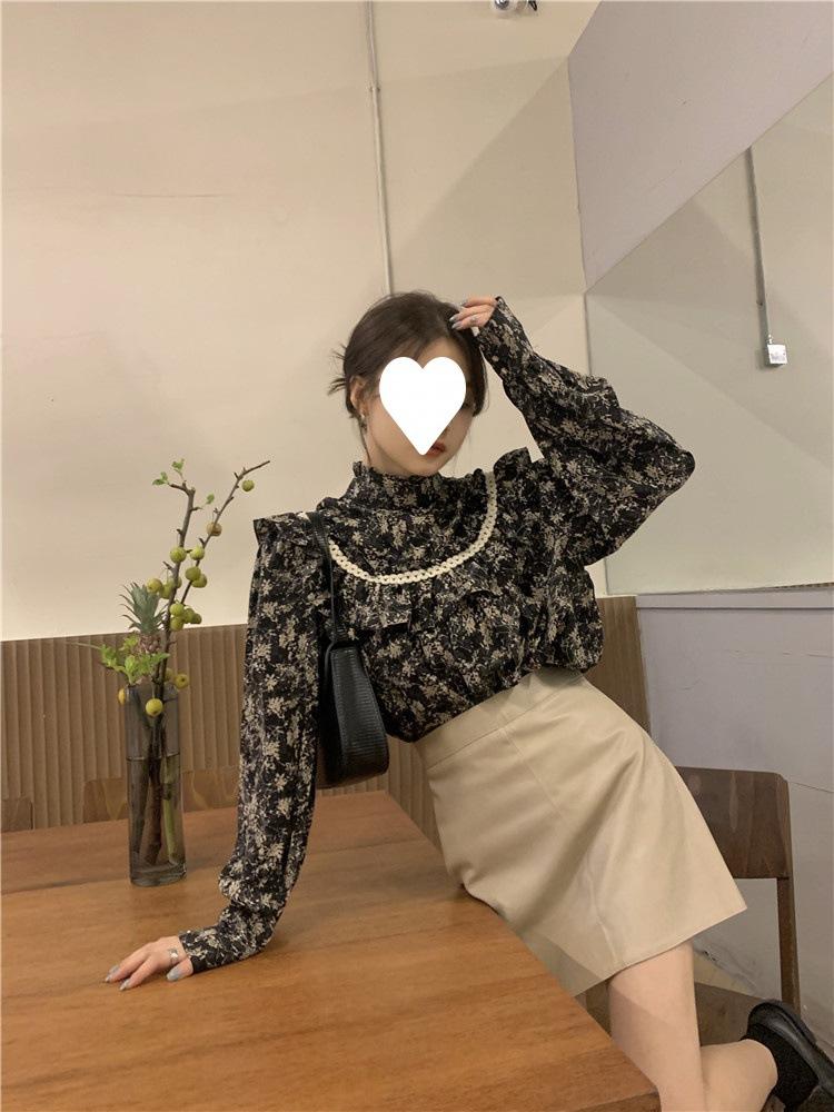 Camisa floral retro estilo francés para mujer, diseño de nicho con sentido del diseño para primavera y otoño, cuello alto, camisa con pespuntes de oreja de madera, top chic a la moda