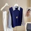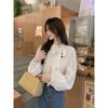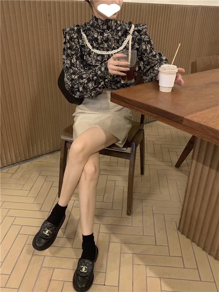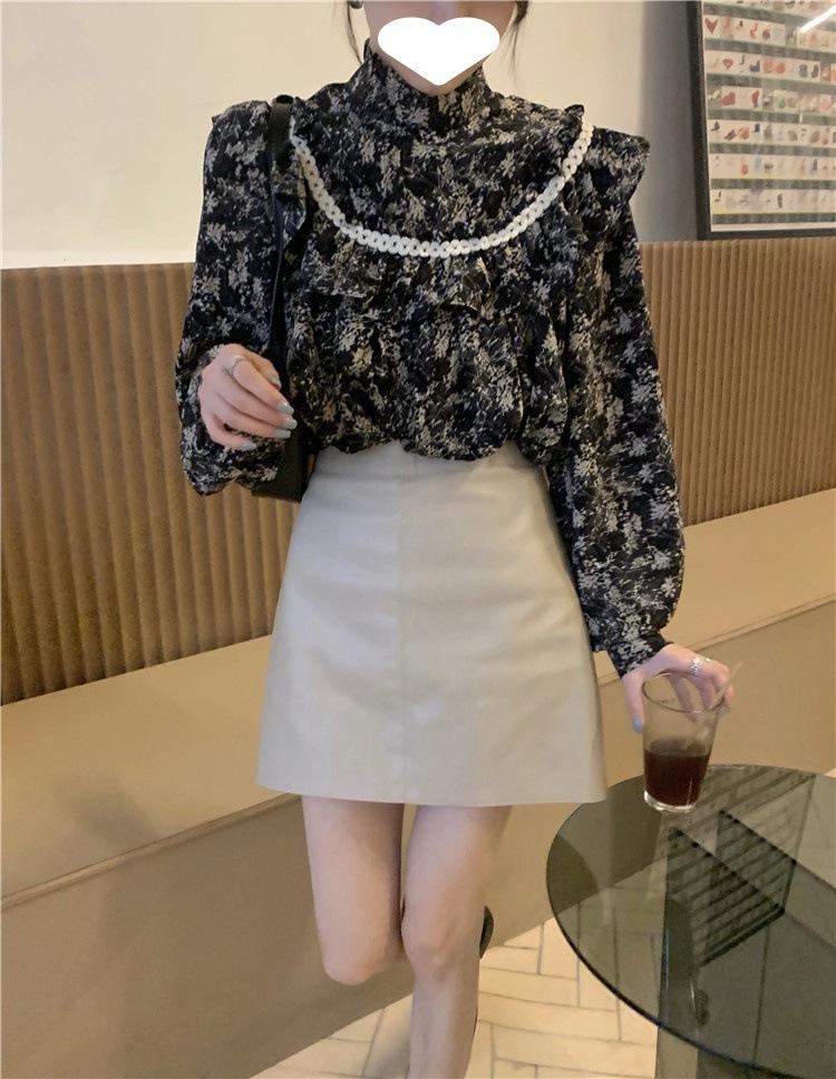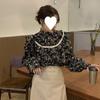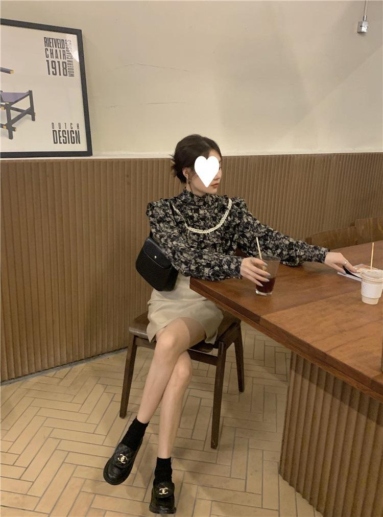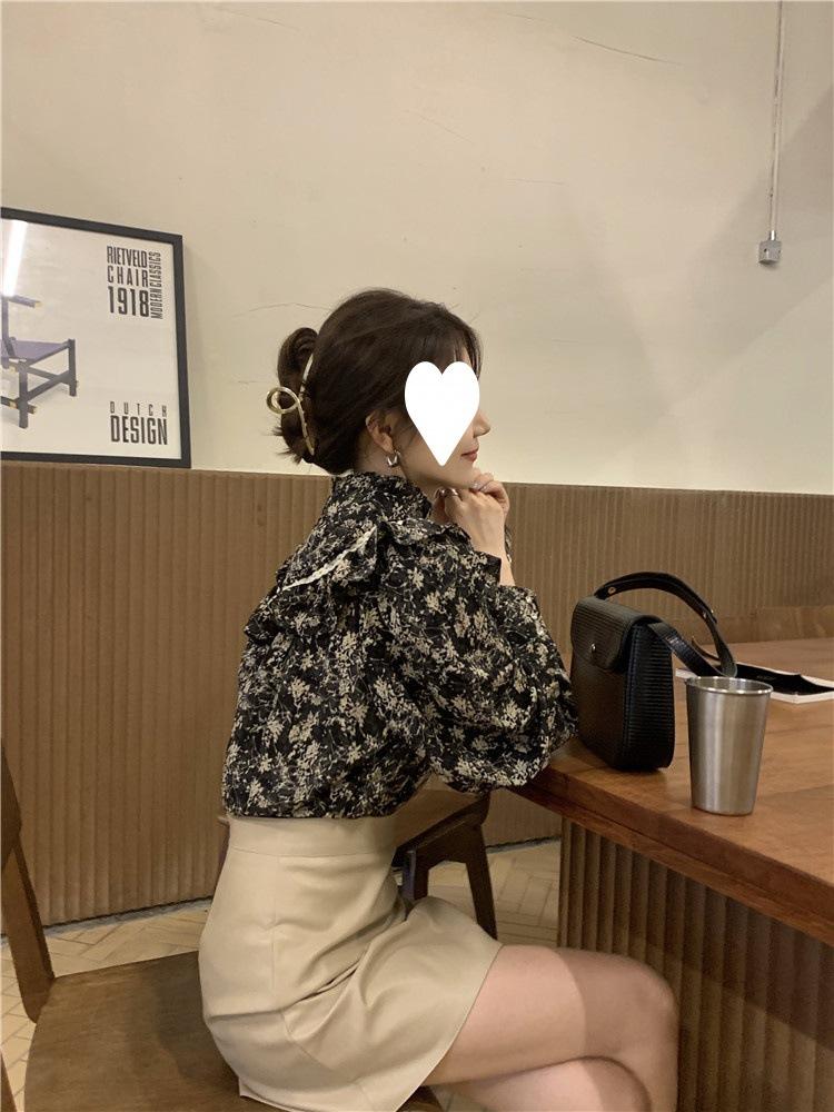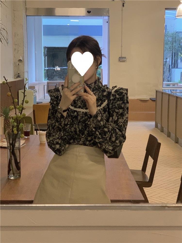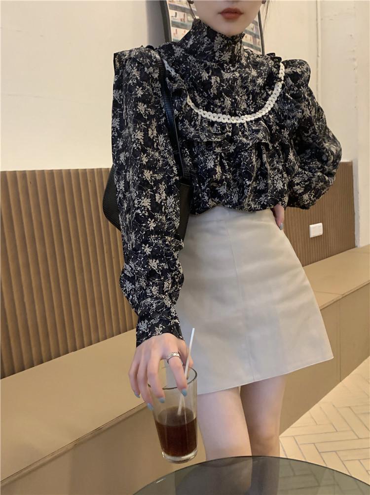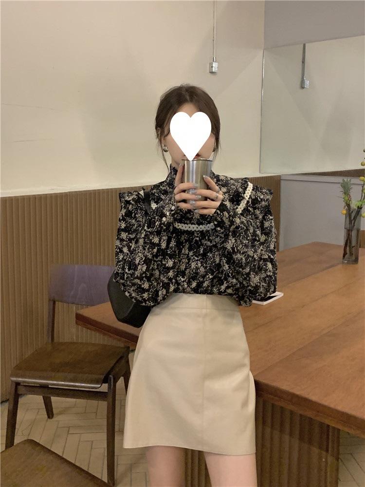 Camisa floral retro estilo francés para mujer, diseño de nicho con sentido del diseño para primavera y otoño, cuello alto, camisa con pespuntes de oreja de madera, top chic a la moda