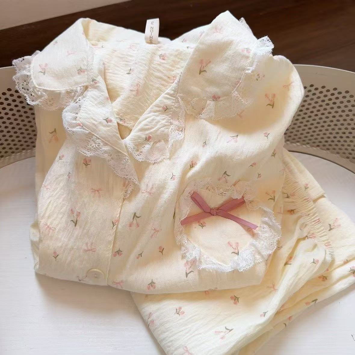Pijamas de Primavera y Otoño para Mujer Nuevo Algodón Nube Manga Larga Solapa Pequeña Encaje Pantalones Manga Larga Traje de Ropa Casual para el Hogar