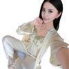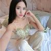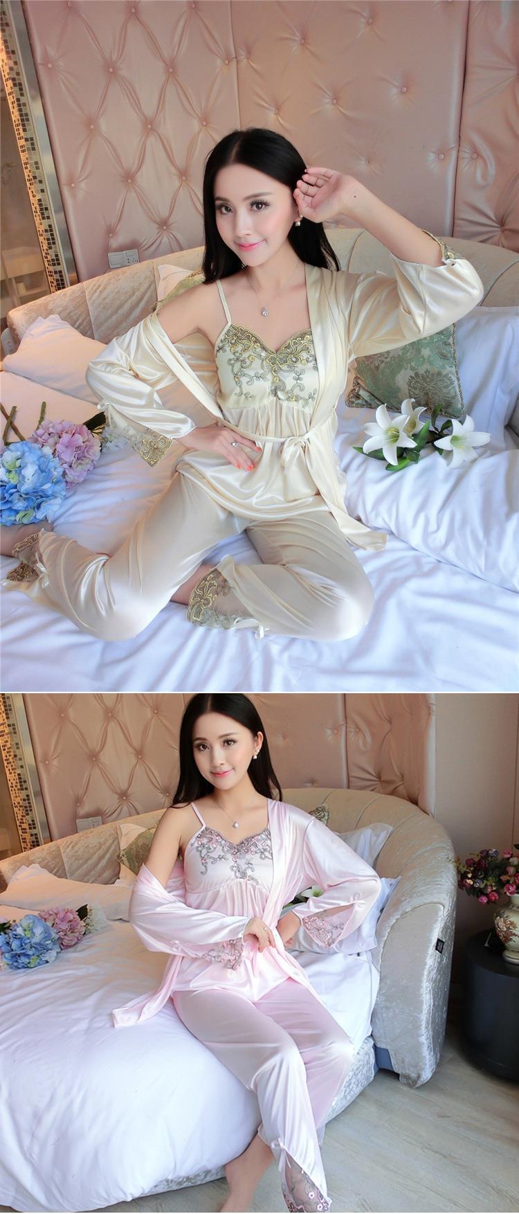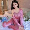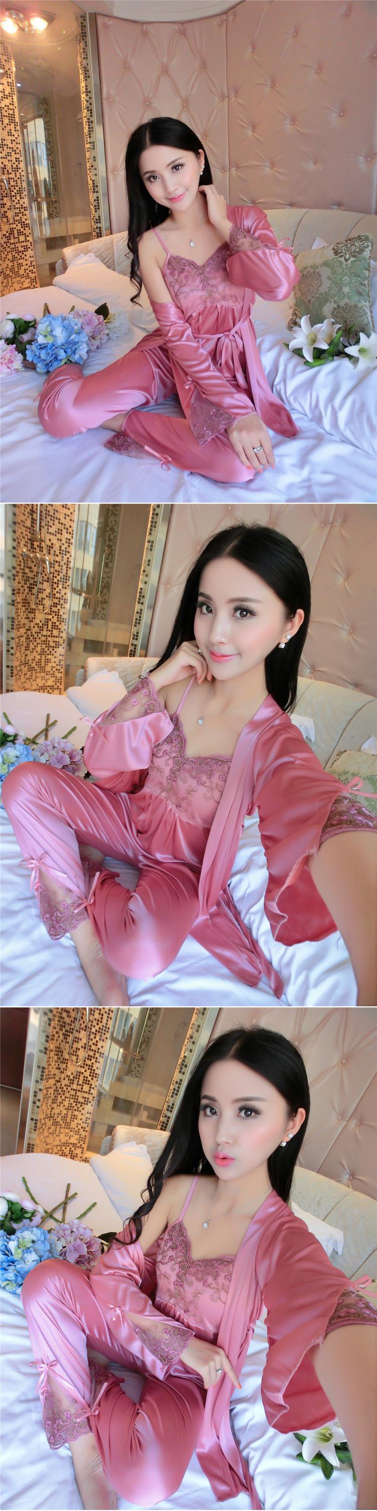 Conjunto de Tres Piezas Camisola Sexy de Encaje de Seda de Hielo de Manga Larga de Primavera y Otoño Transfronterizo Europeo Ropa de Casa Pijama Envío Directo