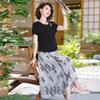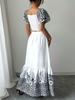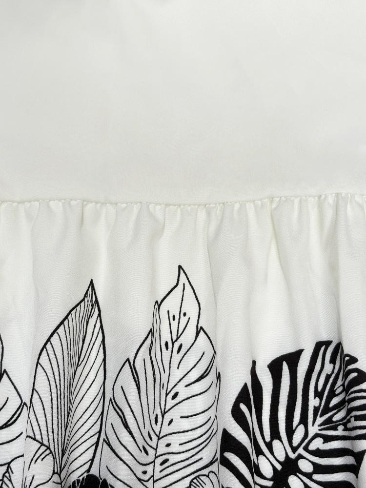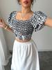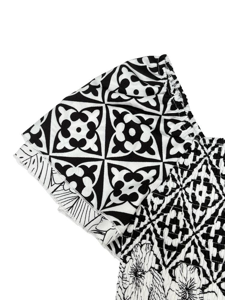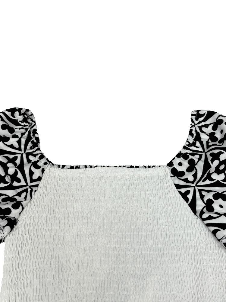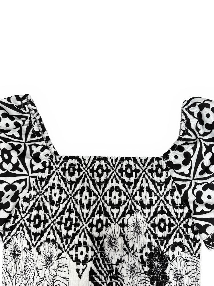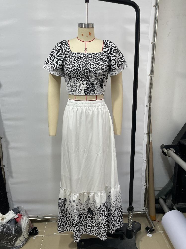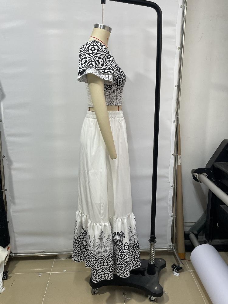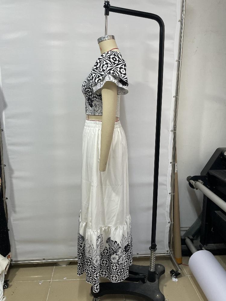Este conjunto de verano de dos piezas para mujer está lleno de vibras vacacionales.. La parte superior presenta un escote cuadrado y se combina con mangas abullonadas, lo cual es retro y chic.. Toda la parte superior está cubierta con estampados en blanco y negro, siendo exquisita y llamativa. La parte de abajo es una falda midi con cintura elástica, que es fácil de poner y quitar y se ajusta bien al cuerpo.. El dobladillo de la falda es ancho y fluido, y la parte inferior también está decorada con estampados en blanco y negro que hacen eco a la parte superior, haciendo que el estilo general sea unificado y coordinado.. La tela es transpirable y cómoda, adecuada para usar en verano.. Ya sea que estés de vacaciones en la playa o saliendo para actividades diarias, puede crear un look romántico y a la moda para ti.