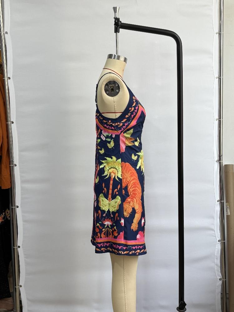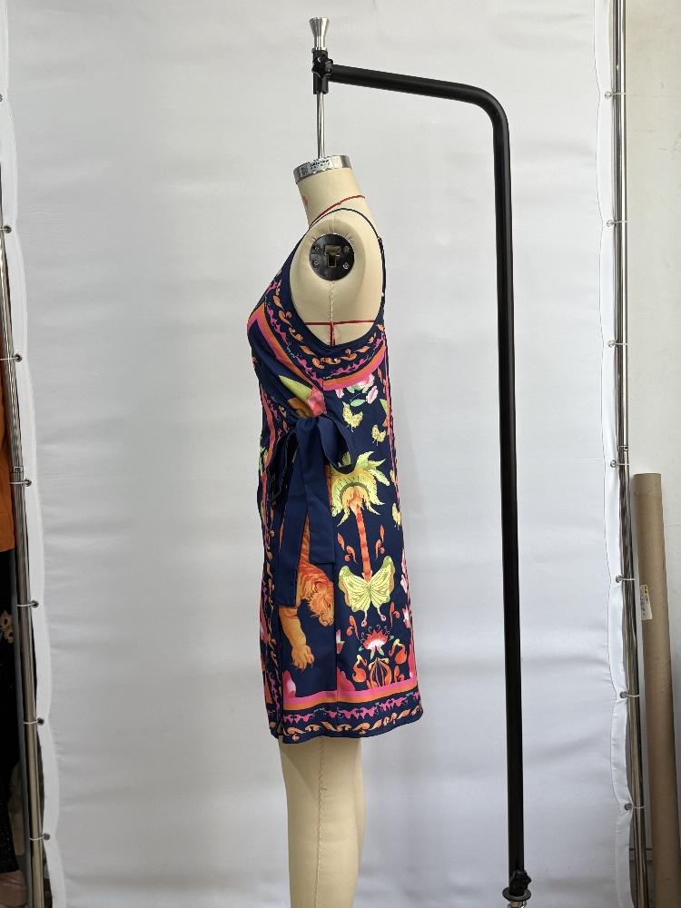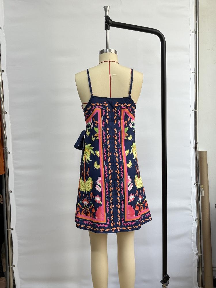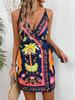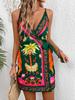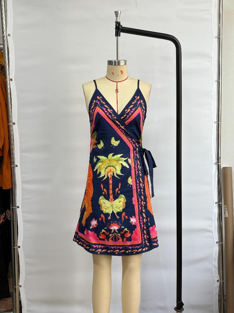 Este vestido de verano para mujer es una mezcla perfecta de encanto bohemio y estilo chic. Con un profundo escote en V y tirantes espagueti, exuda un ambiente sexy y seductor.. El vestido está adornado con estampados vibrantes de inspiración tropical, incluyendo palmeras y mariposas, aportando una sensación viva y exótica.. Con un diseño envolvente y un lazo en la cintura, se puede ajustar para favorecer tu figura perfectamente.. Disponible en múltiples combinaciones de colores llamativas, este minivestido es ideal para vacaciones en la playa, fiestas de verano o salidas informales, asegurando que destaques con su look único y a la moda.