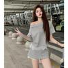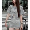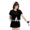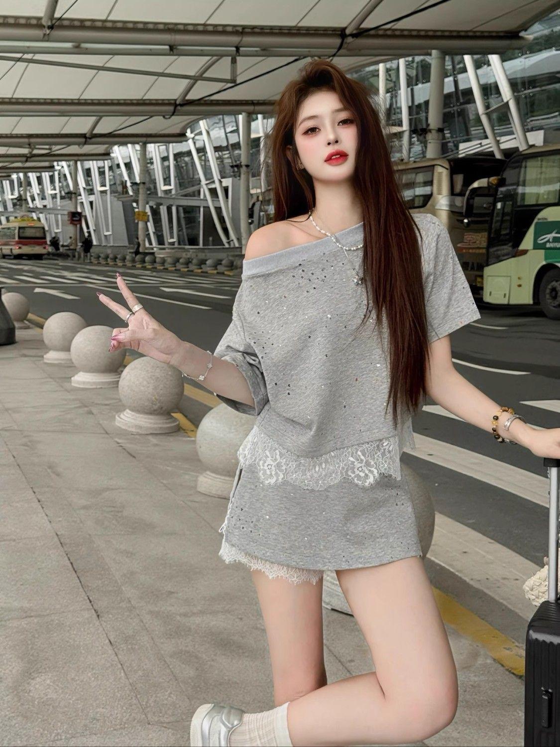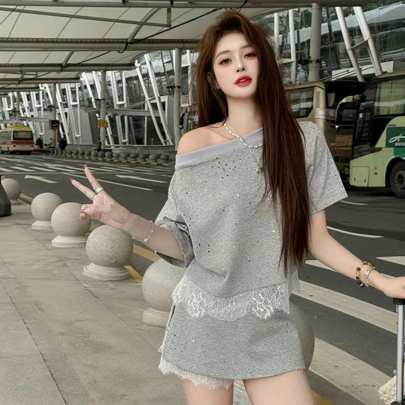 Camiseta de Encaje con Diseño Coreano y Manga Corta para Mujer 2025 Verano Nuevo Falda Slim de Cintura Alta Conjunto de Dos Piezas