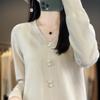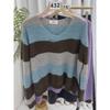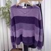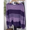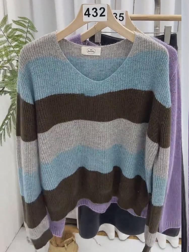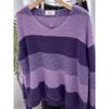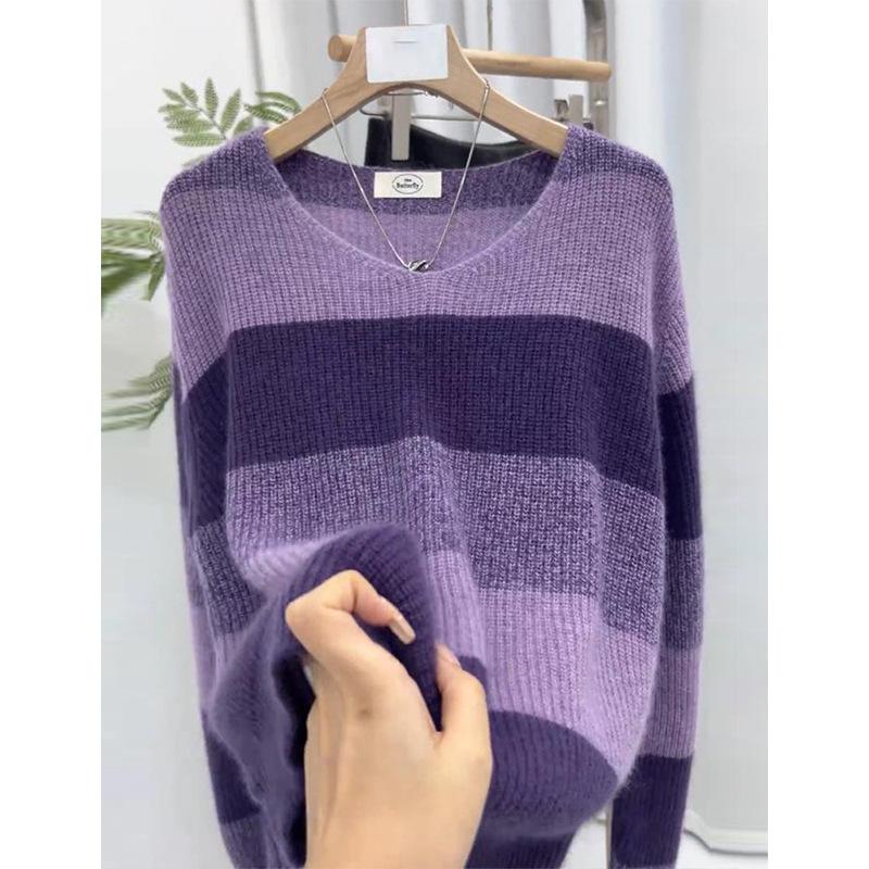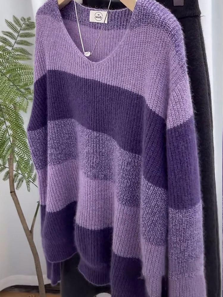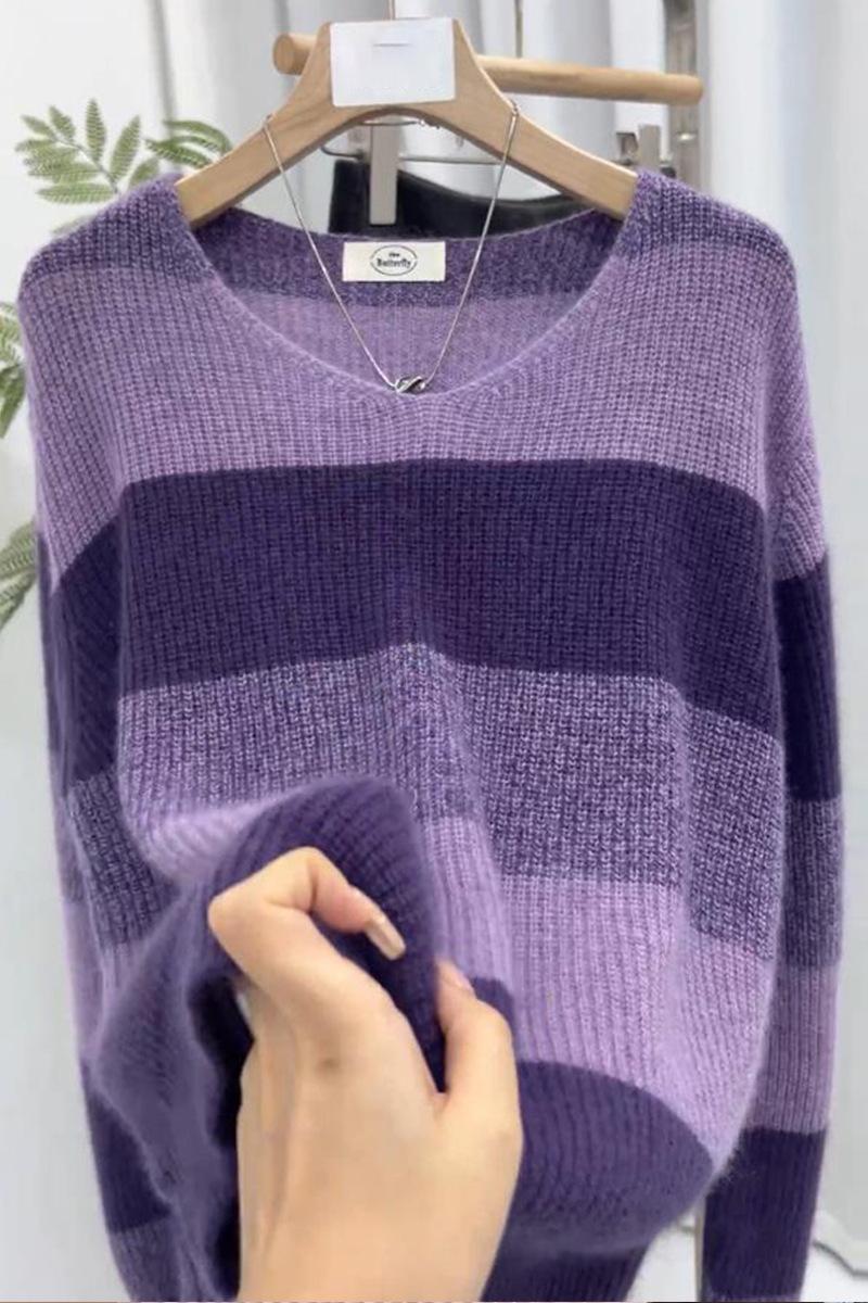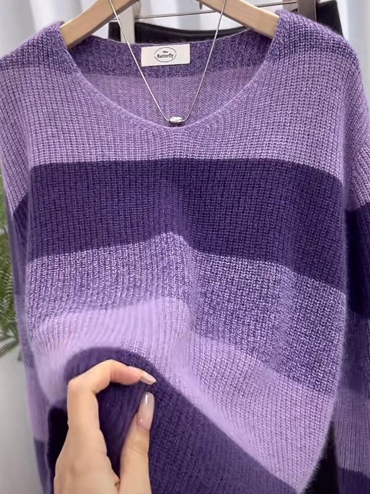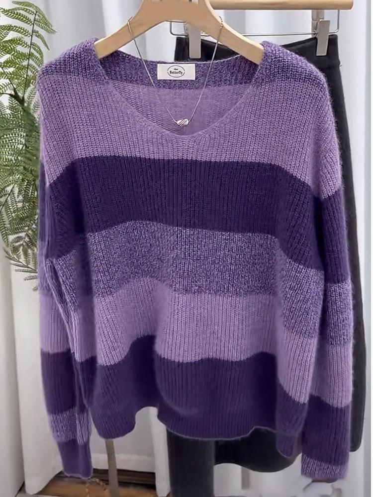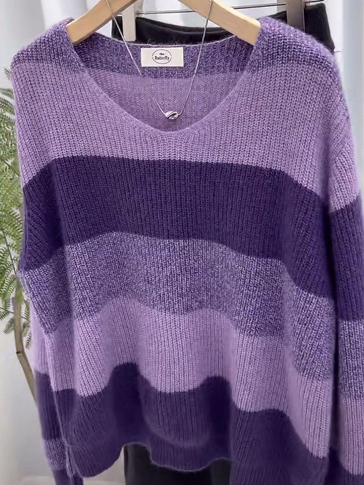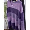 Suéter de Rayas Moradas Suéter de Otoño e Invierno para Mujer Abrigo con Cuello en V 2024 Nuevo Top de Estilización Lazy de Alta Gama
