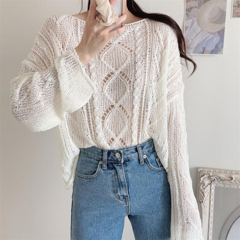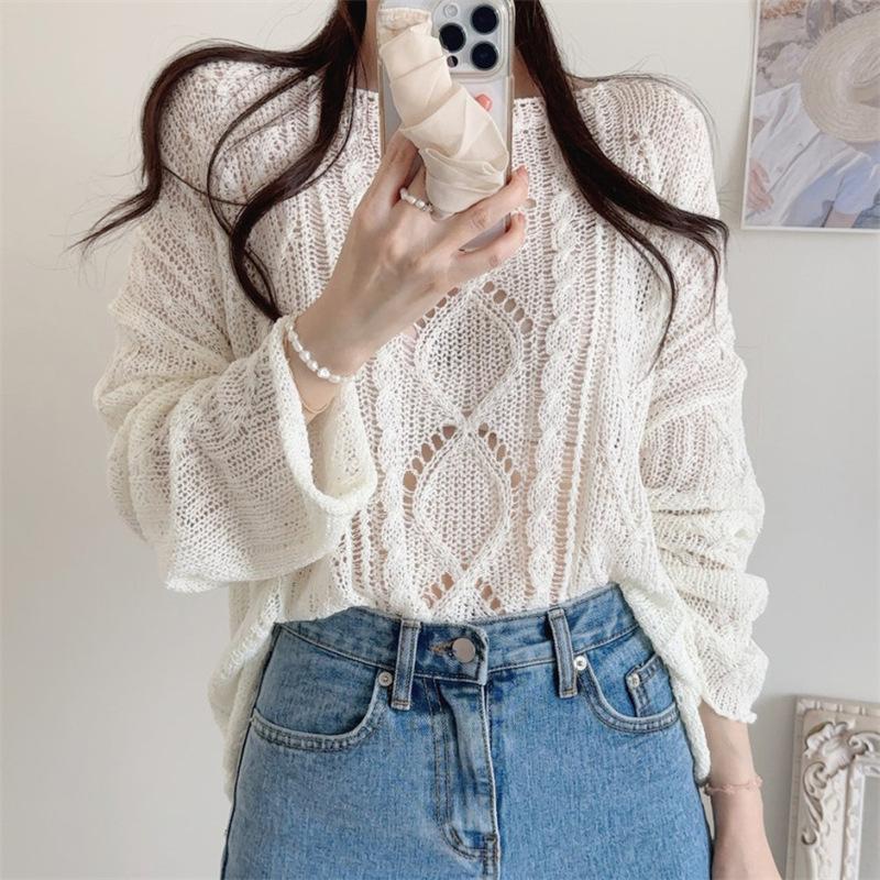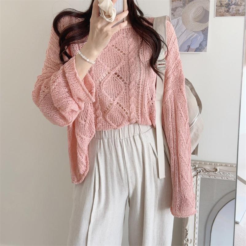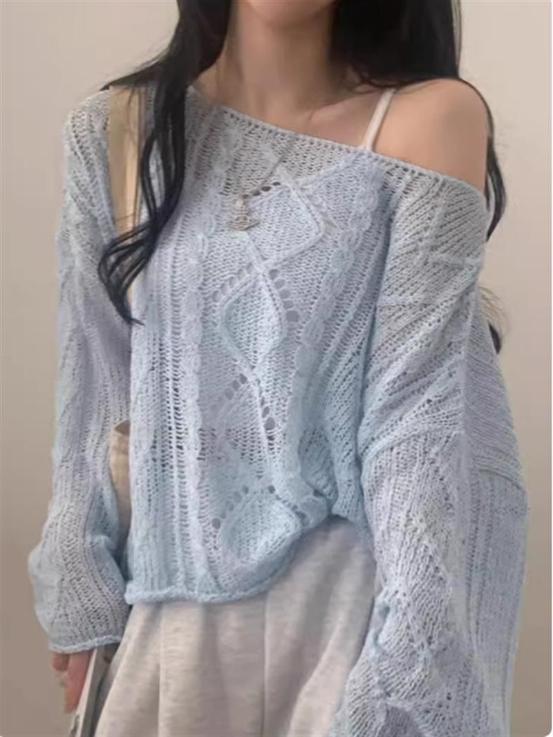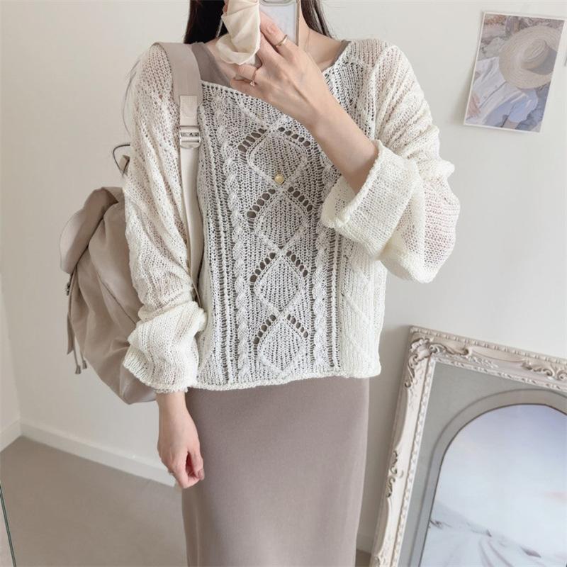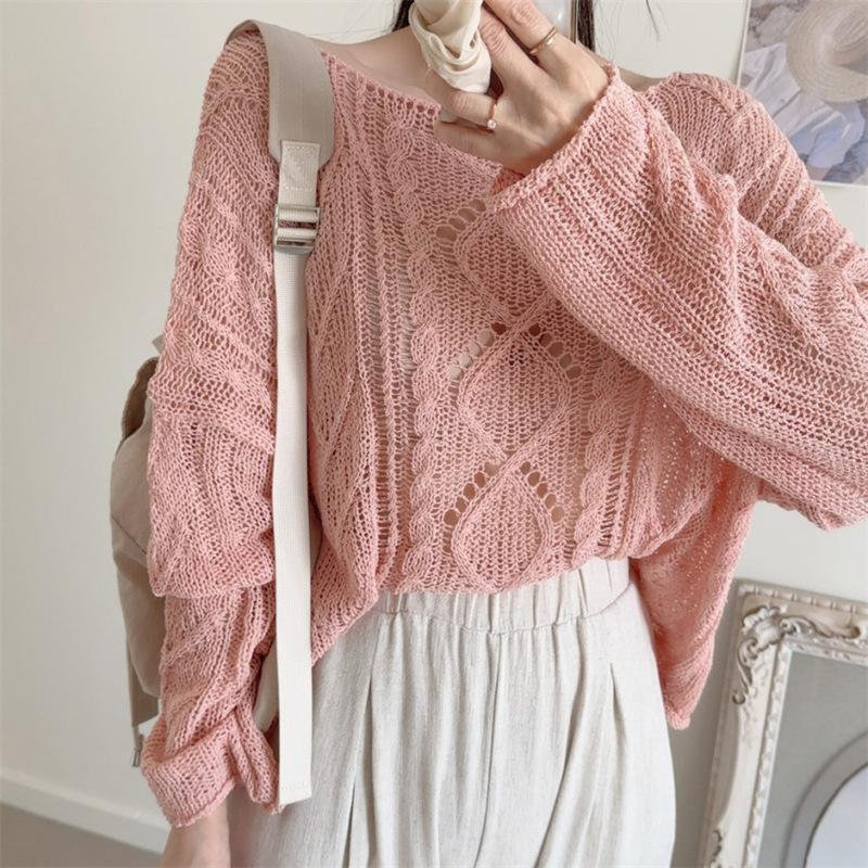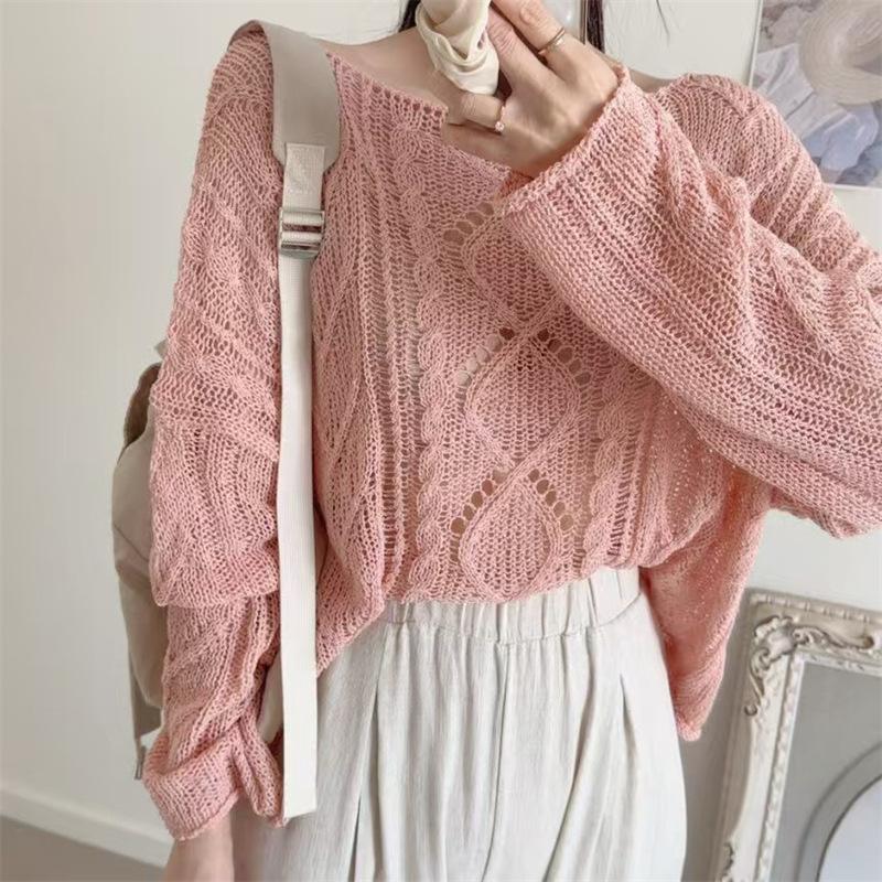 Cárdigan tejido calado estilo coreano para protección solar para mujer, puro deseo, jersey de un hombro, suéter de manga larga, top delgado