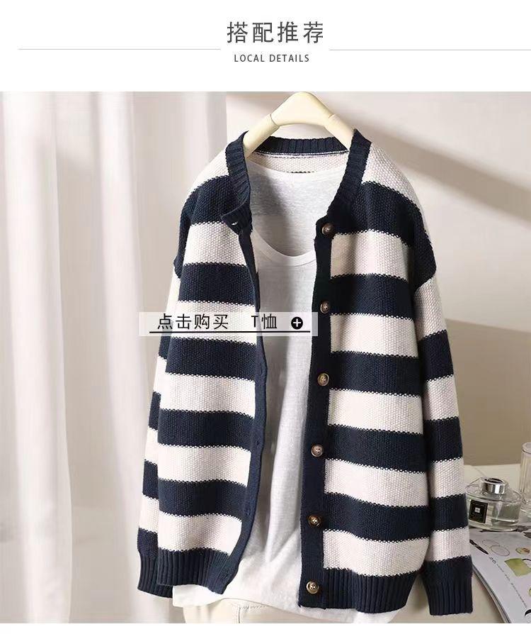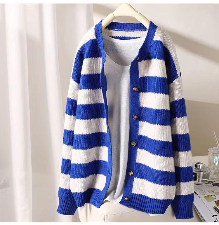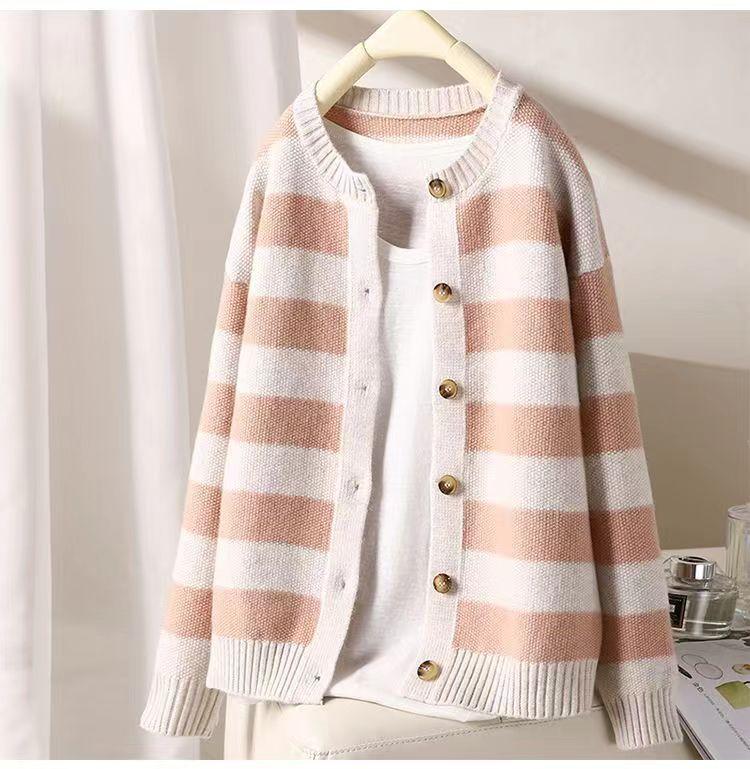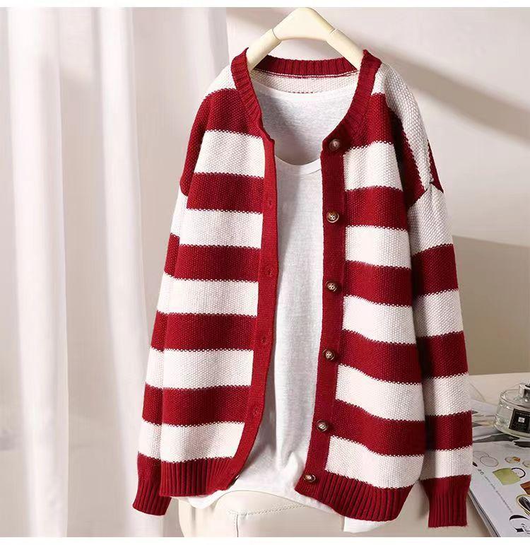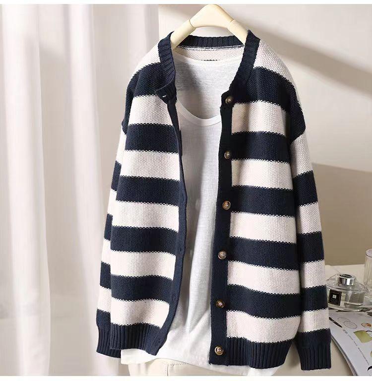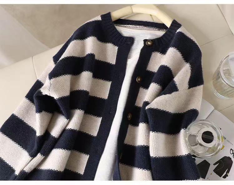 Otoño 2022 Nuevo abrigo de punto suelto de cuello redondo a juego de colores a rayas para mujer, cárdigan suéter artístico versátil que reduce la edad