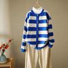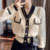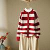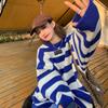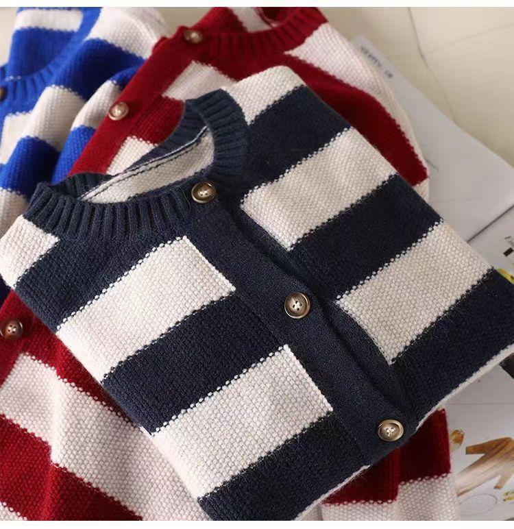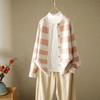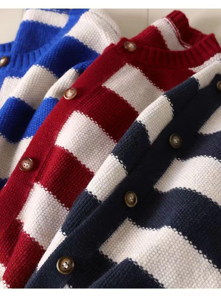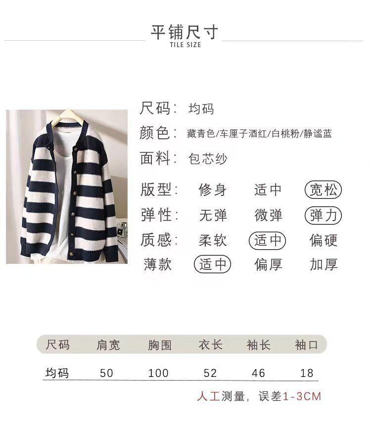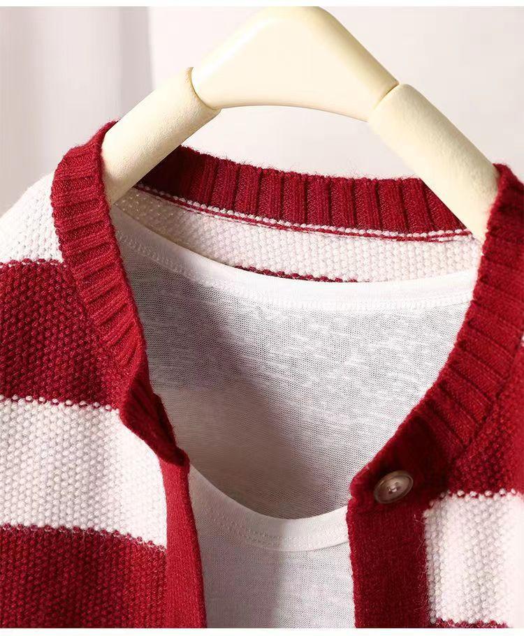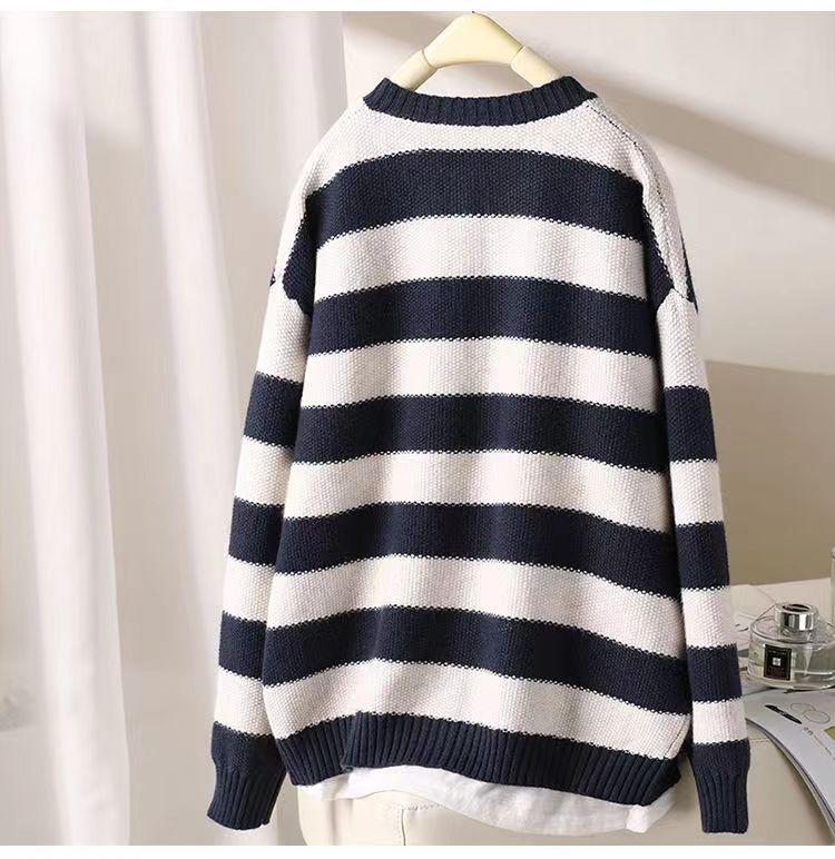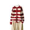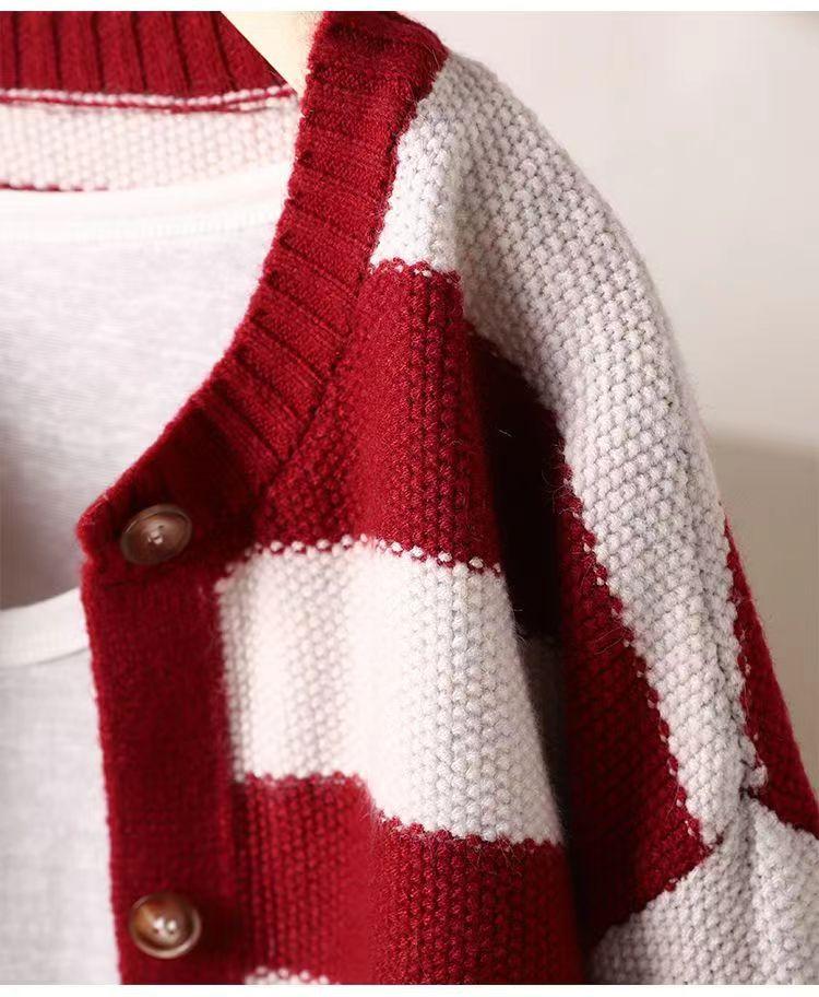 Otoño 2022 Nuevo abrigo de punto suelto de cuello redondo a juego de colores a rayas para mujer, cárdigan suéter artístico versátil que reduce la edad