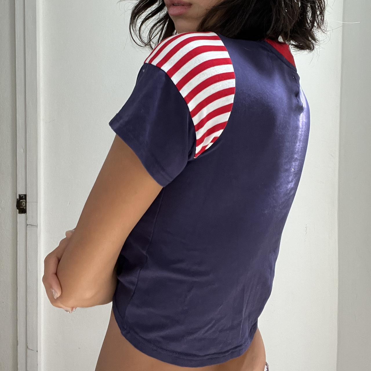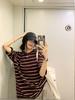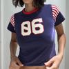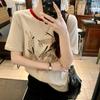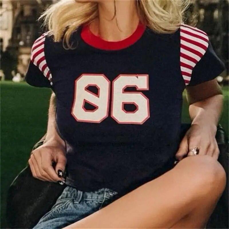 2025 Verano Nuevo Estilo Americano Urbano Estampado Bloque de Color Camiseta Manga Corta para Mujer Retro Cuello Redondo Casual Versátil Top